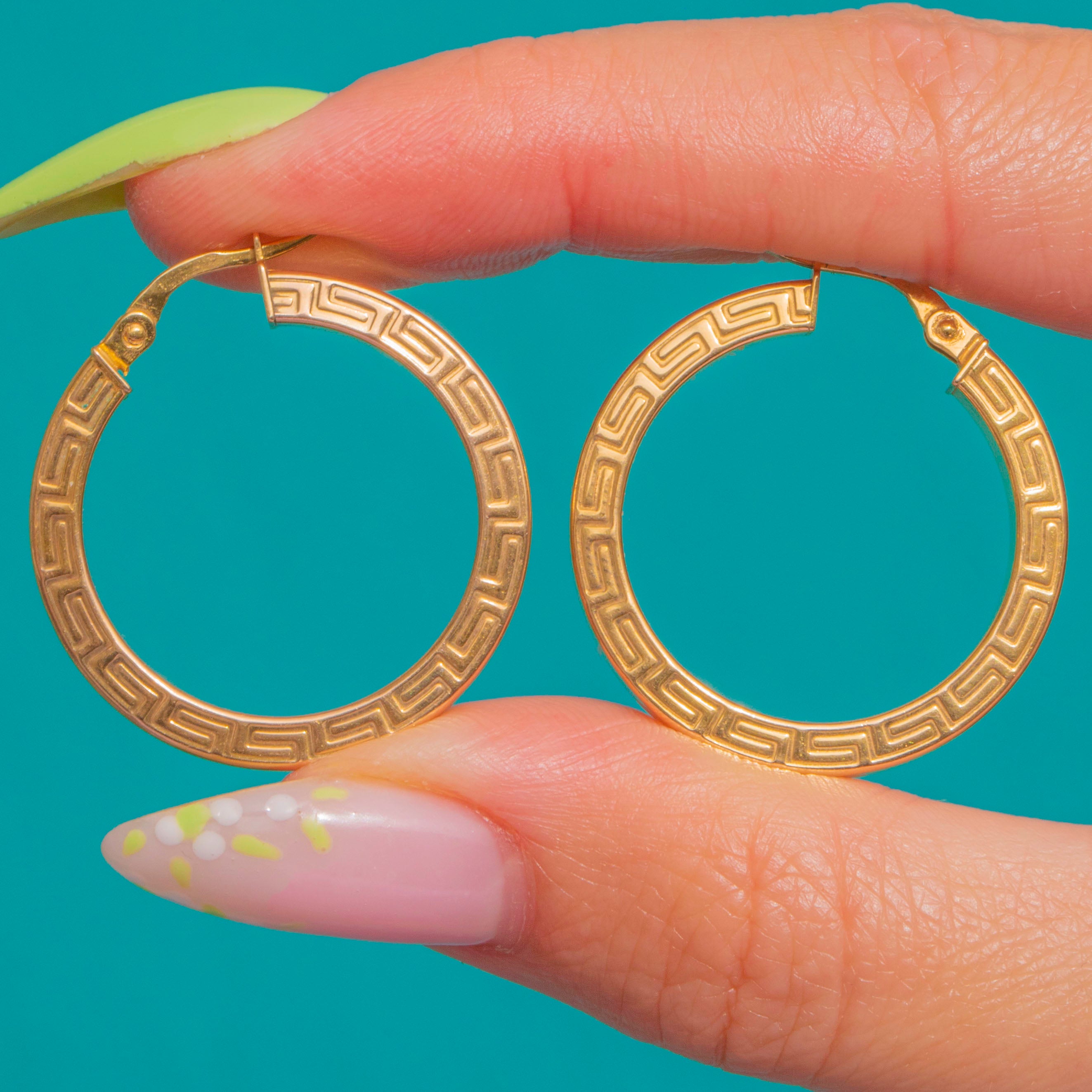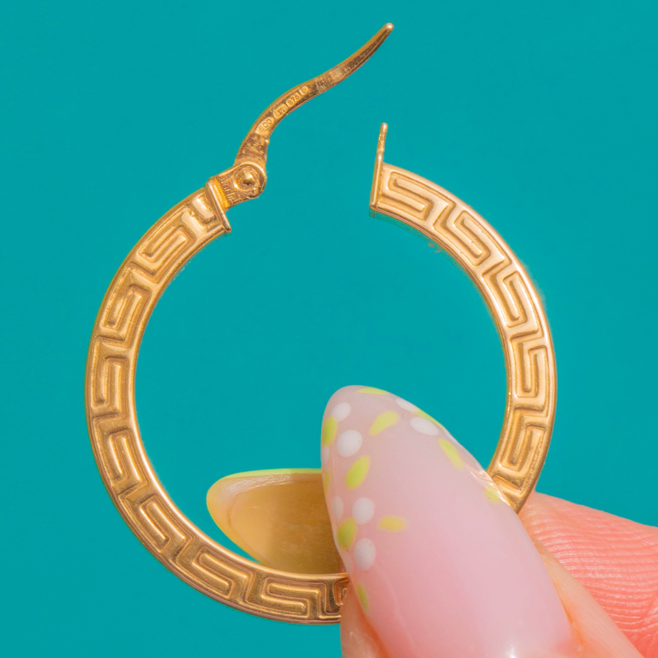 Chunky Bright Yellow 9ct Gold Greek Key Hoop Earrings
