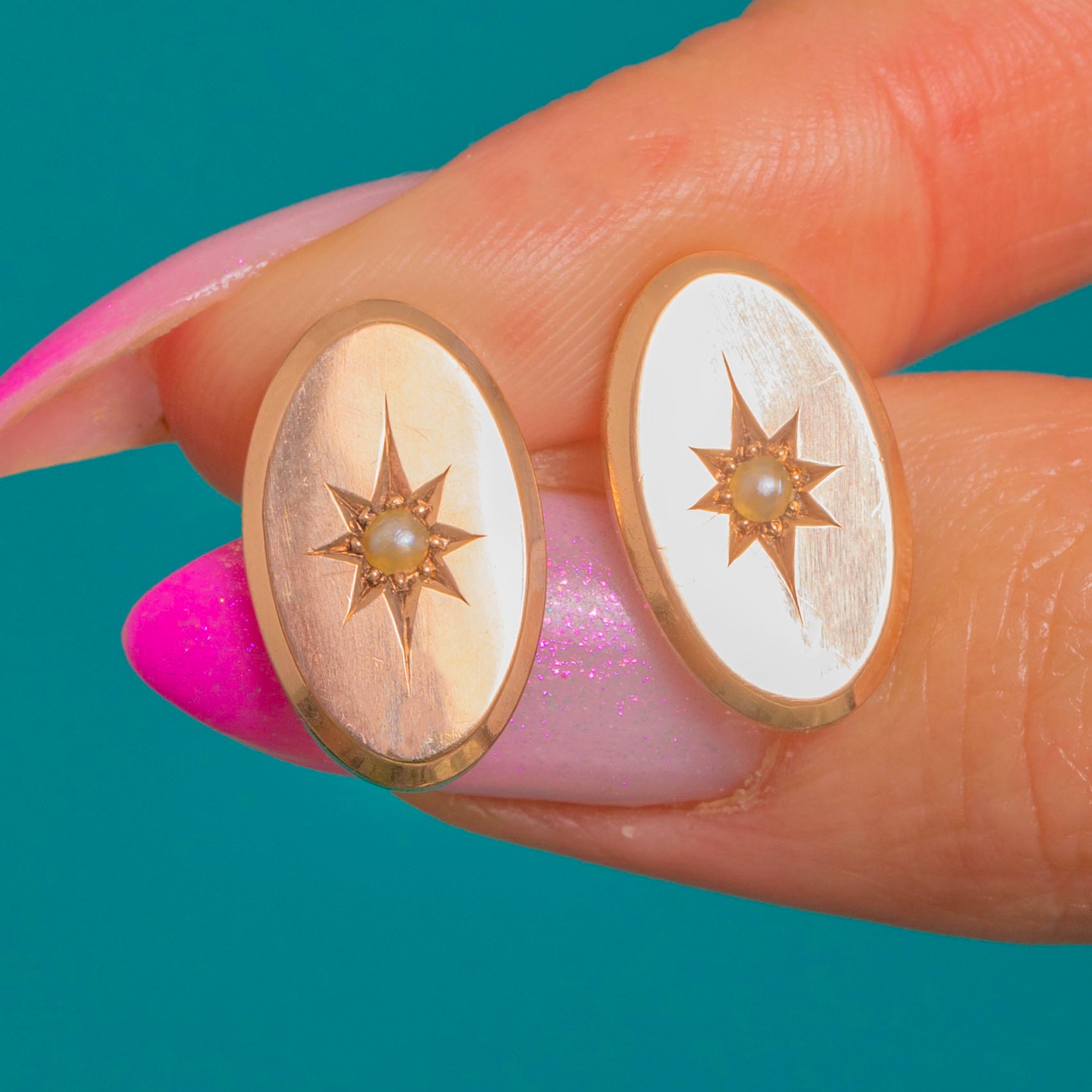 Elegant and understated, these Victorian 9ct Gold stud earrings are crafted as refined oval tablets, each one engraved with a crisp eight-point starburst and set at the heart with a creamy Seed Pearl, lending a subtle celestial sparkle.