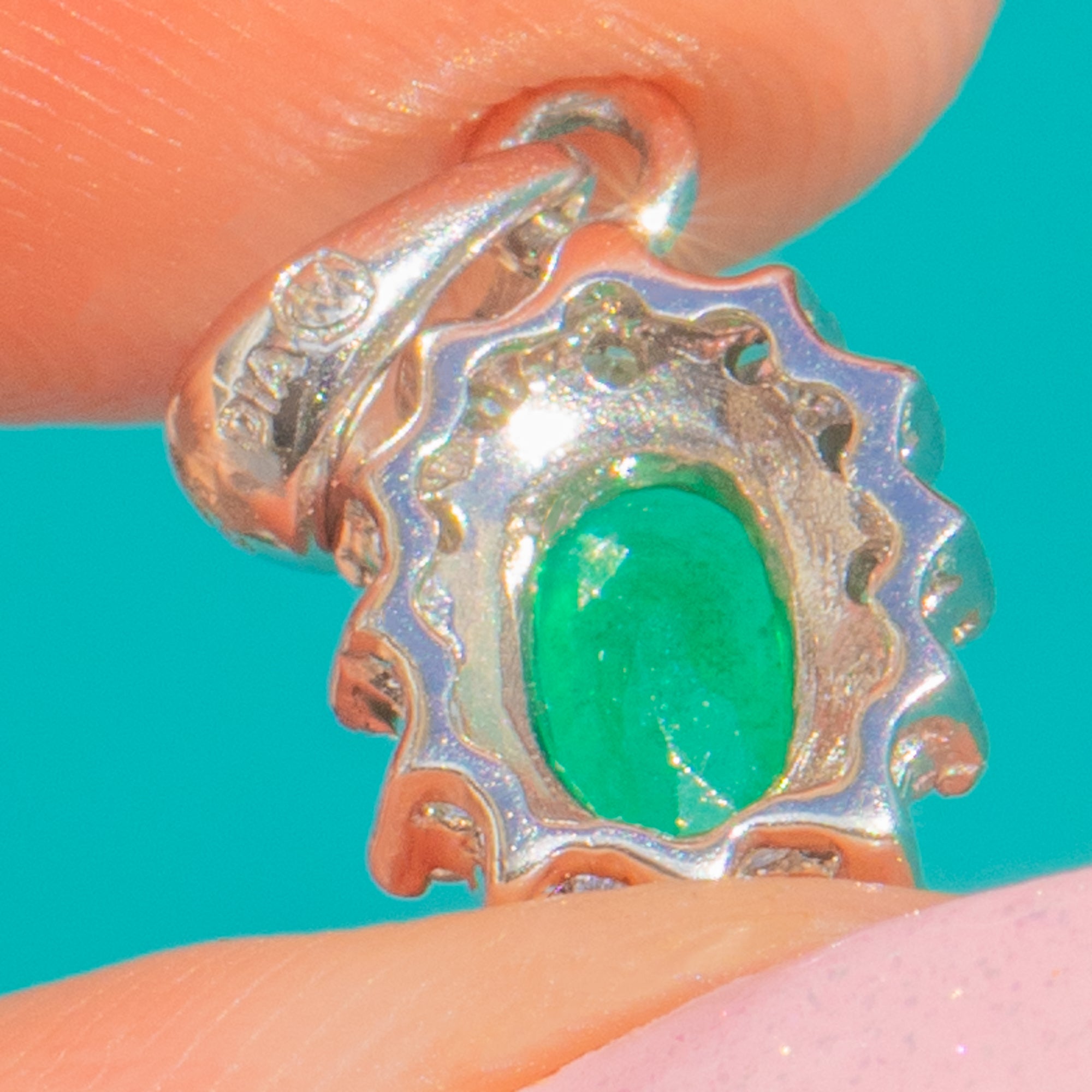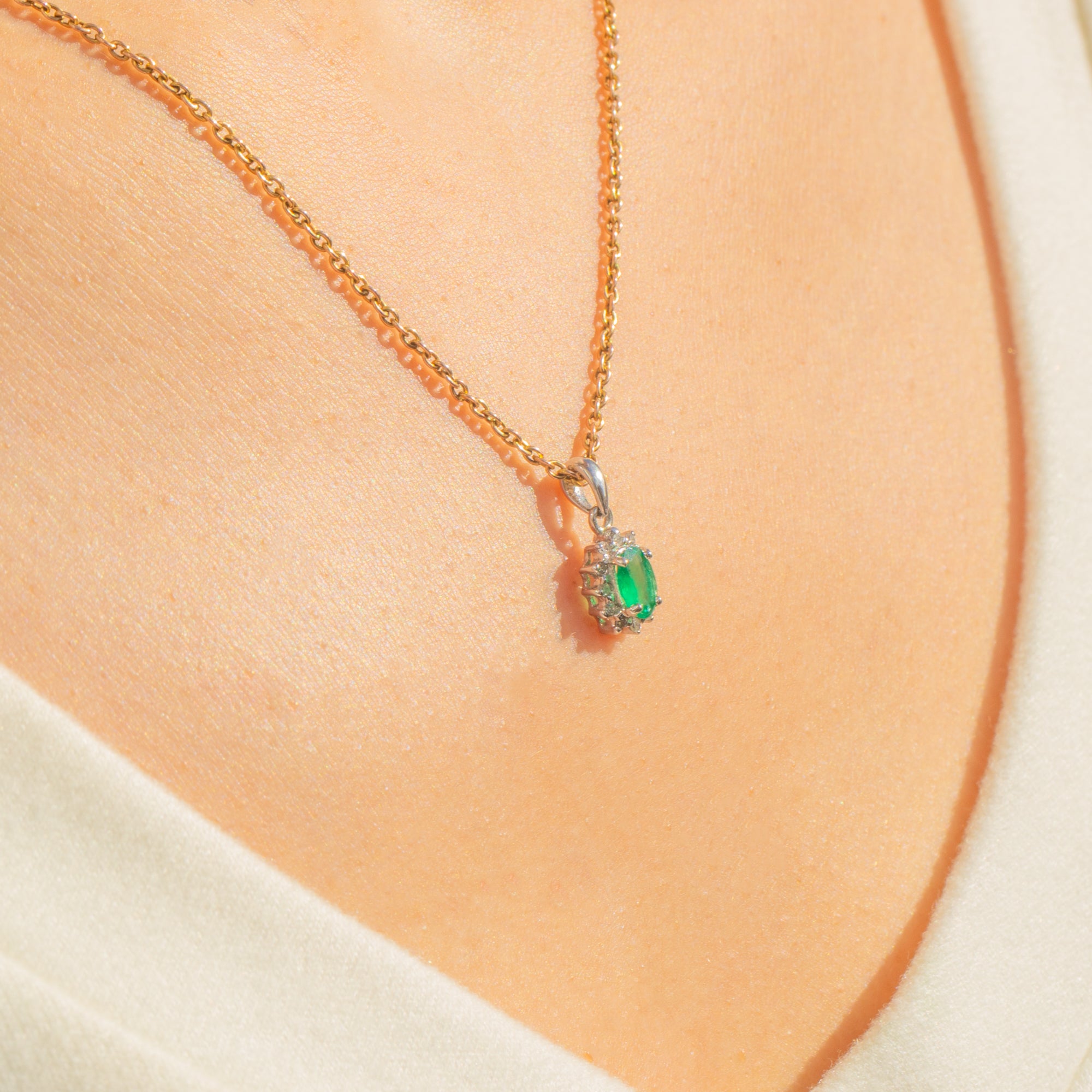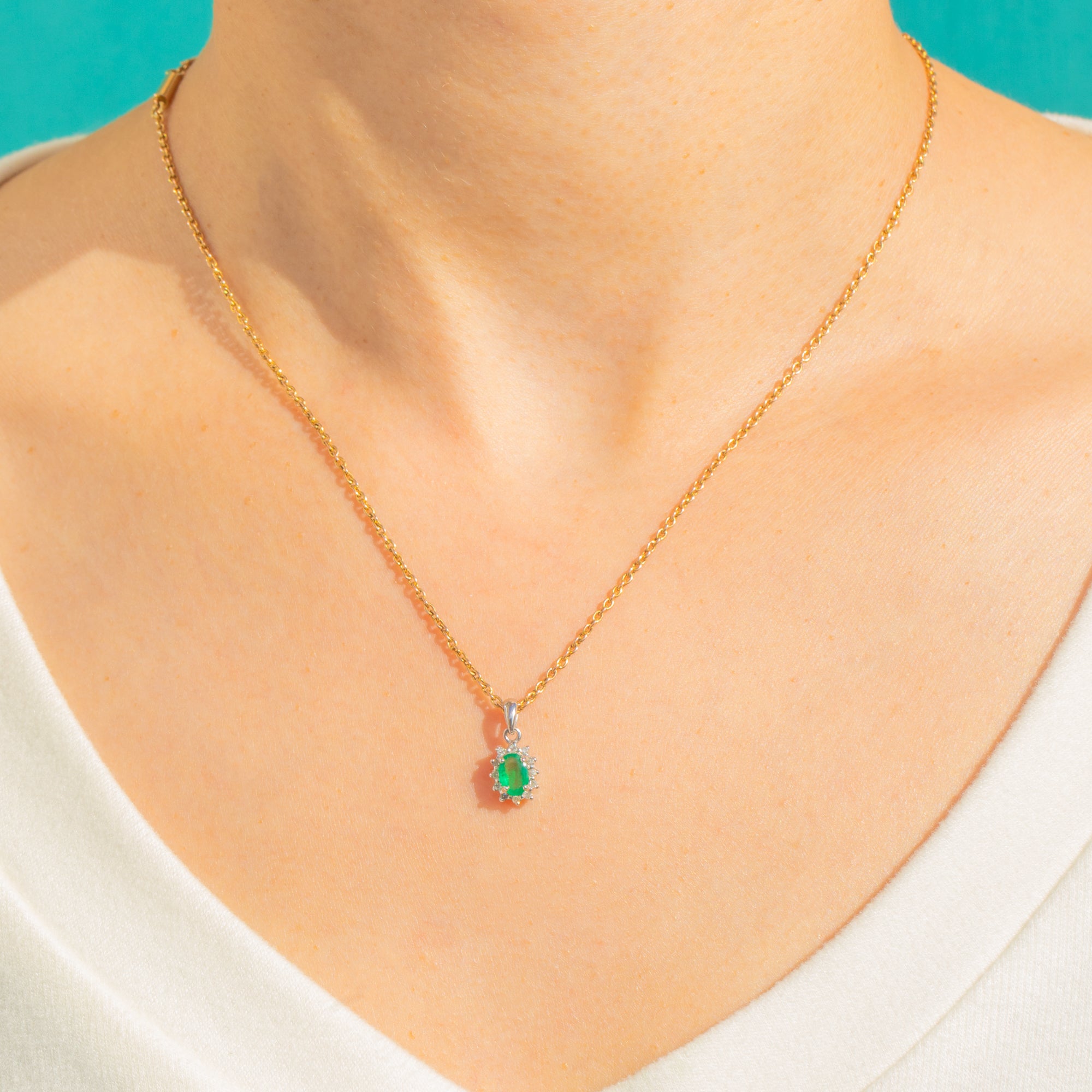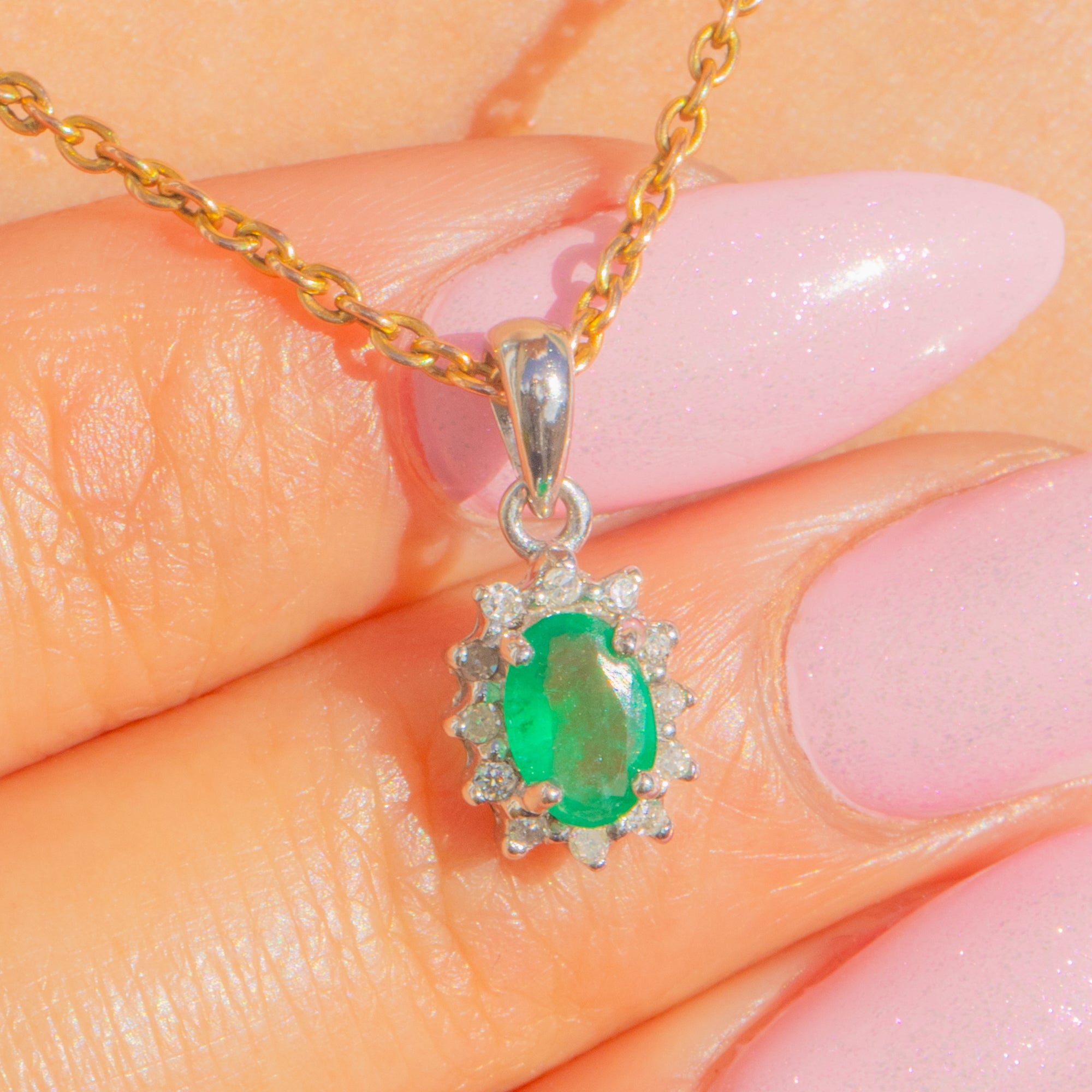 The oval Emerald (approximately 0.60ct) is secured in neat claws and framed by twelve icy Diamonds (approximately 0.06ct total) in a classic rosette silhouette. Finished with a tapered bail, it’s a timeless, feminine treasure ready to slip onto your favourite chain.