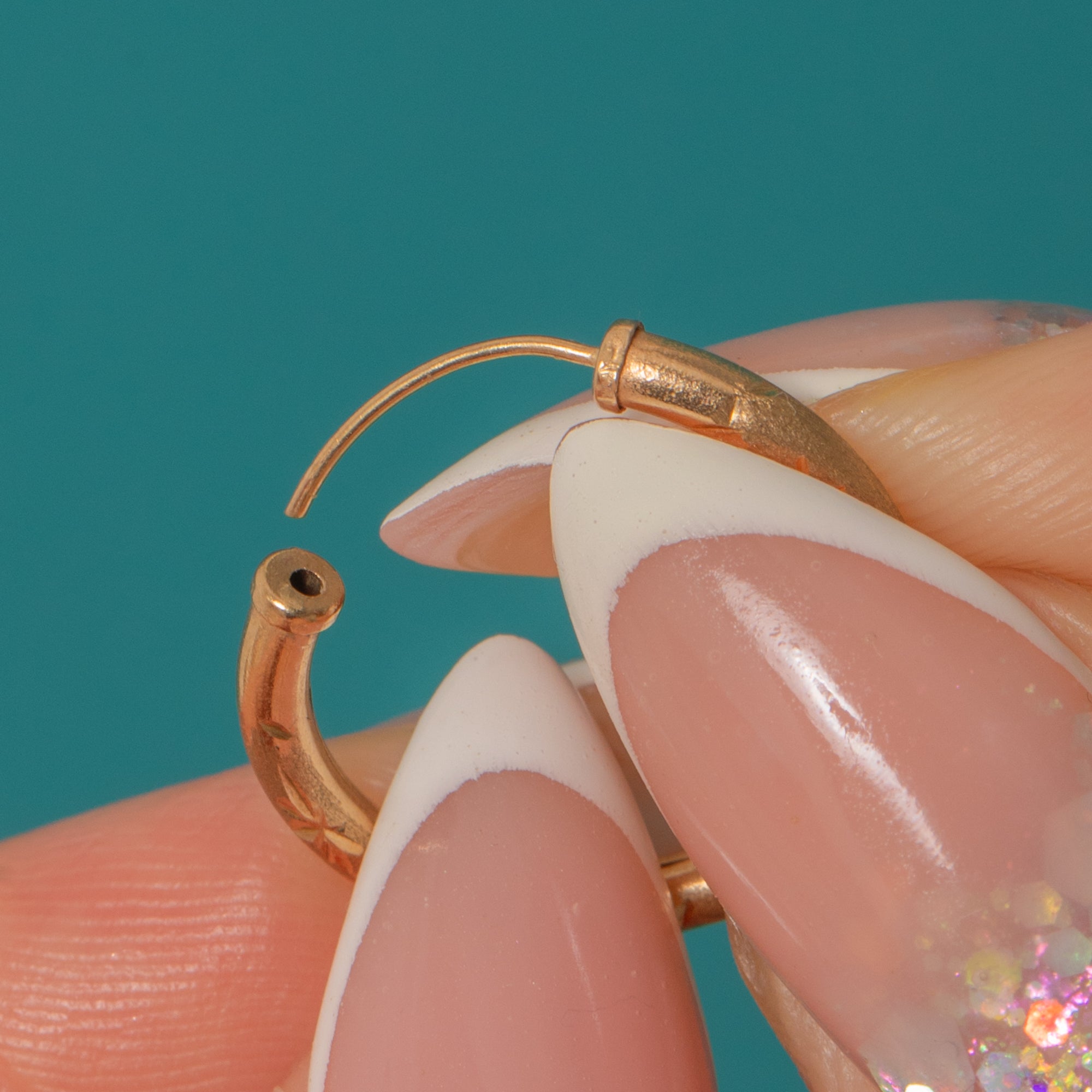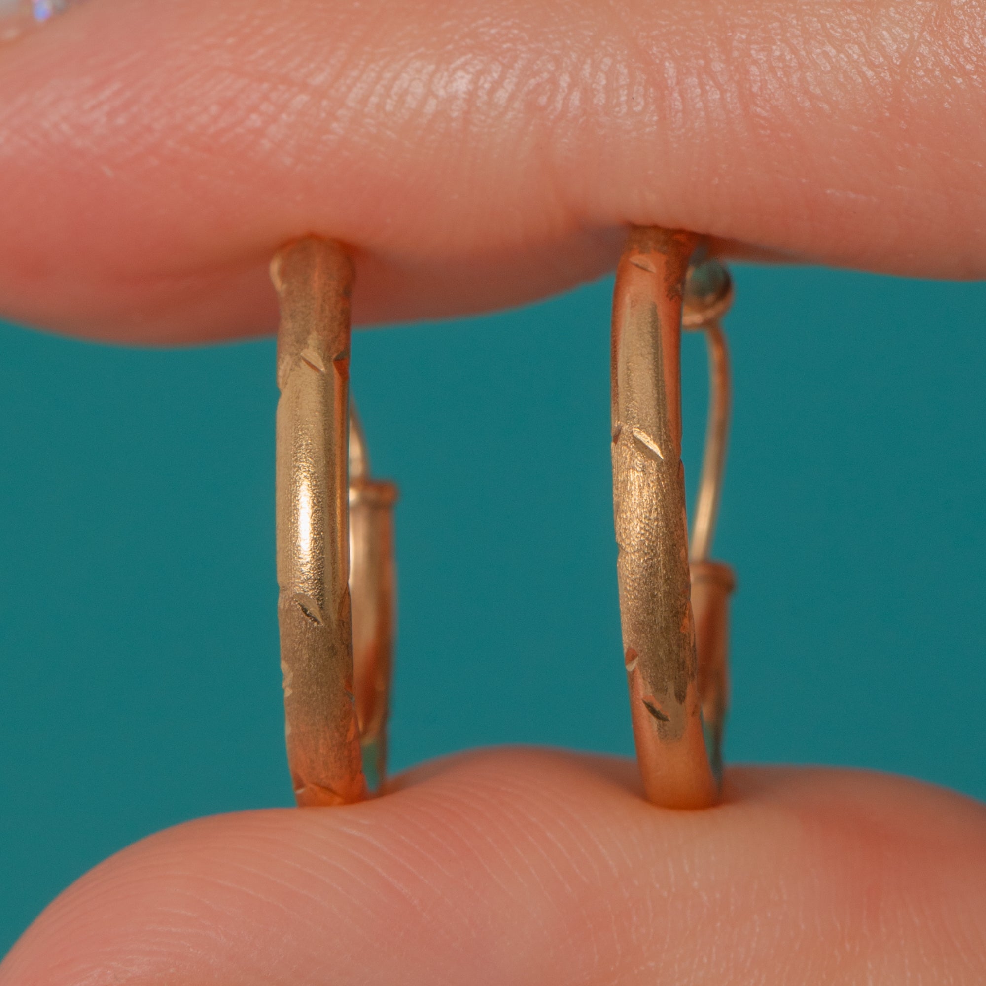 Beautiful vintage hoop earrings crafted in solid 9ct Gold and decorated with delicate foliate engraving. These charming little hoops have that classic turn-of-the-century look: lightweight, easy to wear, and versatile for all occasions!