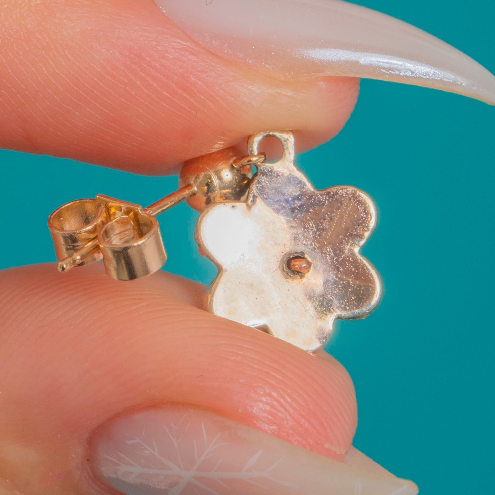 The antique rosette drops are suspended from bright 9ct Gold ball studs with modern posts and butterflies. A classic floral motif with an antique-romantic spirit—effortless for everyday elegance and sparkling enough for evening.