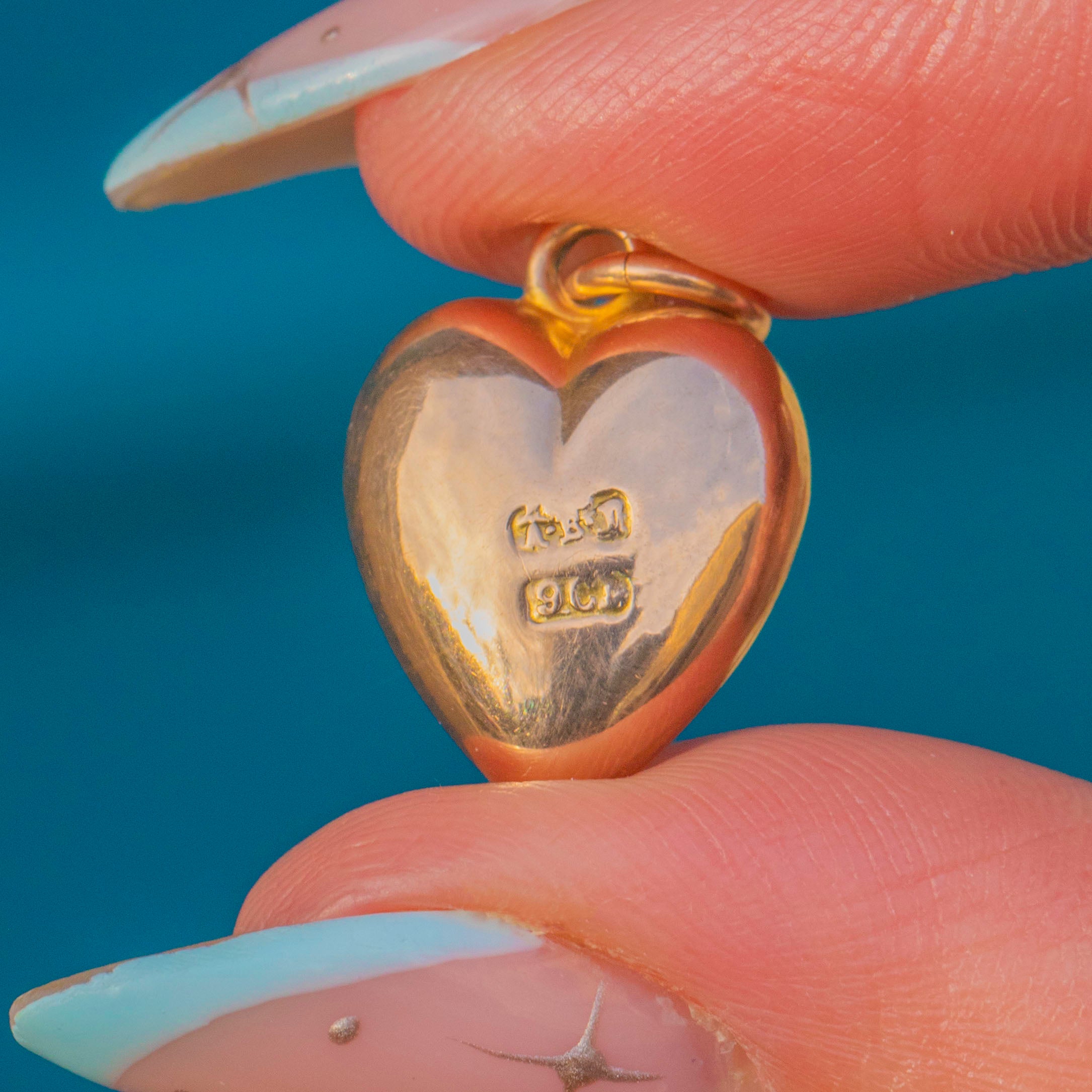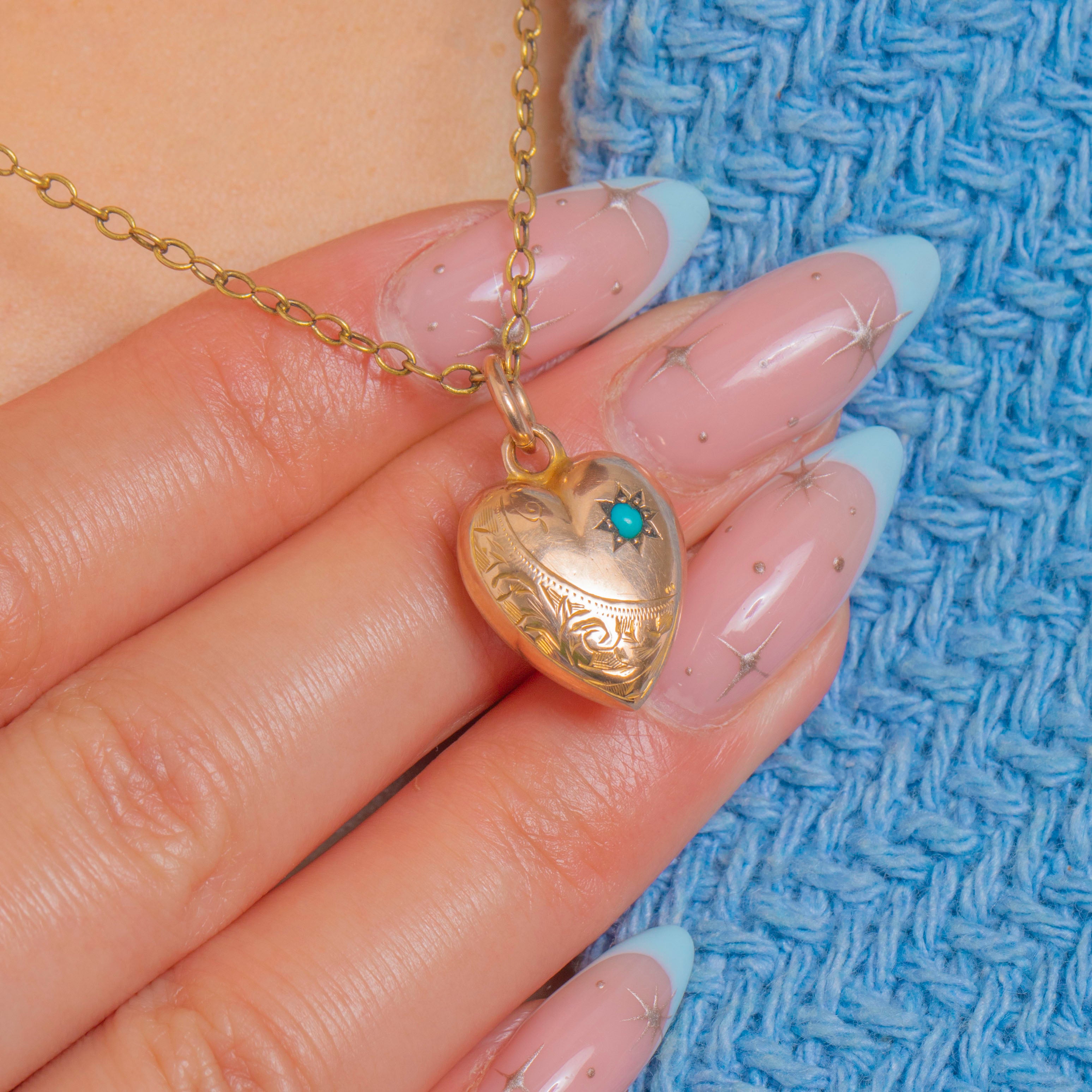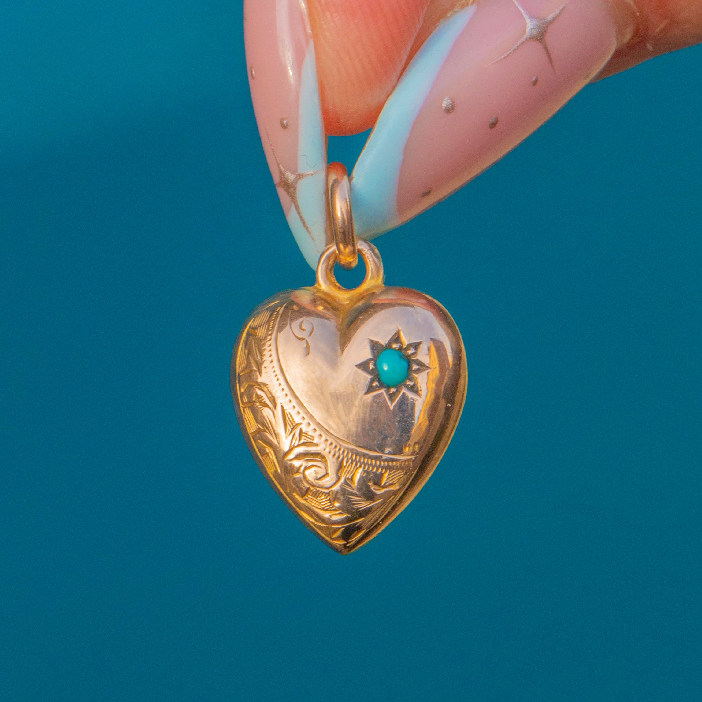 A dainty Victorian 9ct Gold heart charm, softly puffed and beautifully hand-engraved with foliate scrolls and a curved bright-cut panel. An eight-point starburst holds a single round Turquoise cabochon, lending a delicate pop of blue to the warm Gold.