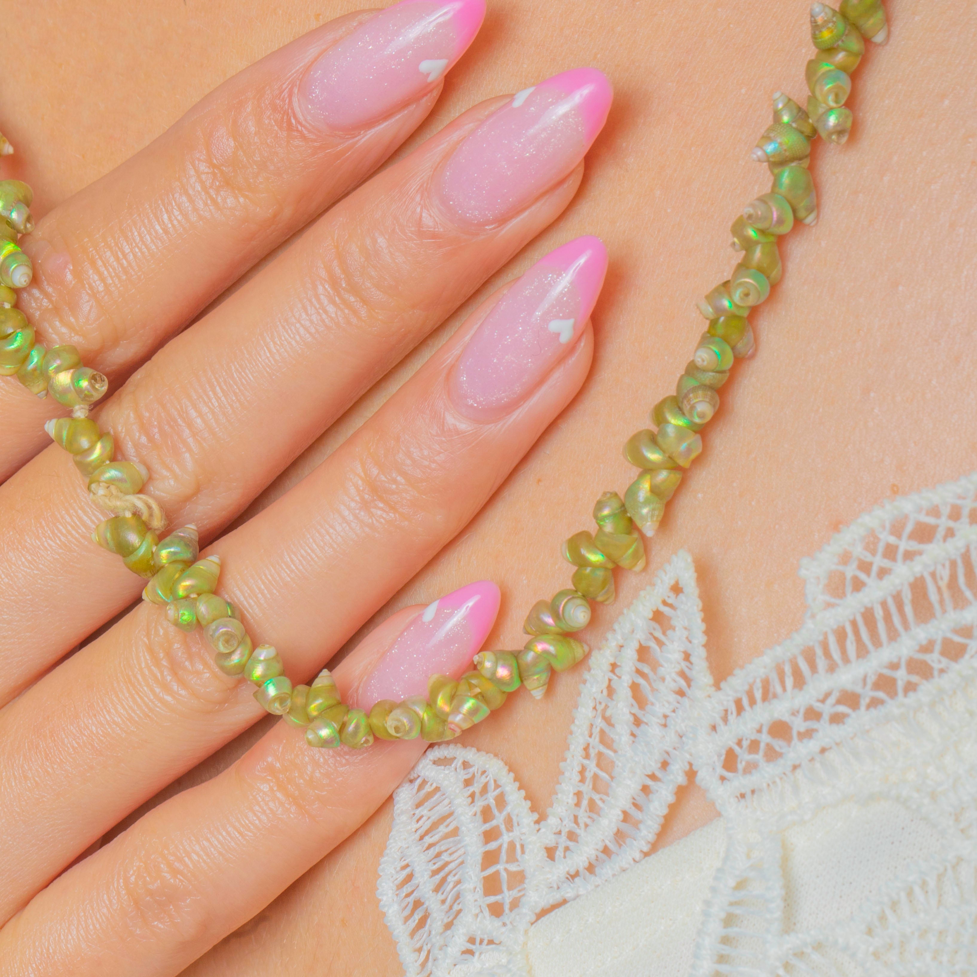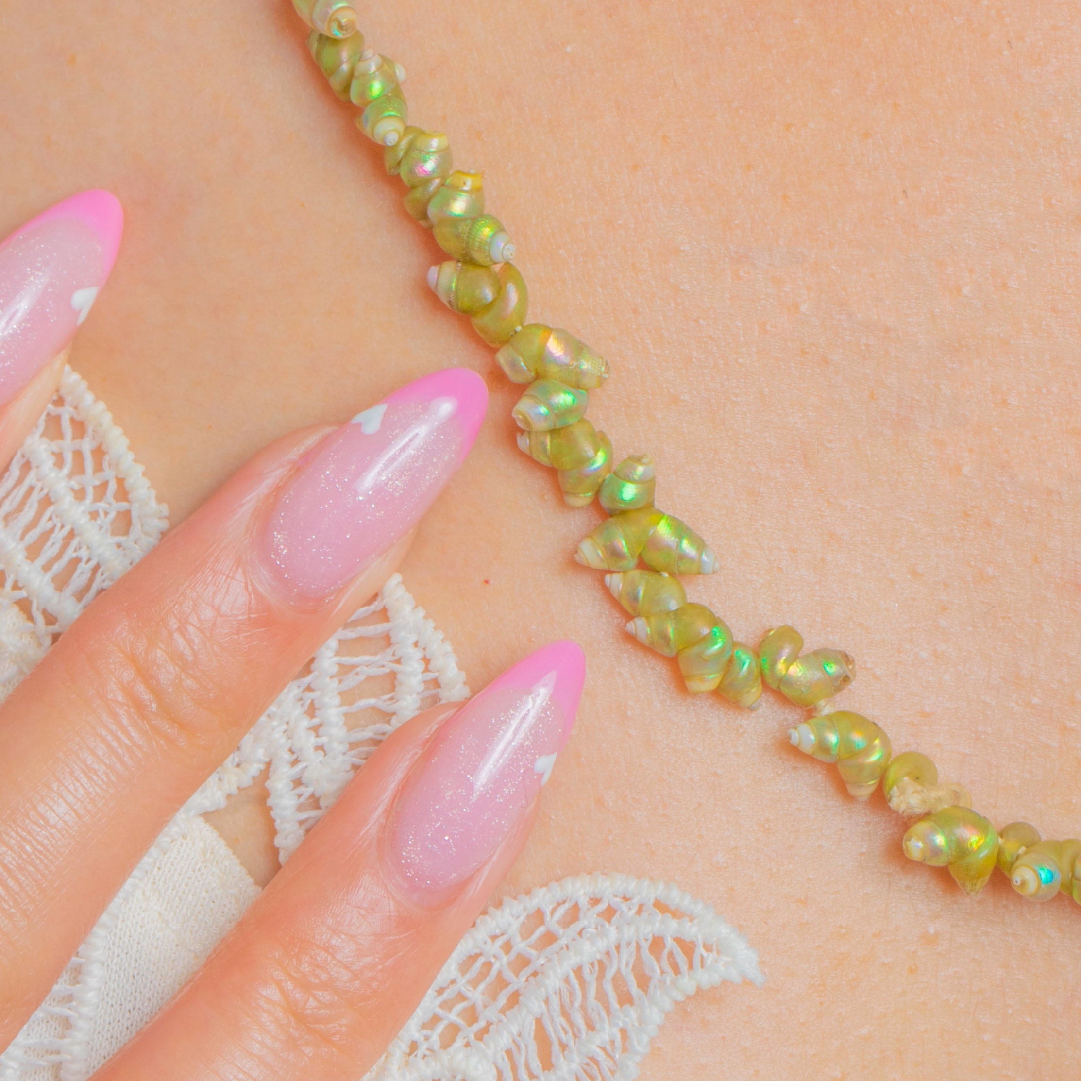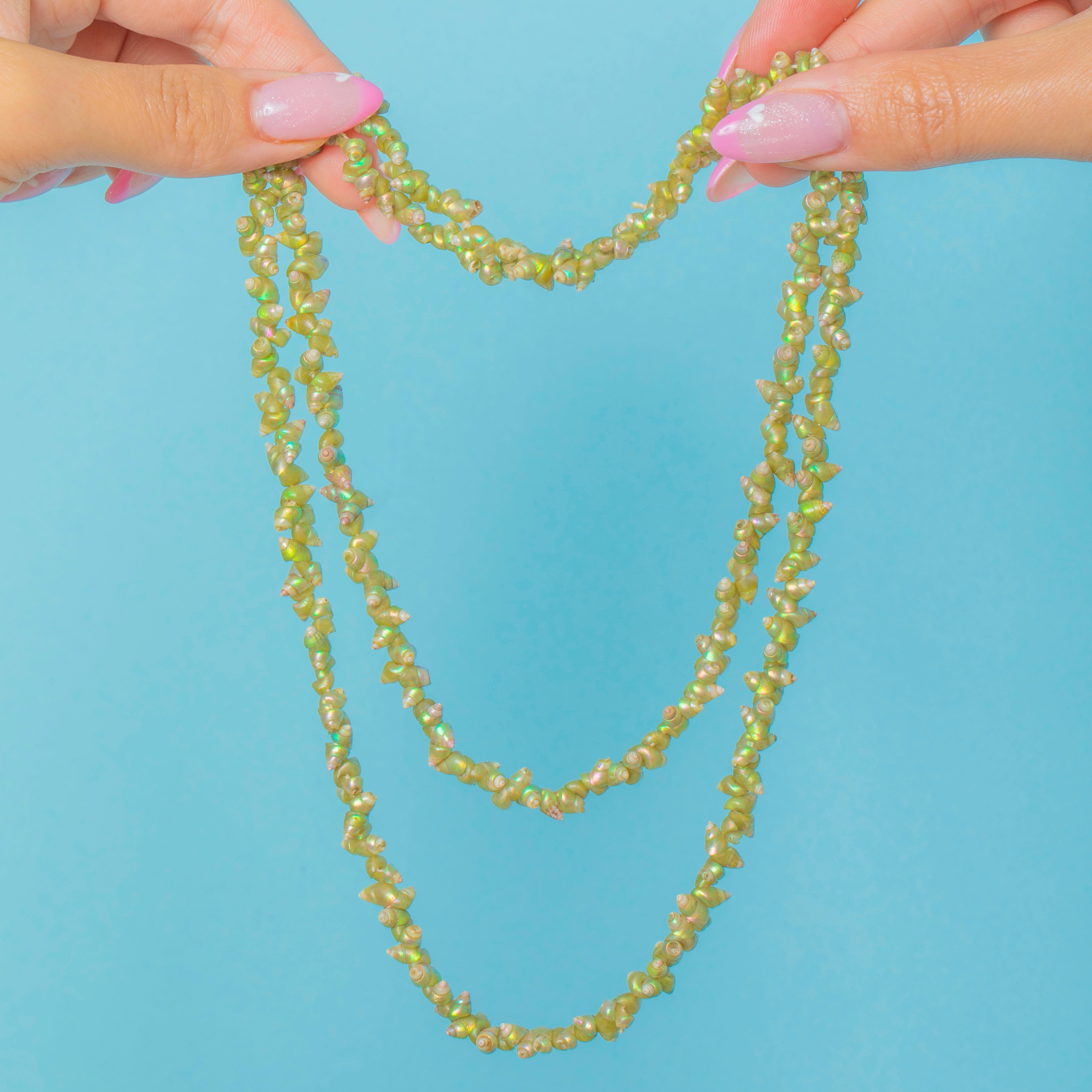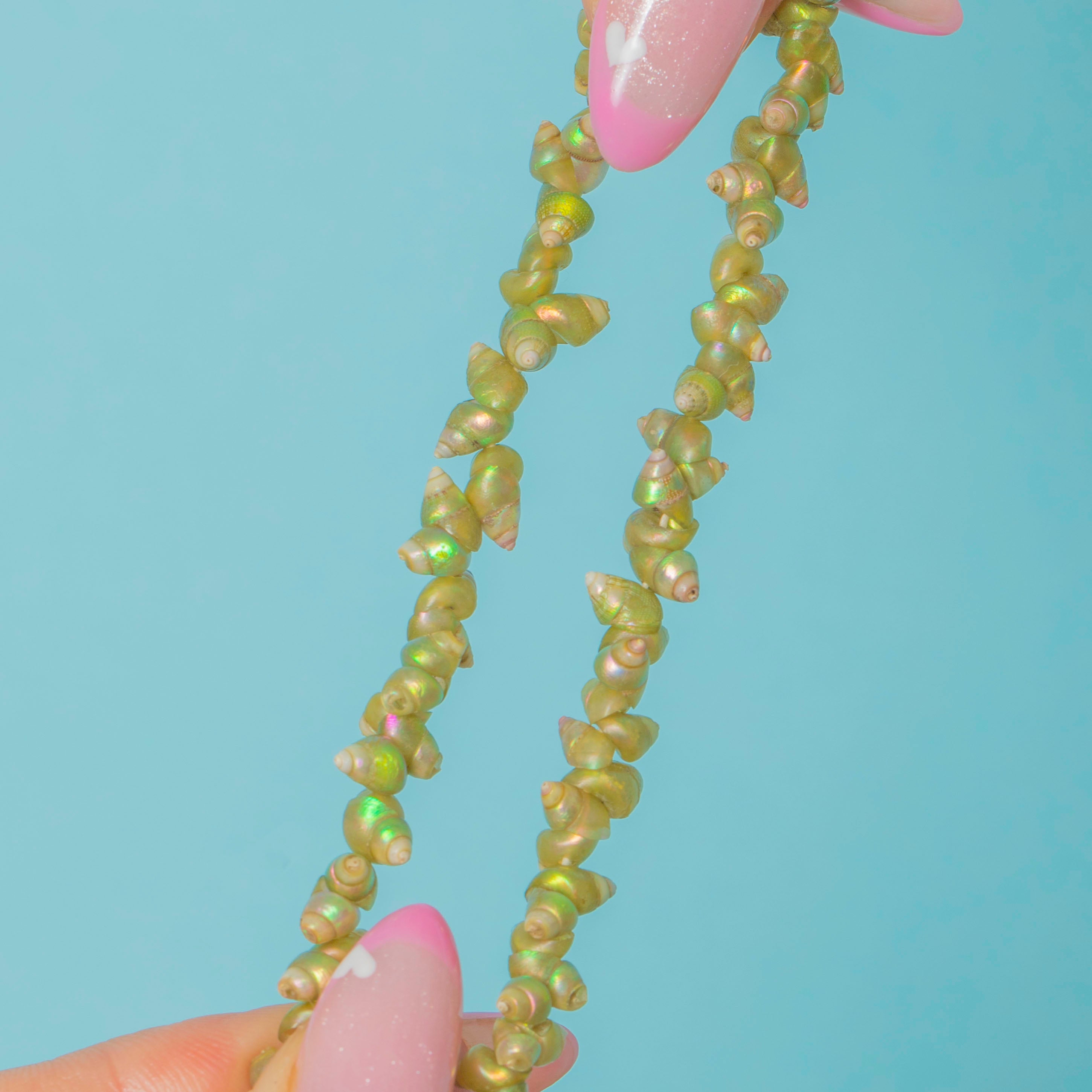 A delicate Victorian necklace strung with lustrous Tasmanian Maireener shells in soft iridescent green tones. Traditionally hand-crafted by Tasmanian Aboriginal makers, these shell necklaces are prized for their natural beauty and intricate workmanship.