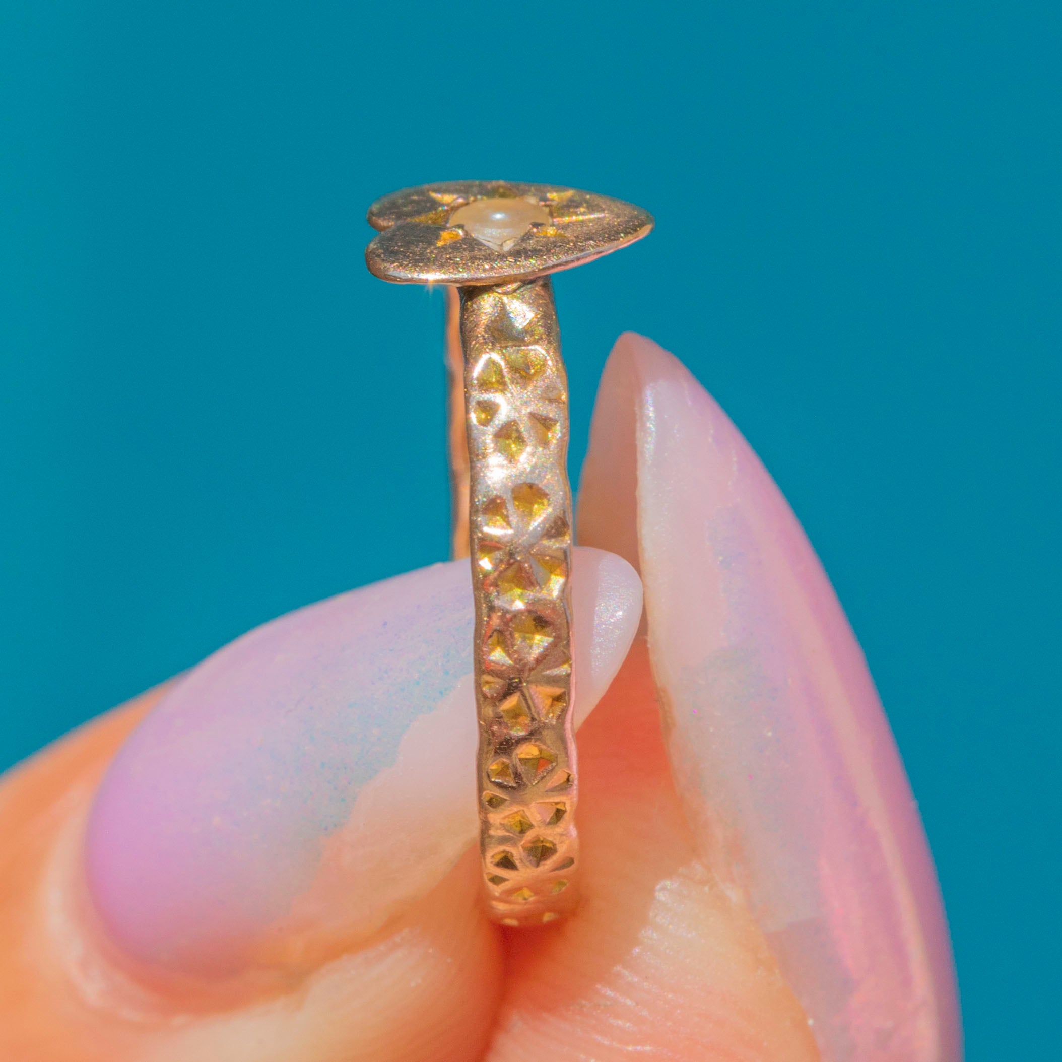 This 9ct Gold heart ring is a size D.5, so the perfect midi or pinky ring. In her centre sits a mini Seed Pearl, complemented by her adorable heart settings.