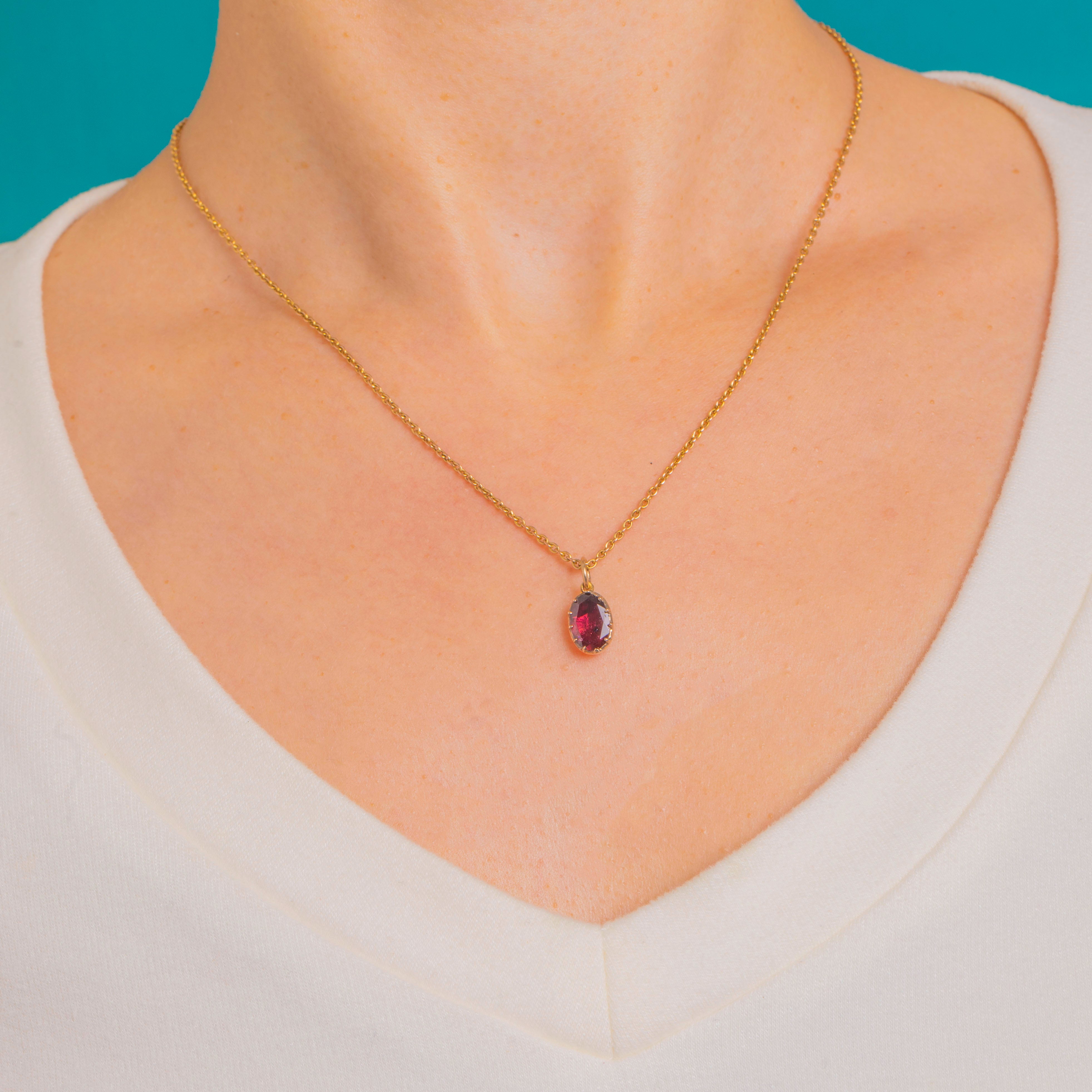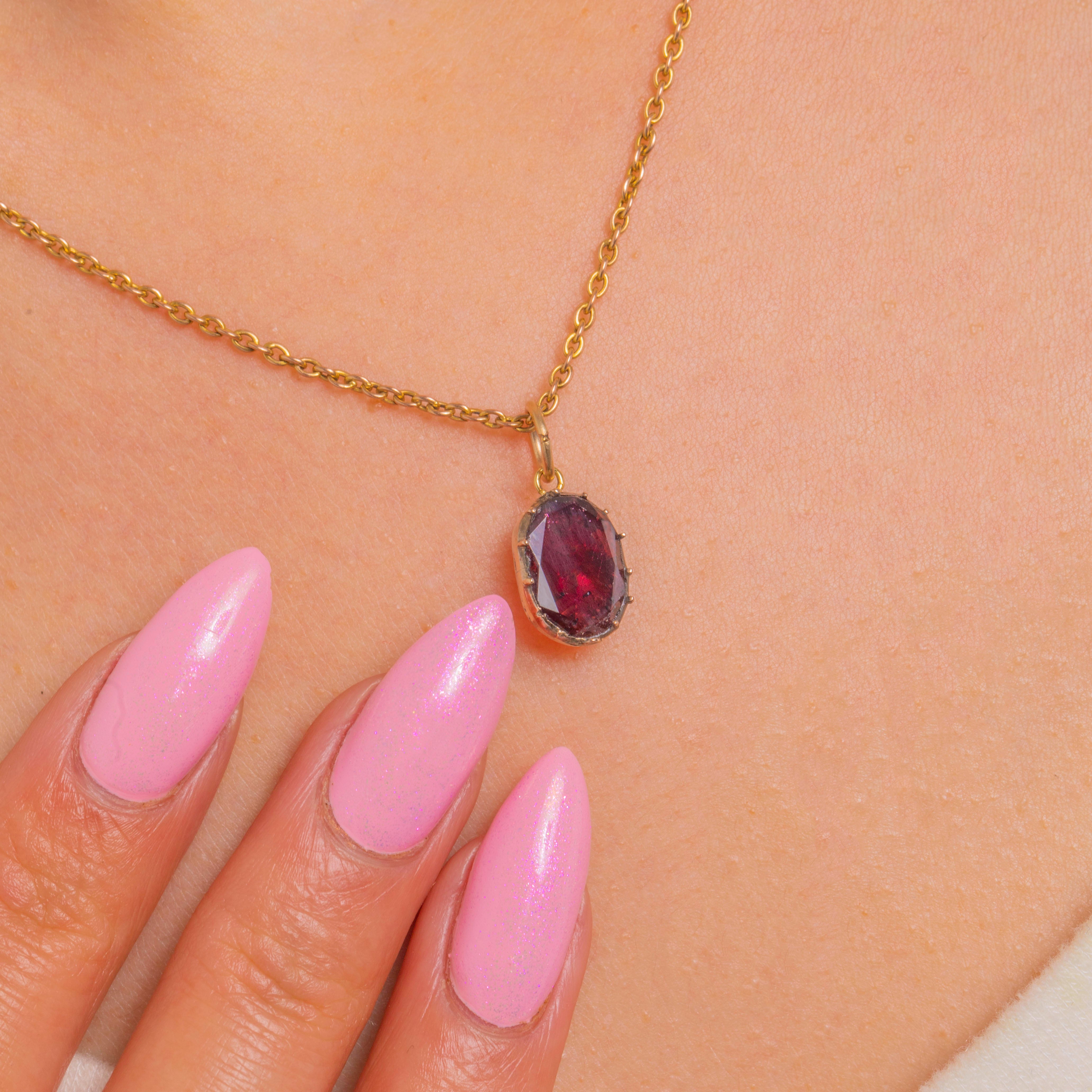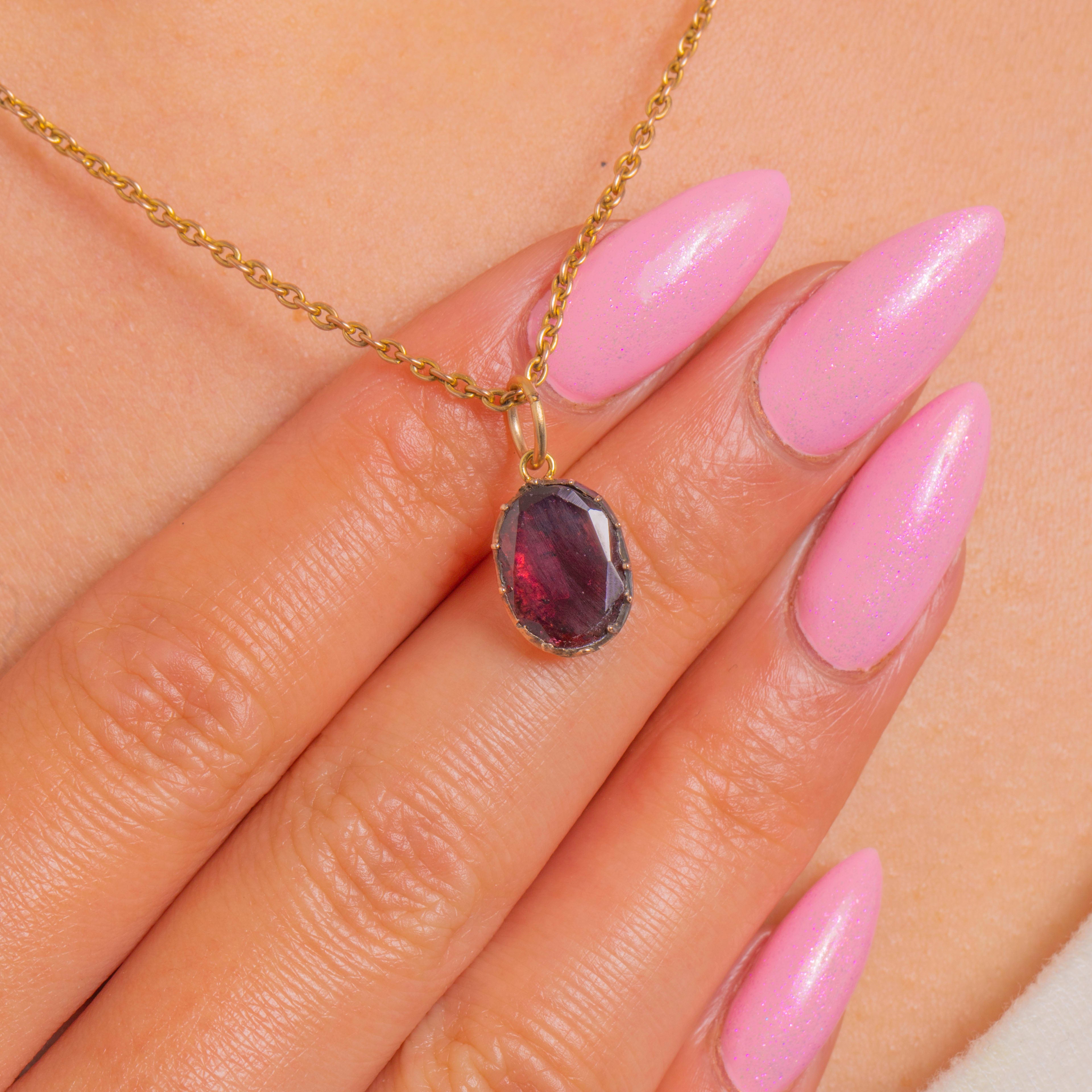 A petite treasure from the early 19th century, this Georgian Garnet charm captivates with its deep, wine-red hue. The oval Garnet sits in a fine 9ct Gold hand-worked collet with a delicate pie crust rim, its rich colour and gentle sparkle offering that unmistakable antique allure.