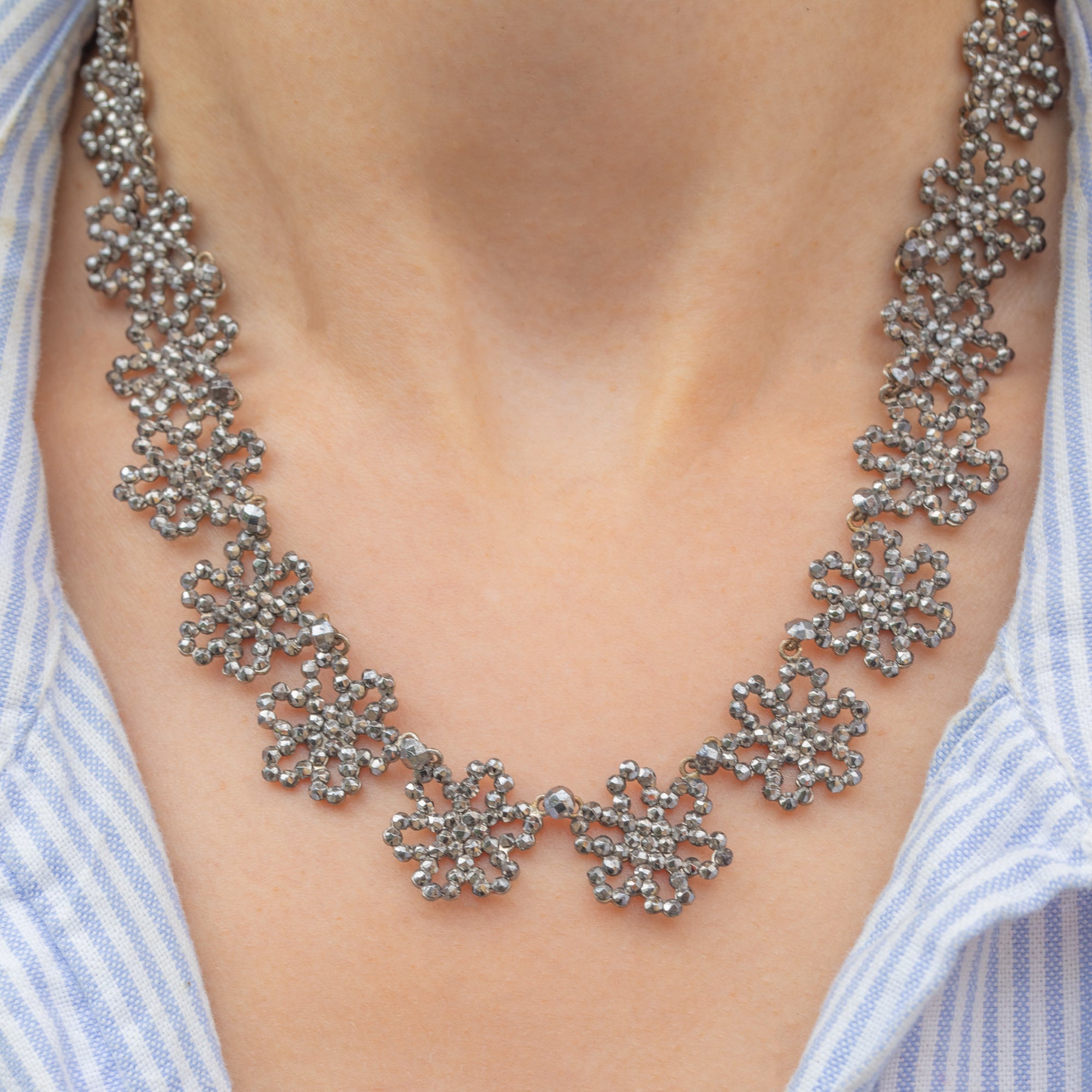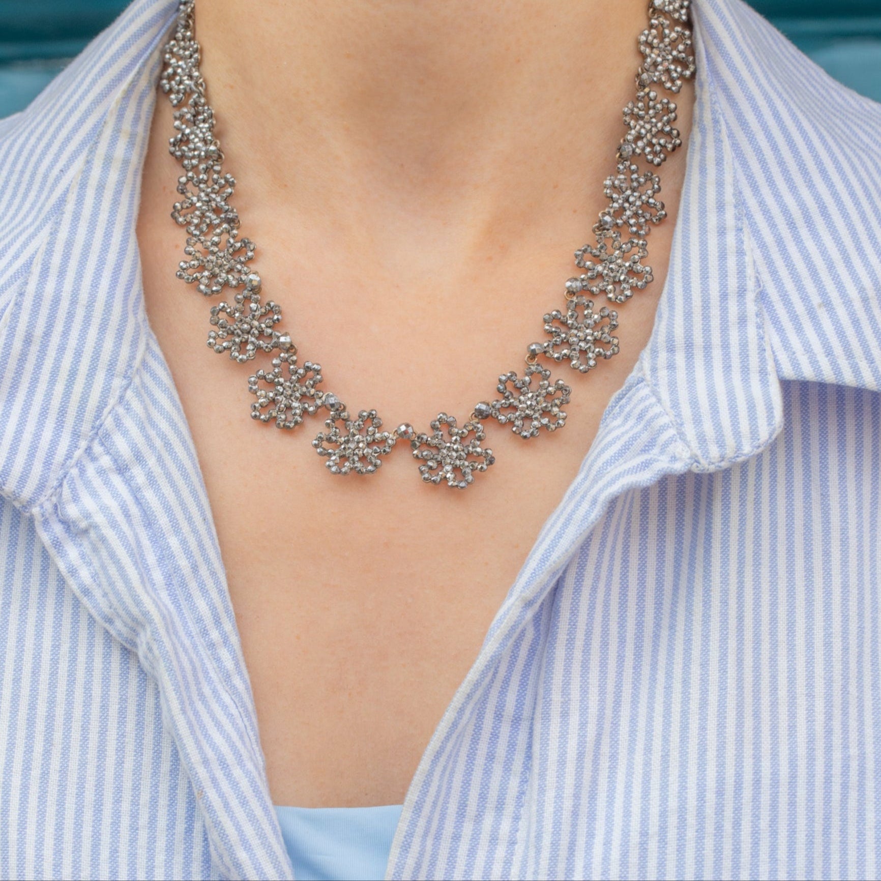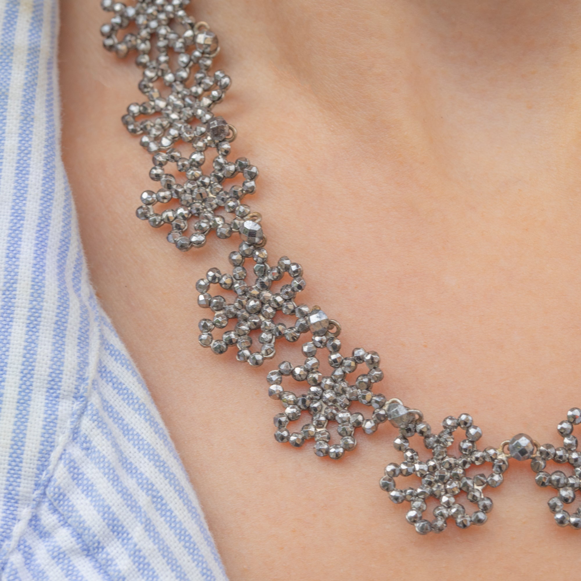 This exquisite early 19th century Georgian Cut Steel flower riviere necklace is a lovely 16" long, and will rest delicately above the collarbone!