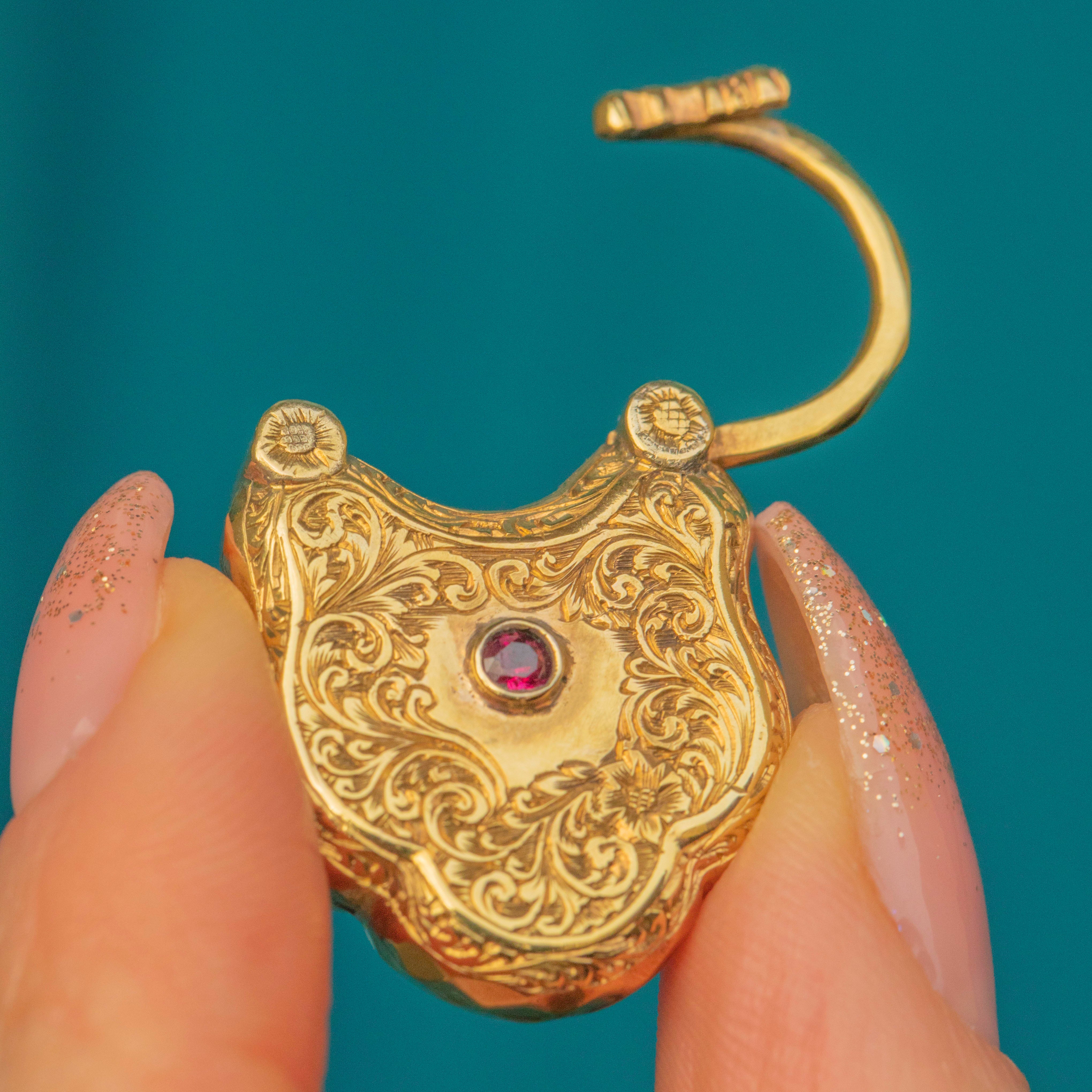 EXCELLENT: This early Victorian 9ct Gold engraved Ruby padlock pendant is in excellent condition. She is free from any visible signs of wear, and her Ruby is free from any scuffs or scratches. Closing with a nice 'click', you can wear her with confidence.
