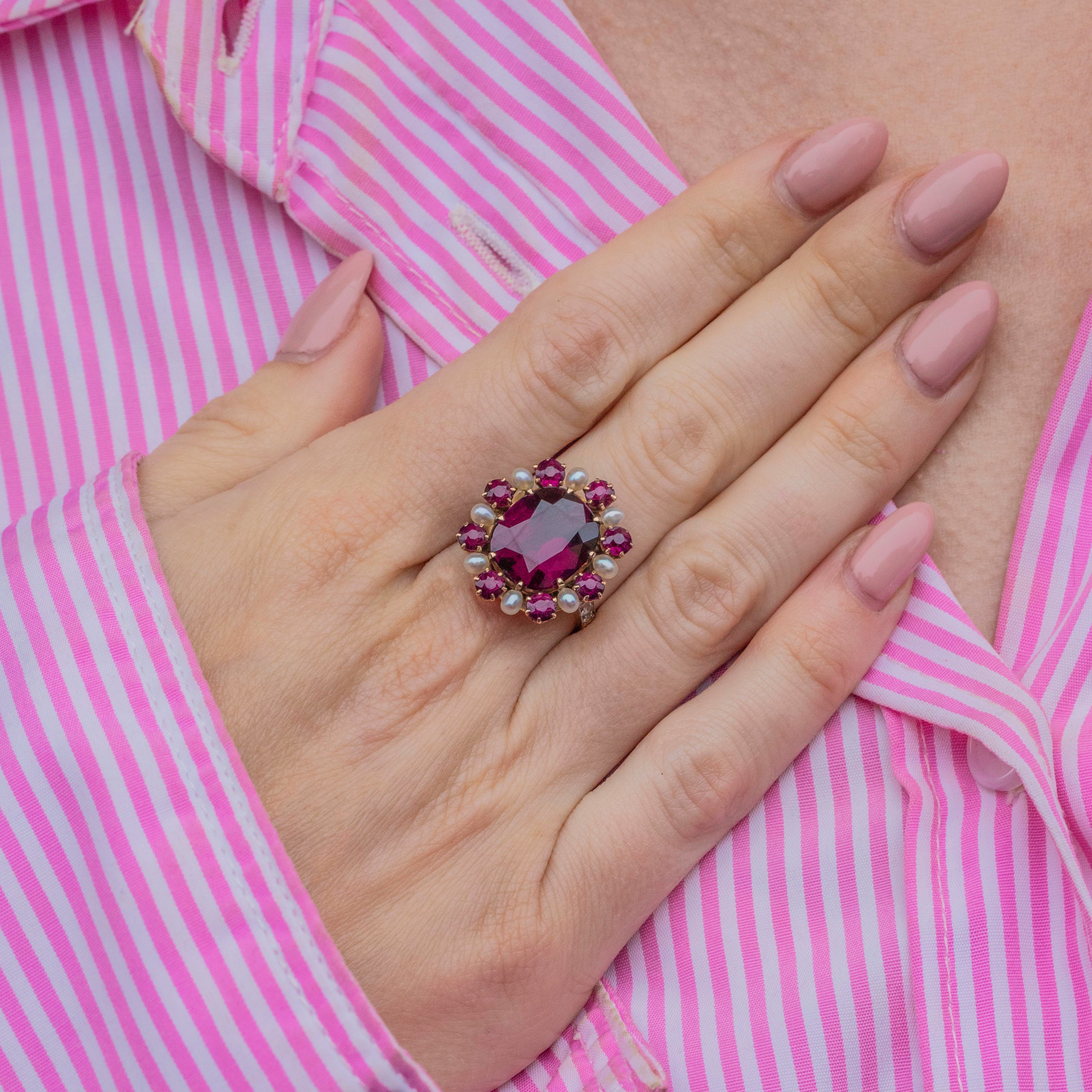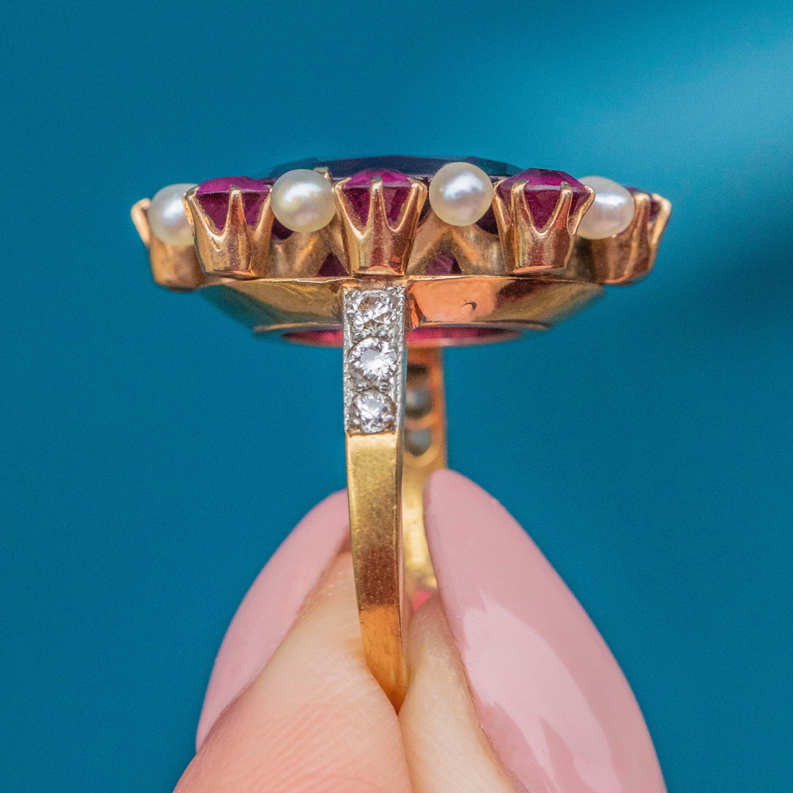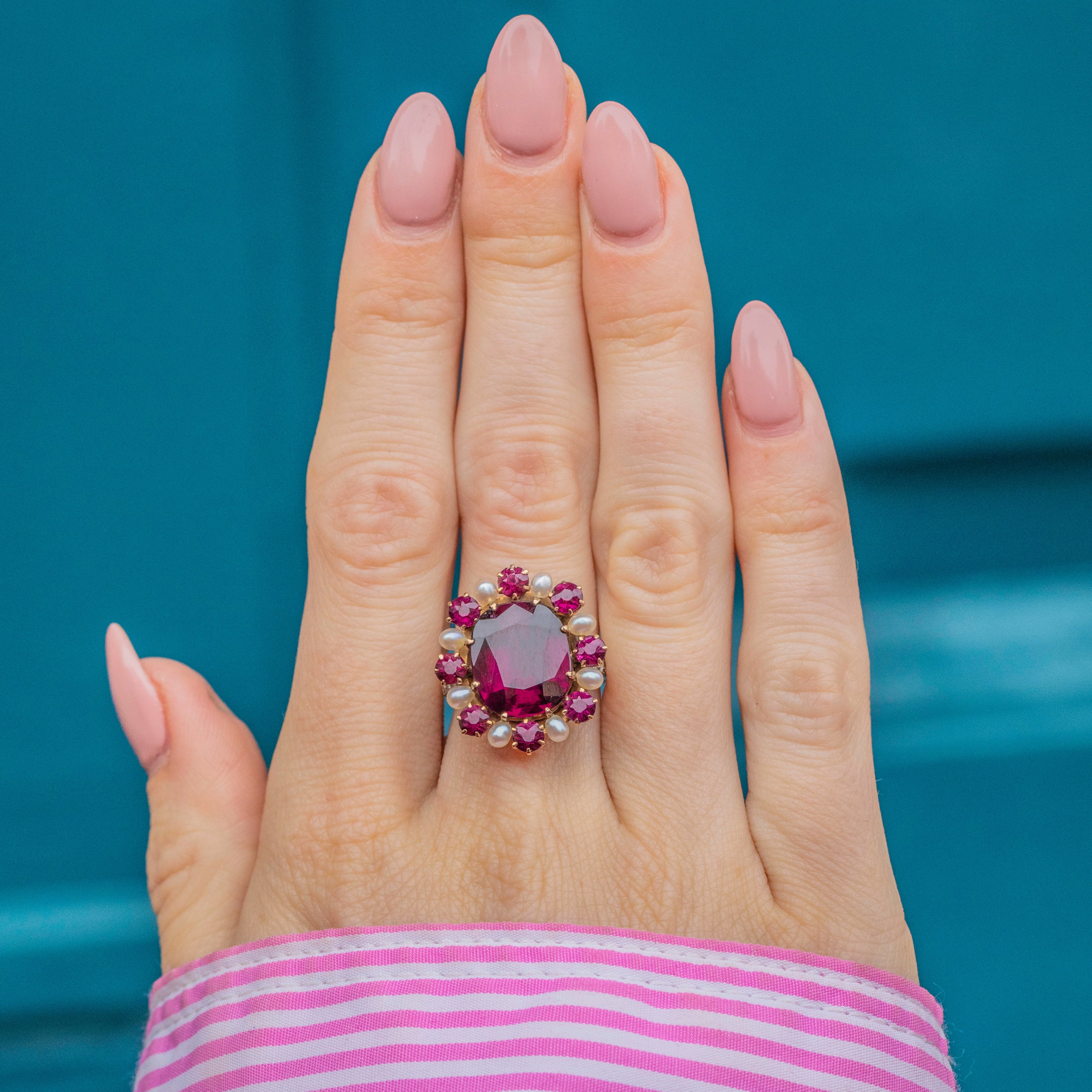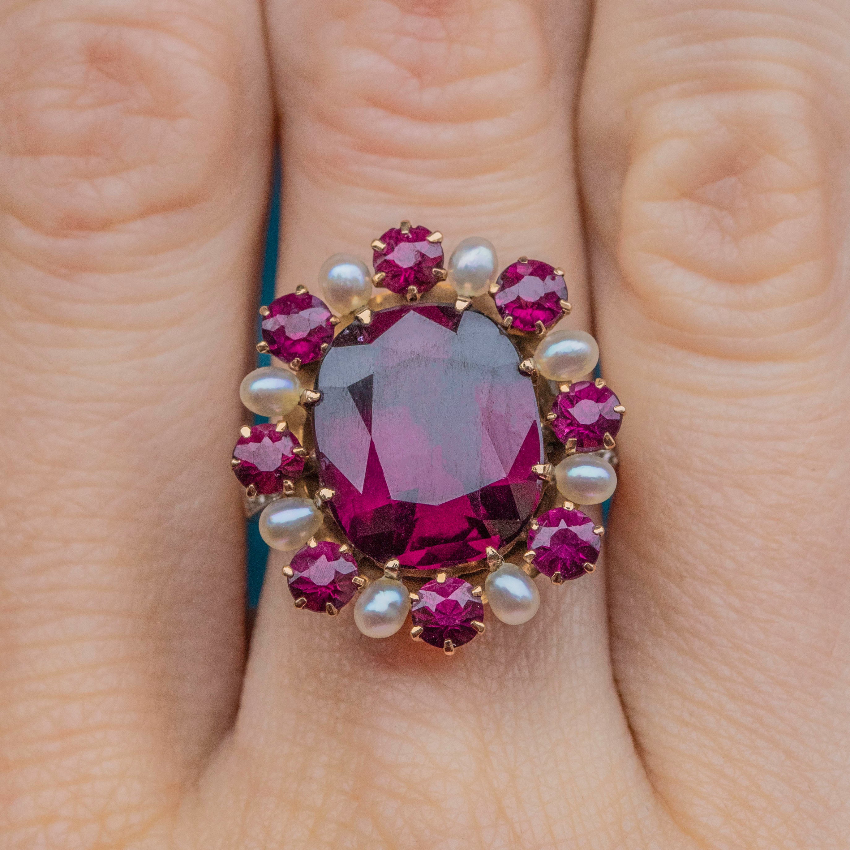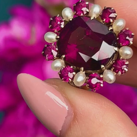 EXCELLENT. This Edwardian 14ct Gold Garnet Pearl cluster ring is in excellent condition. Her large oval Garnet is pristine, free from any scuffs or chips, as are her smaller surrounding Garnets whose facets sparkly brilliantly under the light. Her Pearls have an excellent sheen and have retained their lustre over the years. The Diamonds are all present and set securely into their 14ct Gold settings - scintillating wonderfully as you catch her sides. She's a beautiful statement ring fit for royality!