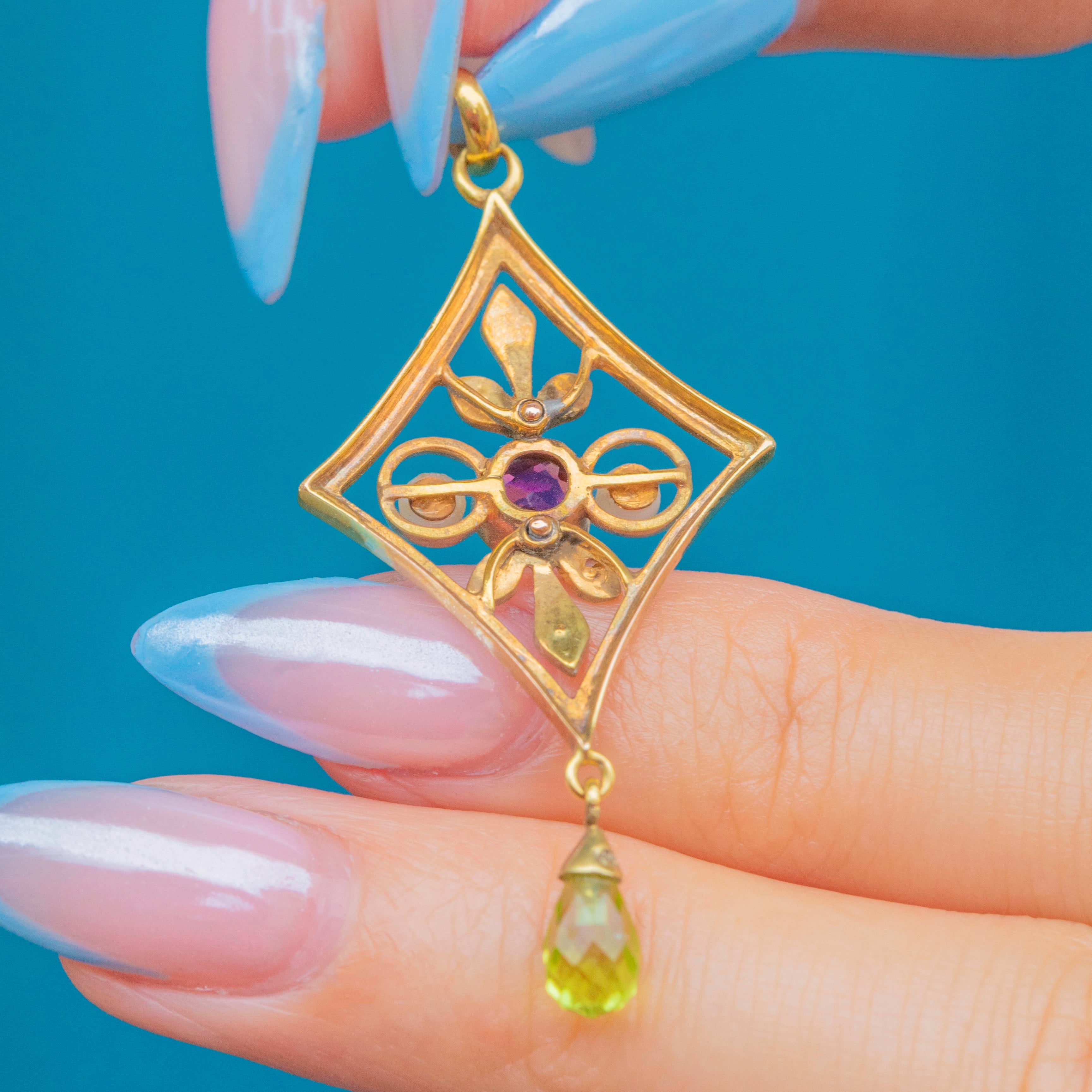 Edwardian 14ct Gold Suffragette Pendant, Amethyst Pearl Peridot