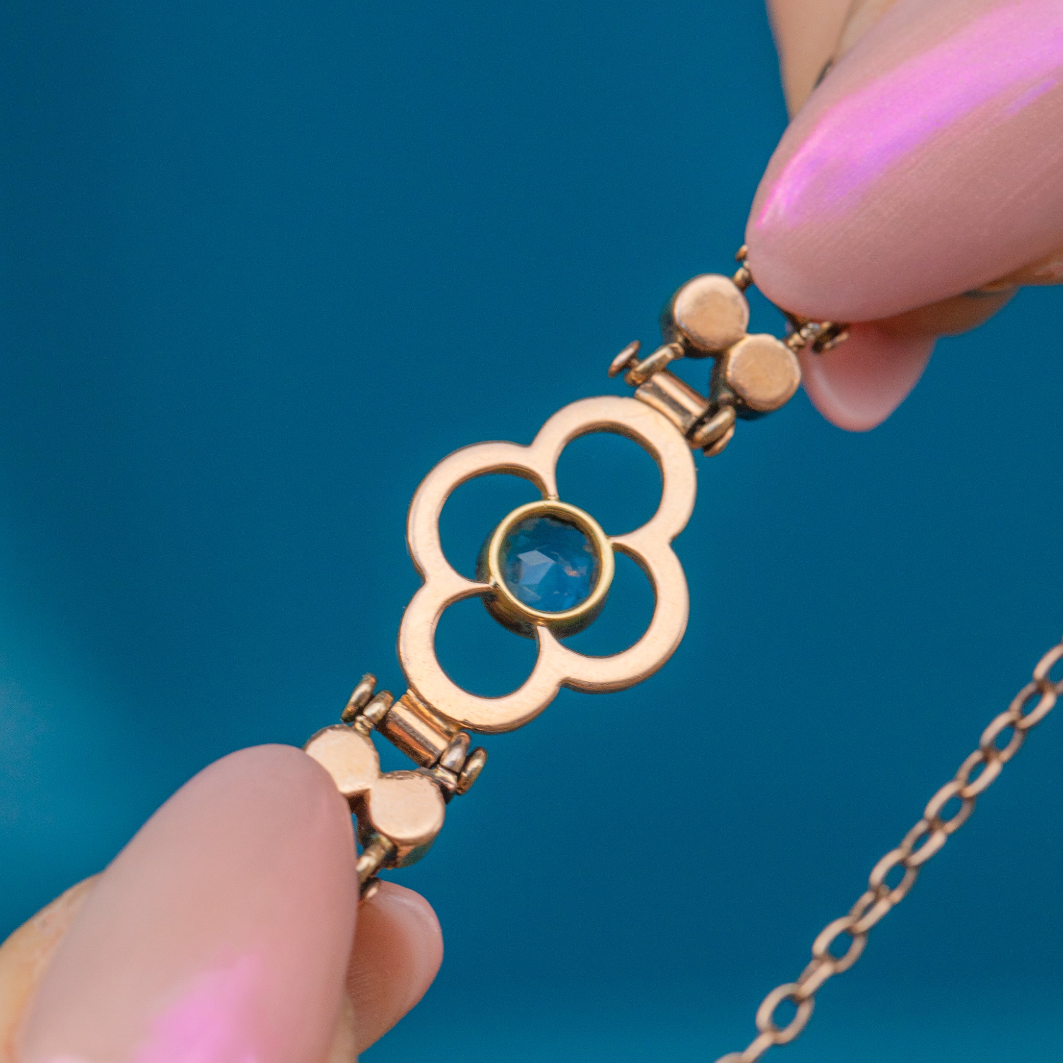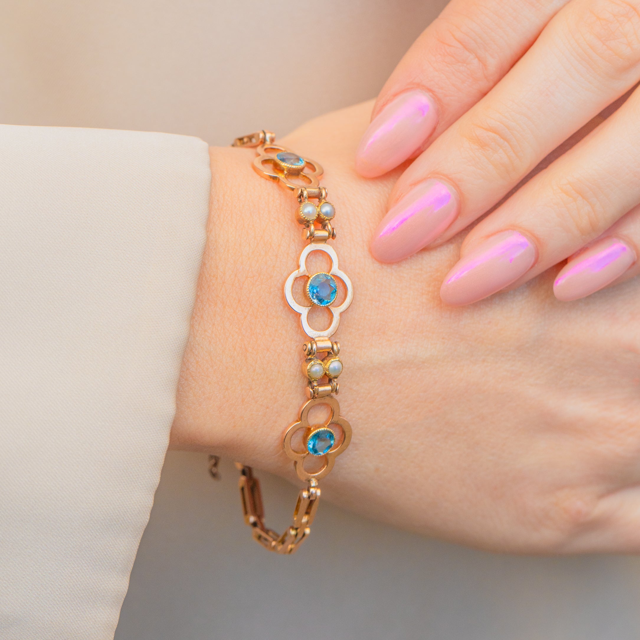 We have fallen in love with this exquisite Edwardian 15ct Gold Aquamarine and Pearl bracelet! Embodying exquisite antique craftsmanship, this bracelet boasts intricate floral motifs and has all the elegance of a timeless classic.
