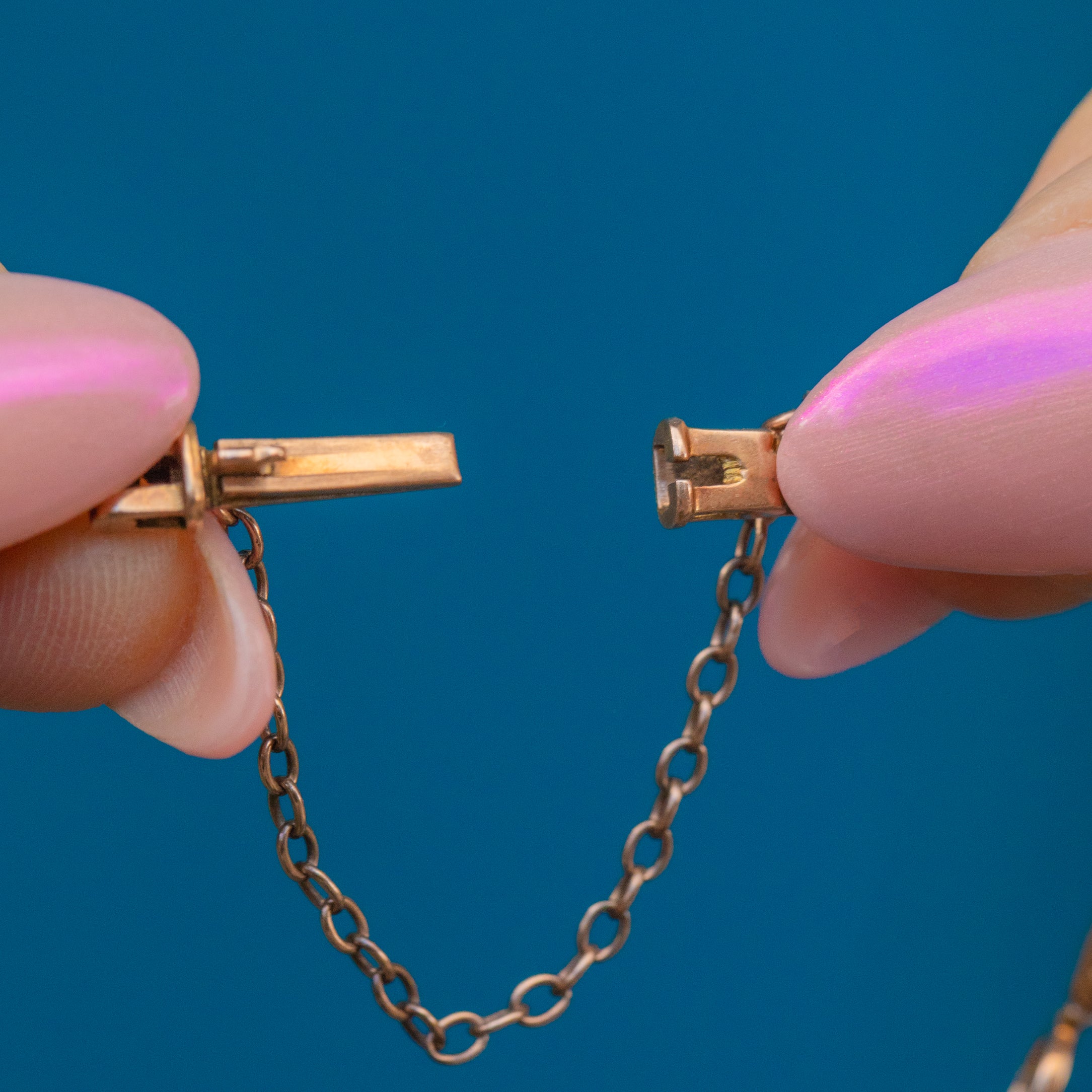 This Edwardian Gold bracelet displays three radiant Aquamarines, capturing the light wonderfully and radiating serene sky-blue hues. She is accented by lustrous iridescent Pearls, their subtle brilliance perfectly complimenting the buttery 15ct Gold.