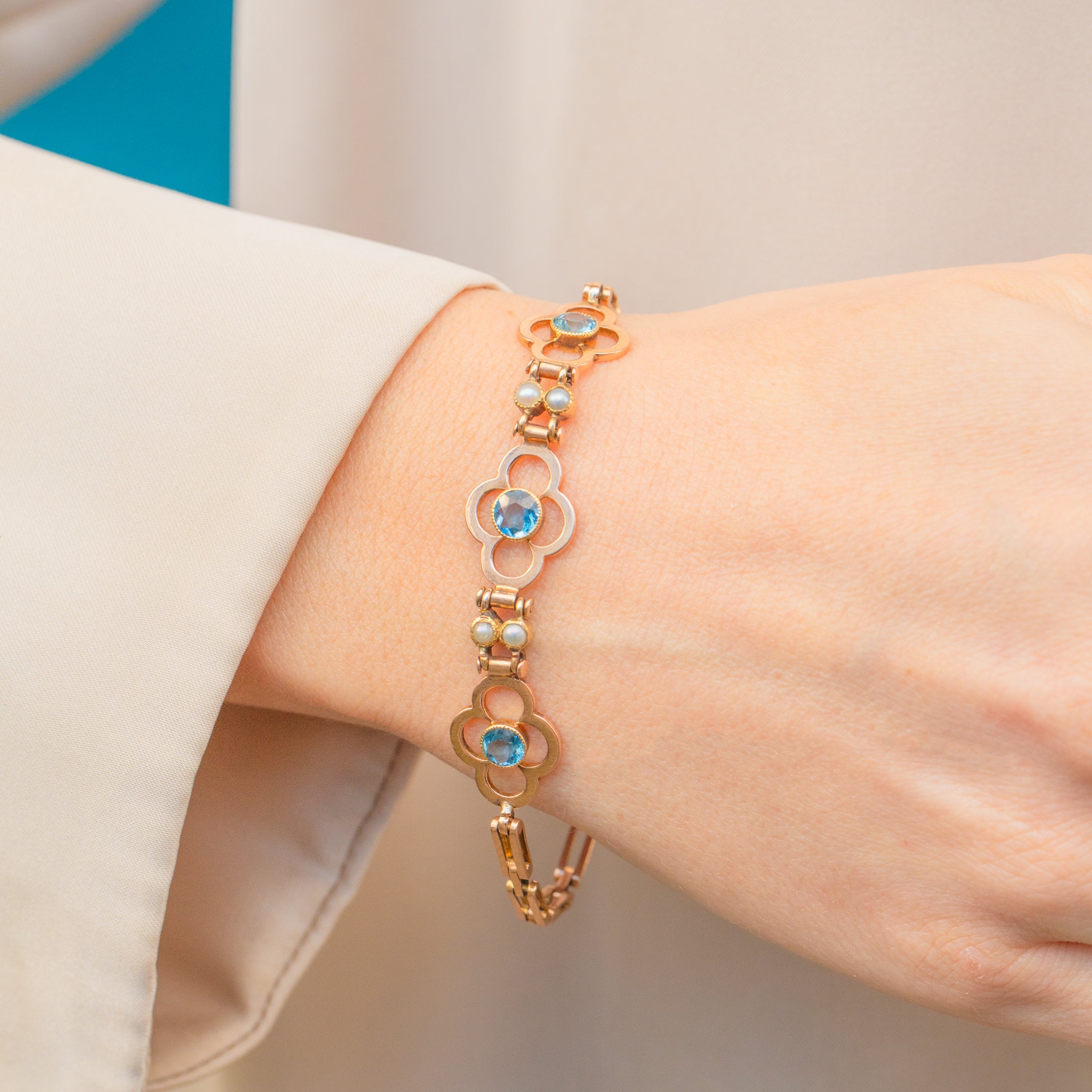 EXCELLENT. This Edwardian 15ct Gold Aquamarine and Pearl bracelet is in excellent condition. Each link is uniform and secure, and her gemstones sit securely within their settings. With little wear to note, she will make a wonderful addition to your collection!