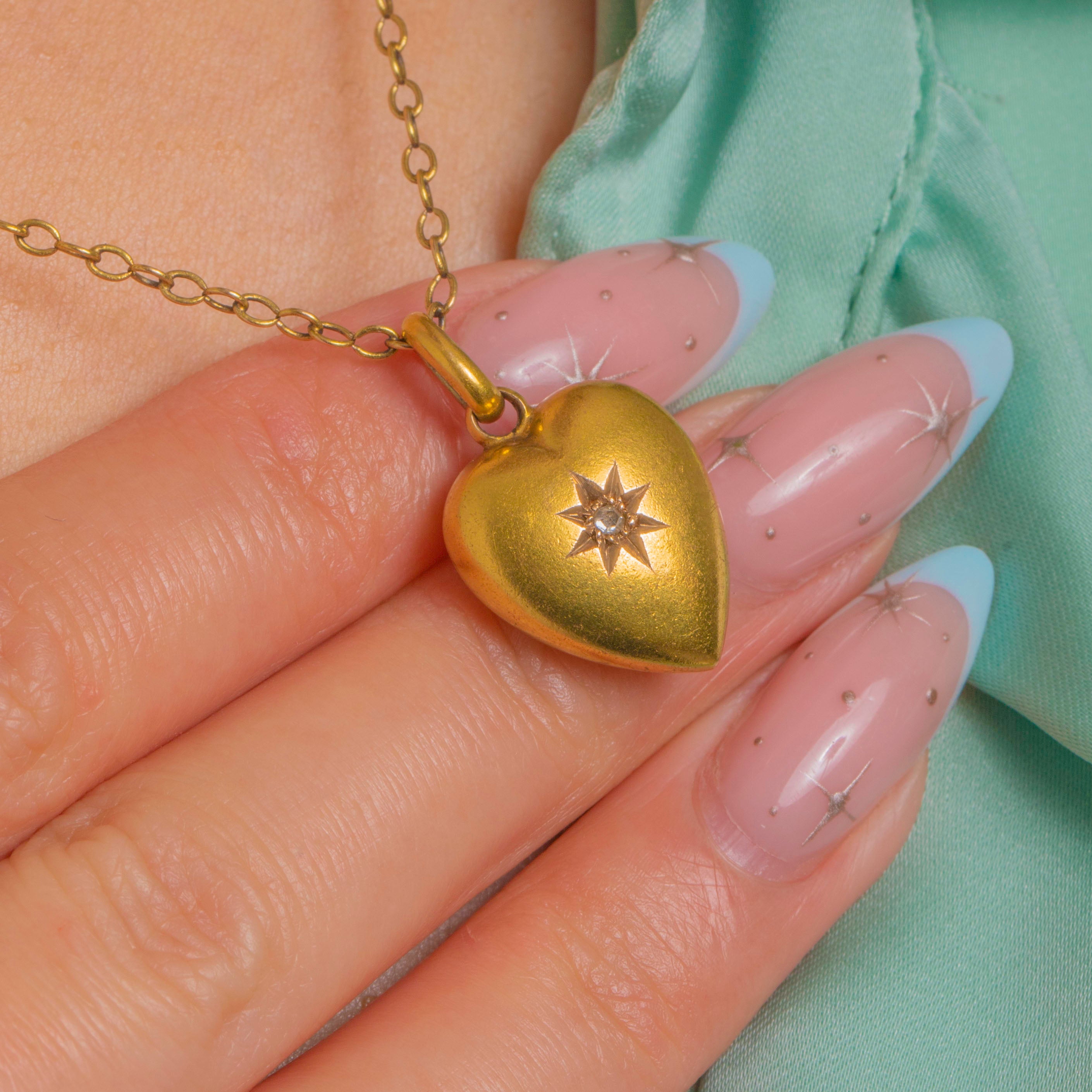 Beautifully made, the heart is topped with a hasp and jump-ring bail, the Diamond flush-set for a clean, refined look. Hallmarks to the reverse confirm Chester assay with a 1900 date, making this a timeless antique keepsake that layers effortlessly and wears with understated glow.