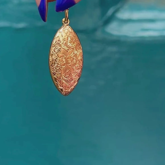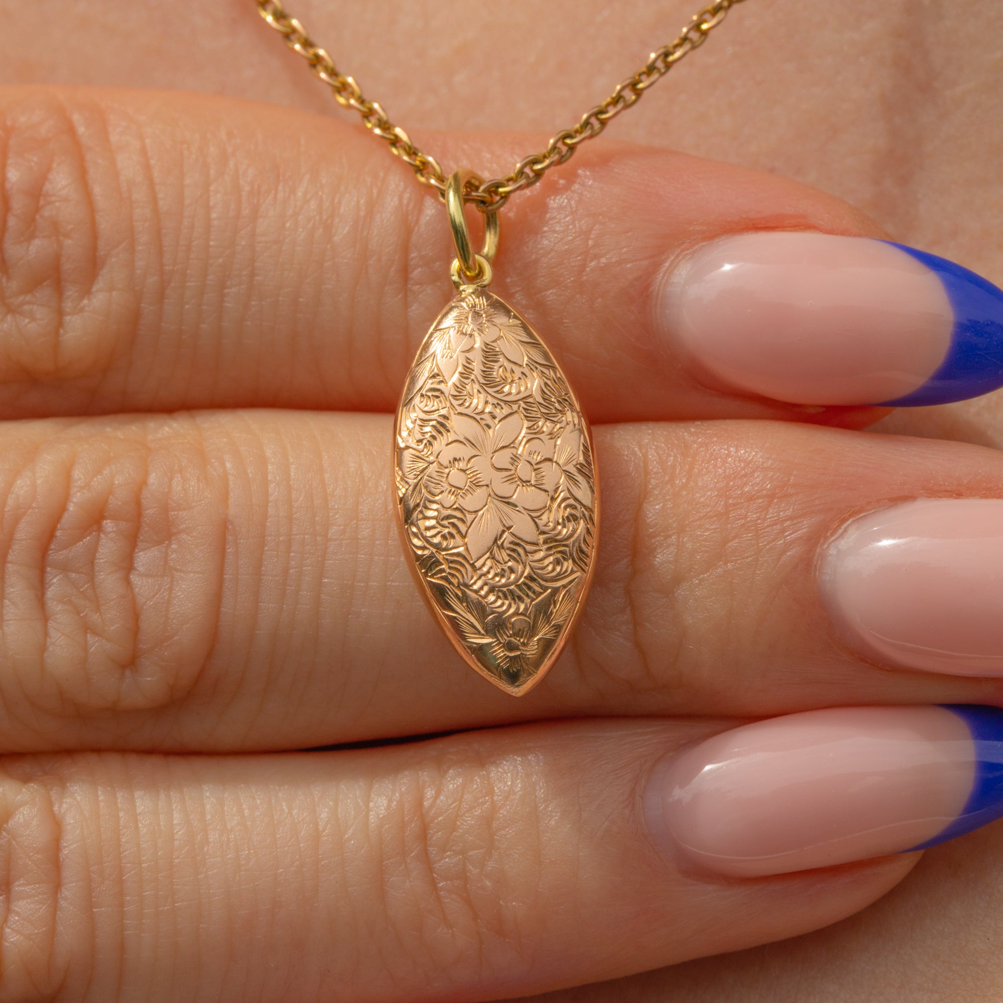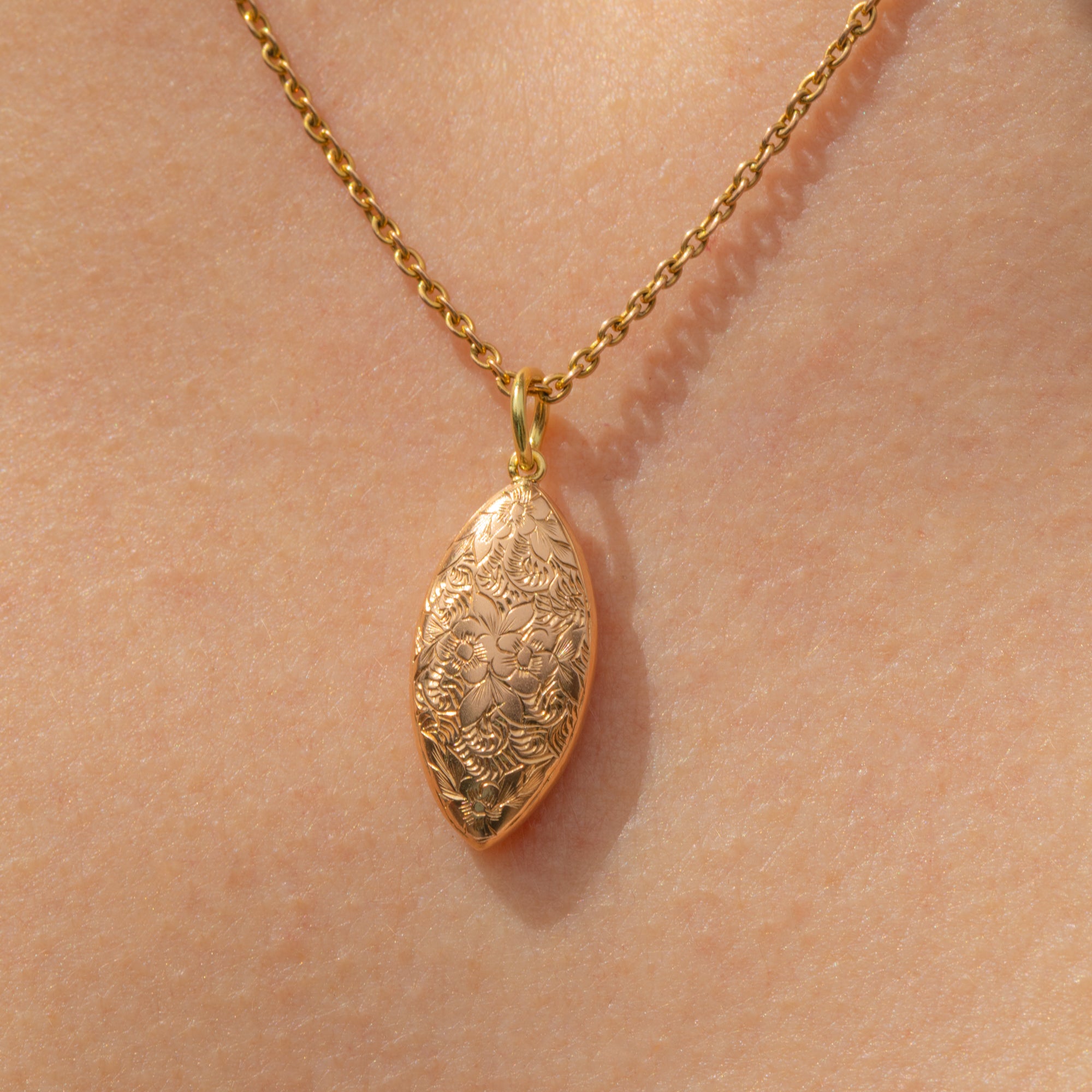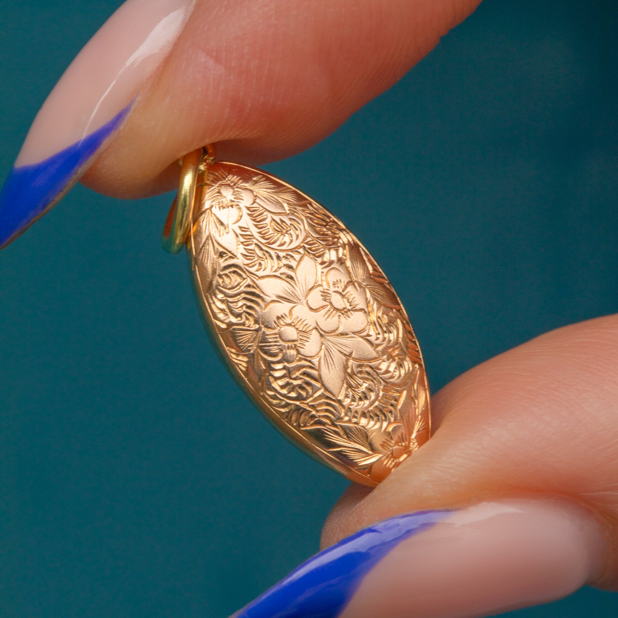 Bring an extra splash of Gold into your necklace stack with this Edwardian 15ct Gold floral engraved pendant, with her sleek lozenge form making for an elegant and timeless addition!