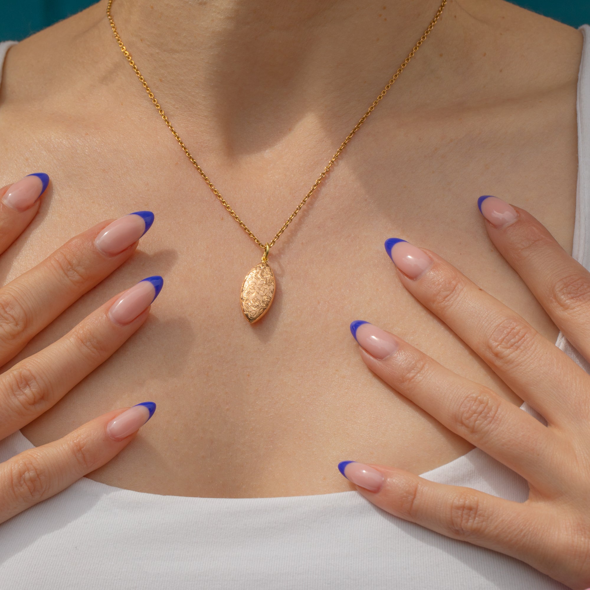 The front of this antique Gold pendant is inlaid with forget-me-not engravings, a flower with sweet romantic connotations. Crafted entirely from buttery 15ct Gold, the light shines across her glossy surface!
