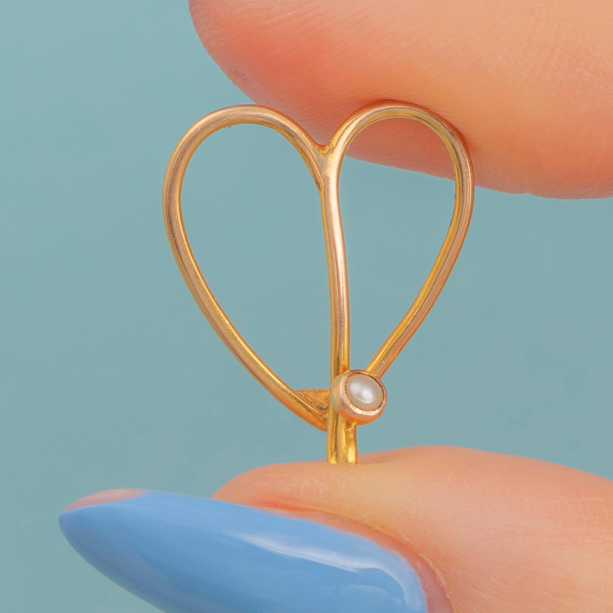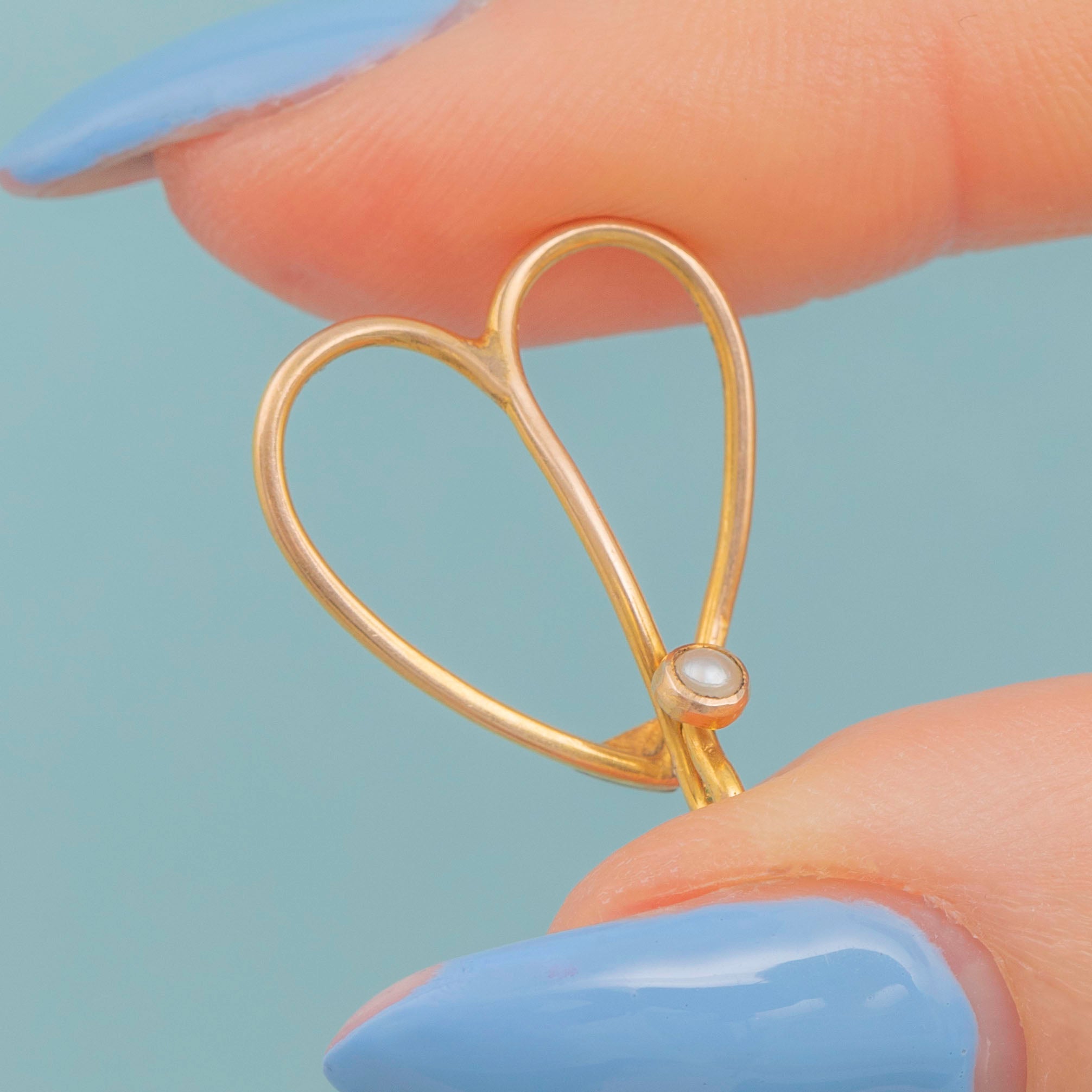 EXCELLENT. This Edwardian 15ct Gold heart slider pendant is in excellent condition. The pendant has retained its form well and the Gold is luscious with lovely reflective qualities. The Pearl is securely set and free from visible surface wear with its nacre fully intact. The 15CT stamp is clear and adds to this pendant's antique charm!