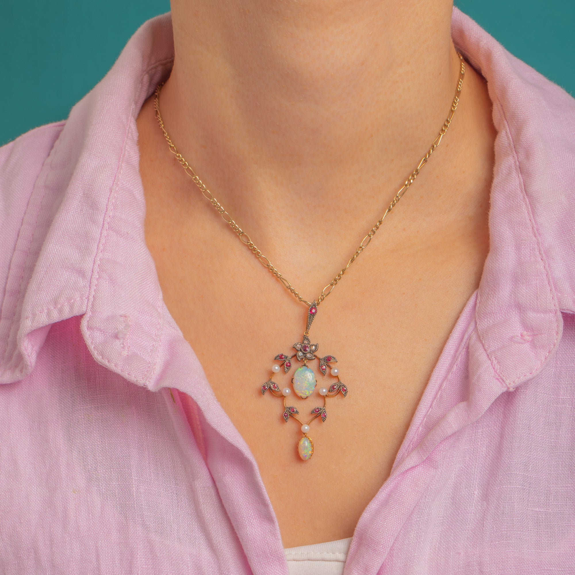 A dreamy Edwardian lavalier pendant, sculpted in 15ct Gold with Silver settings, its openwork foliate garland alive with delicate milgrain and pavé details. Two luminous Opal cabochons take centre stage, their milky bodies flashing blue, green and ember-orange, framed by twinkling Diamonds, vivid Ruby accents and tiny creamy Pearls.