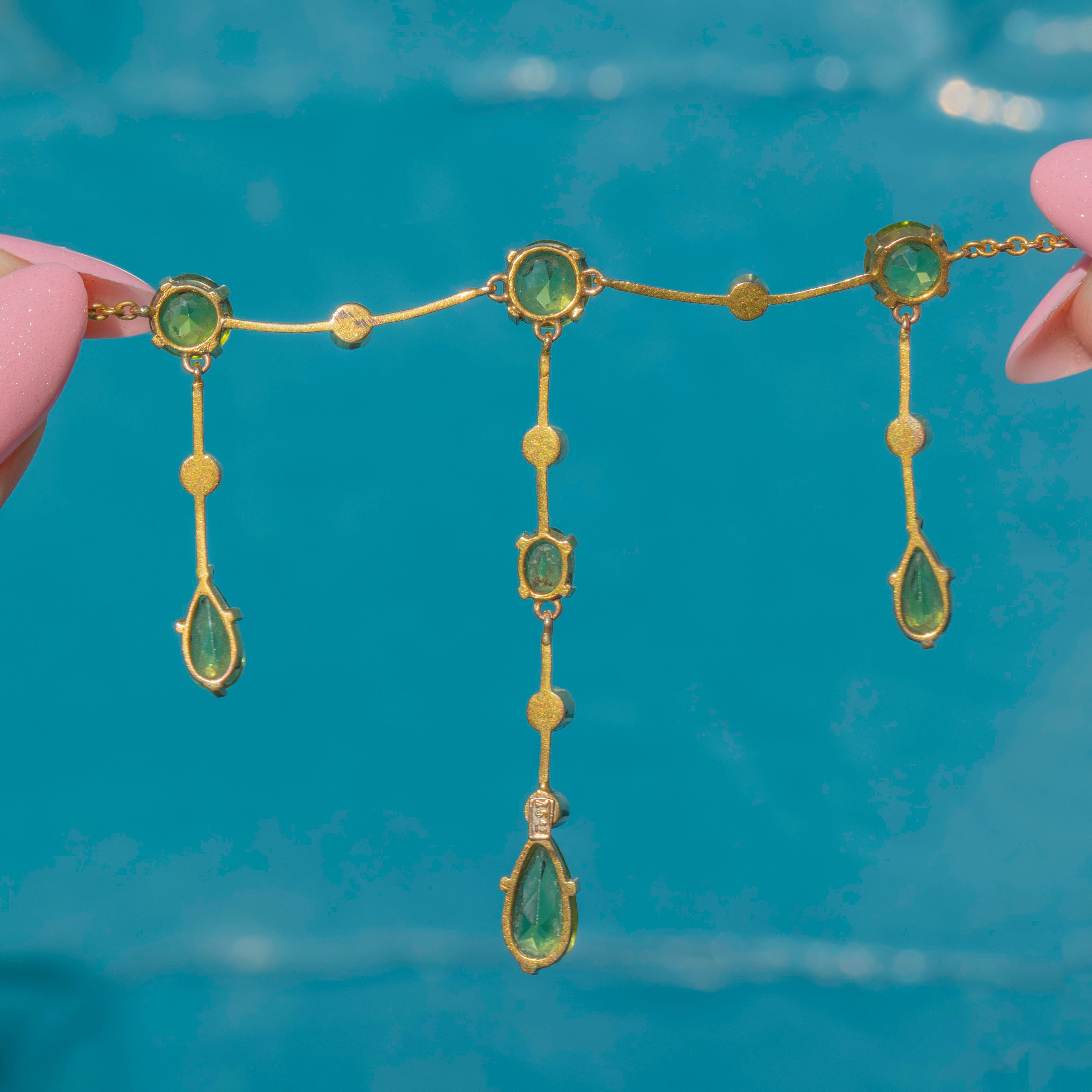 Each gorgeous Peridot is adorned by lustrous Pearls, adding a whimsical iridescence that gracefully complements the zesty gemstones. With a gorgeous fringe design, this antique necklace is the epitome of elegance and a stellar example of Edwardian craftsmanship!