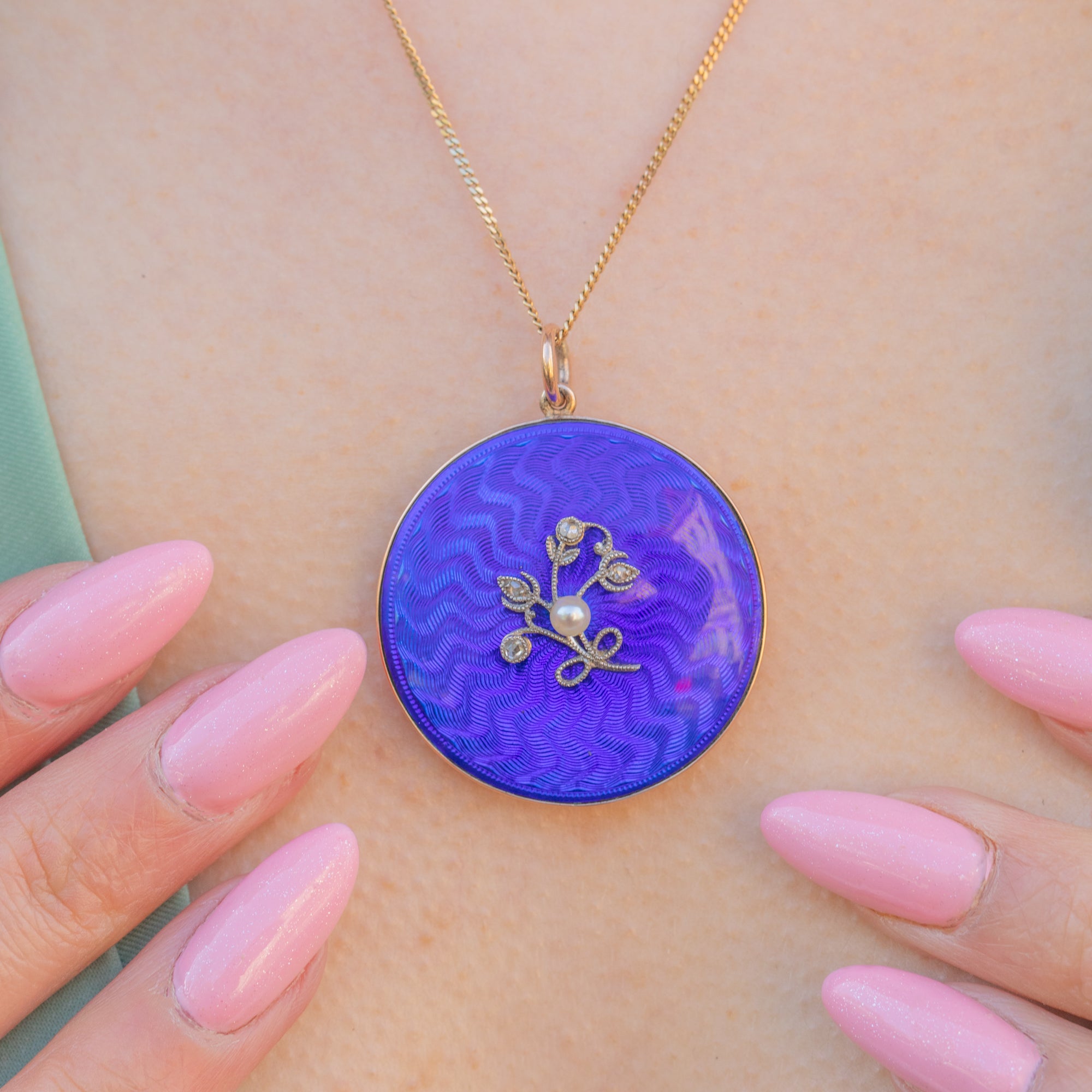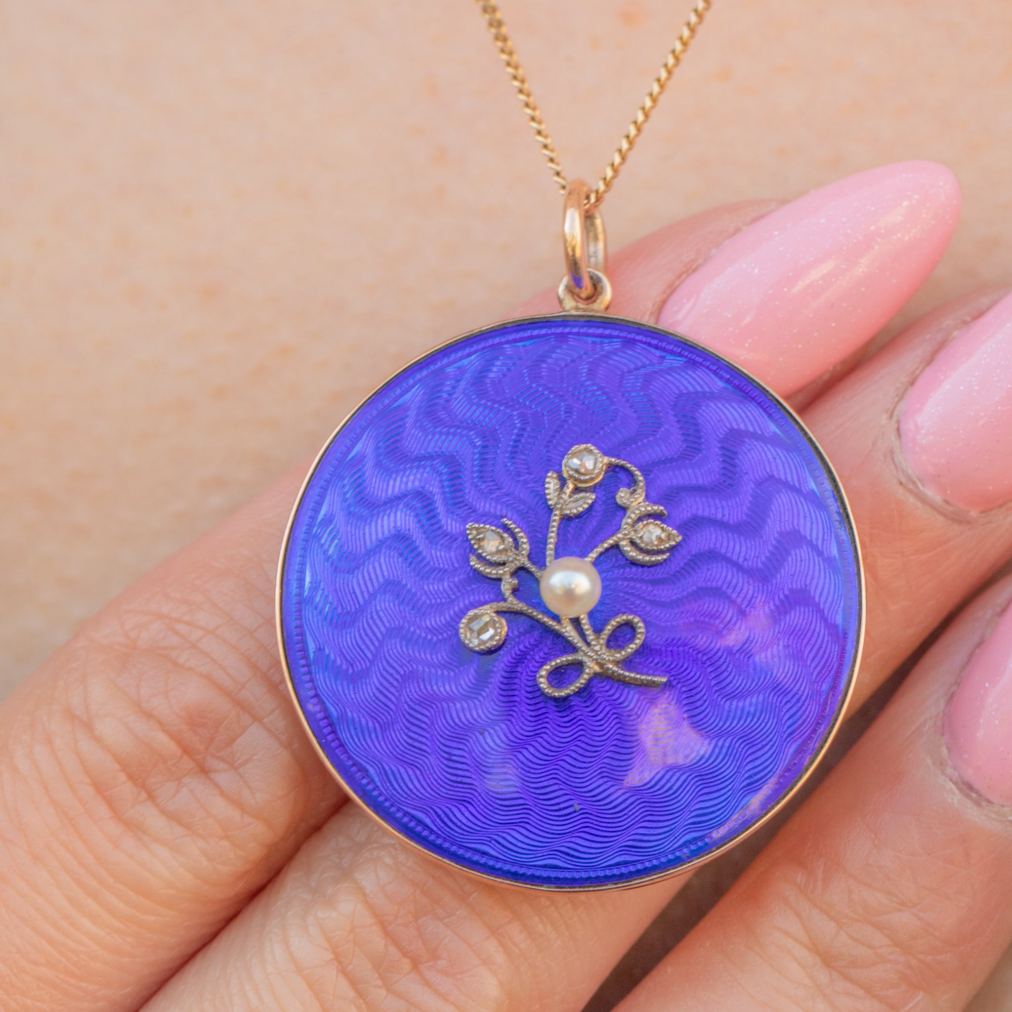 Edwardian 15ct Gold Royal Blue Guilloche Enamel Locket with Pearl Diamond Flower