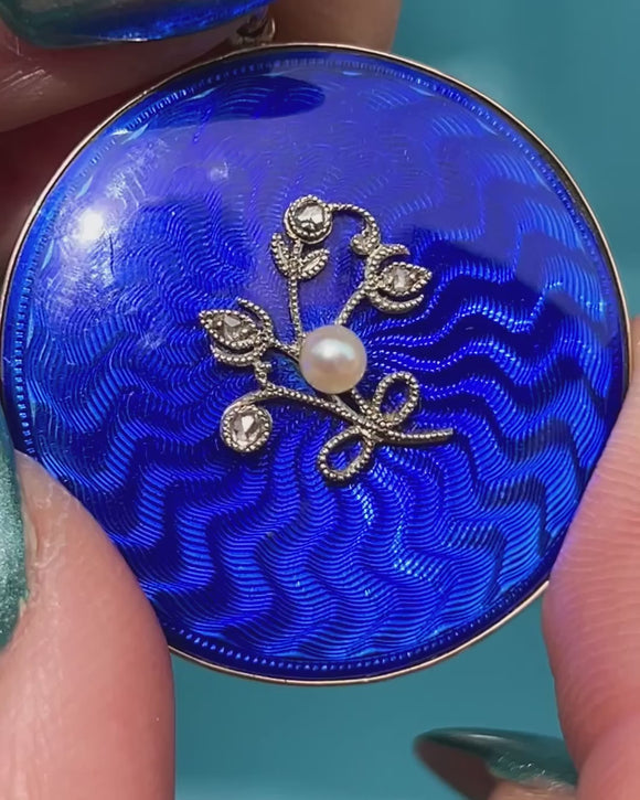 Edwardian 15ct Gold Royal Blue Guilloche Enamel Locket with Pearl Diamond Flower Item added