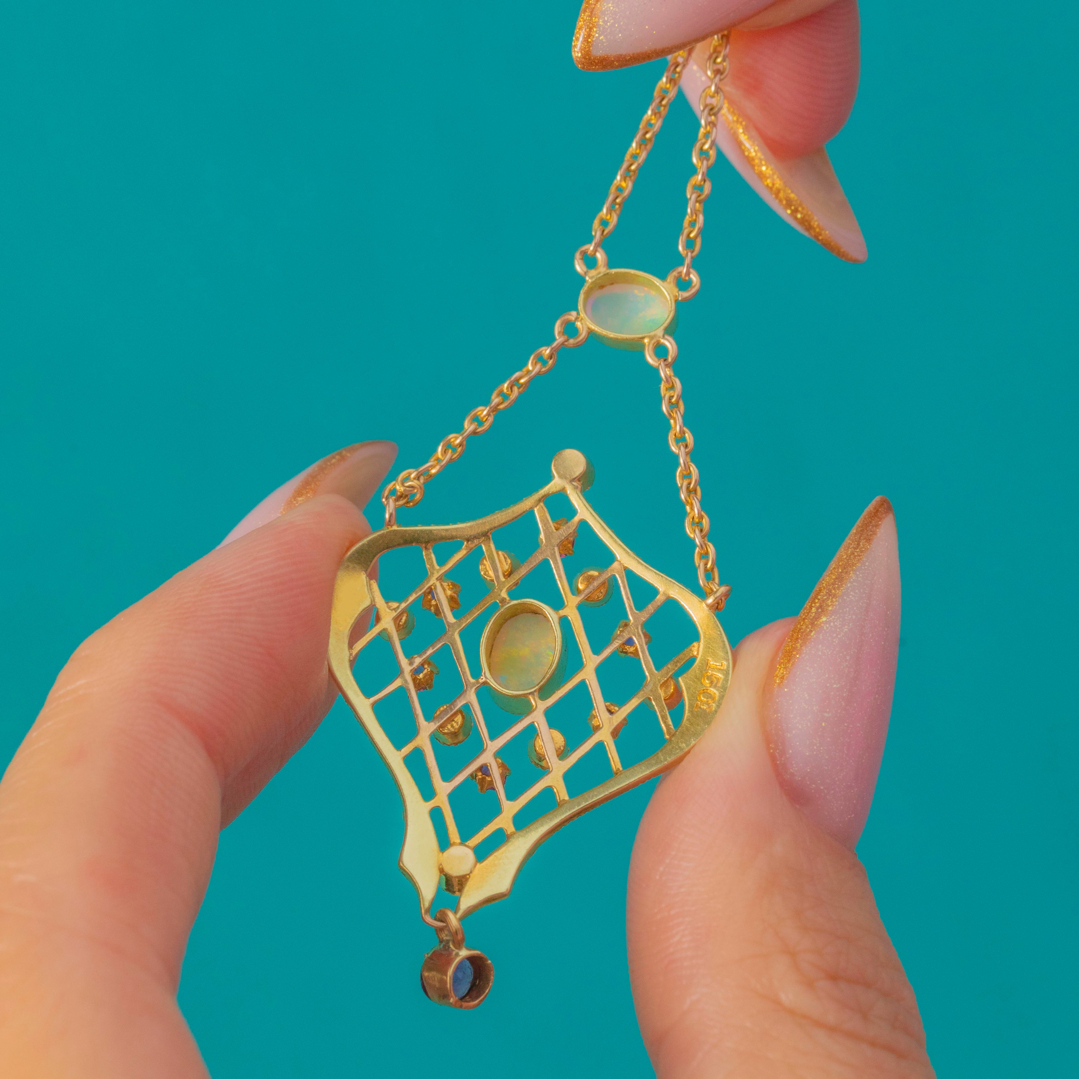 This exquisite Edwardian pendant necklace captures the grace and refinement of early 20th-century design. Crafted in rich 15ct Gold, the pendant features a delicate lattice pattern set with glowing Opals, romantic Rubies, and dainty Seed Pearls.