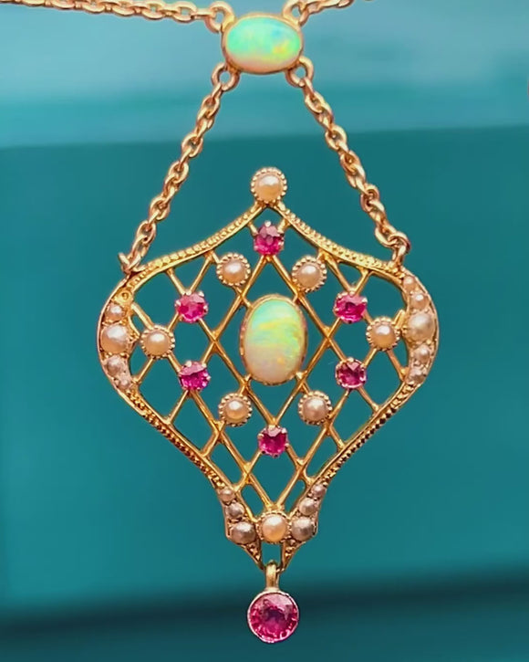 EXCELLENT: This Edwardian necklace is in superb condition with all gemstones original and securely set. The Gold retains its lovely antique hue, and the chain and clasp are strong and secure. The Opals display bright play-of-colour, the Rubies rich tone, and the Pearls excellent lustre. A wonderful and wearable example of Edwardian elegance.