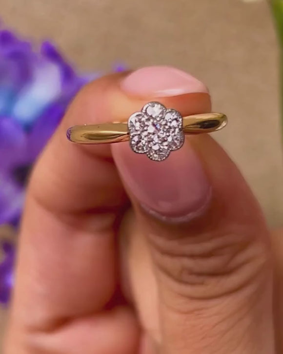 Sweet and dainty, this Edwardian 18ct Gold Diamond cluster ring will make a timeless addition to any antique jewellery collection! Seven Diamonds dance beneath the light in a feminine floral formation, inlaid into Platinum settings.
