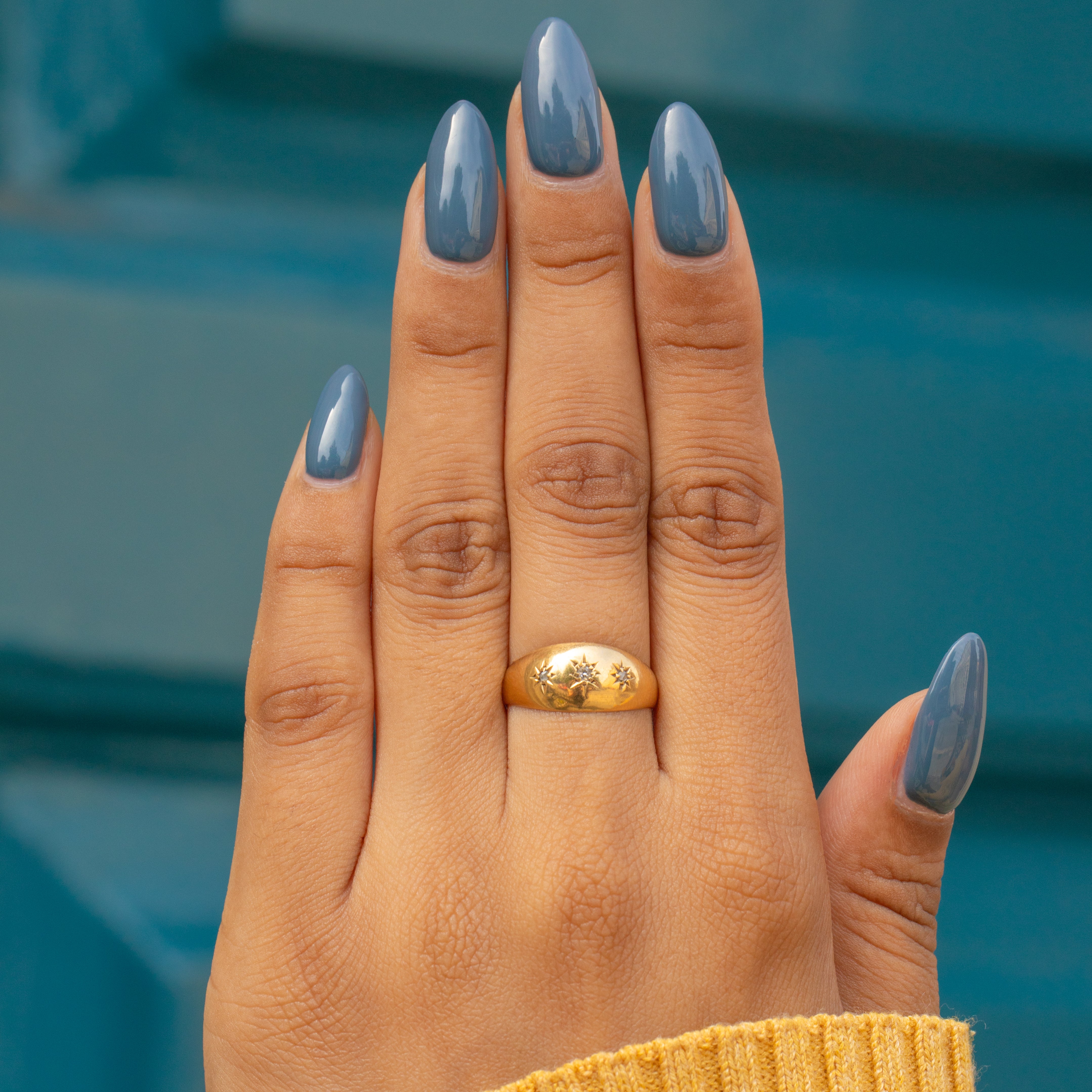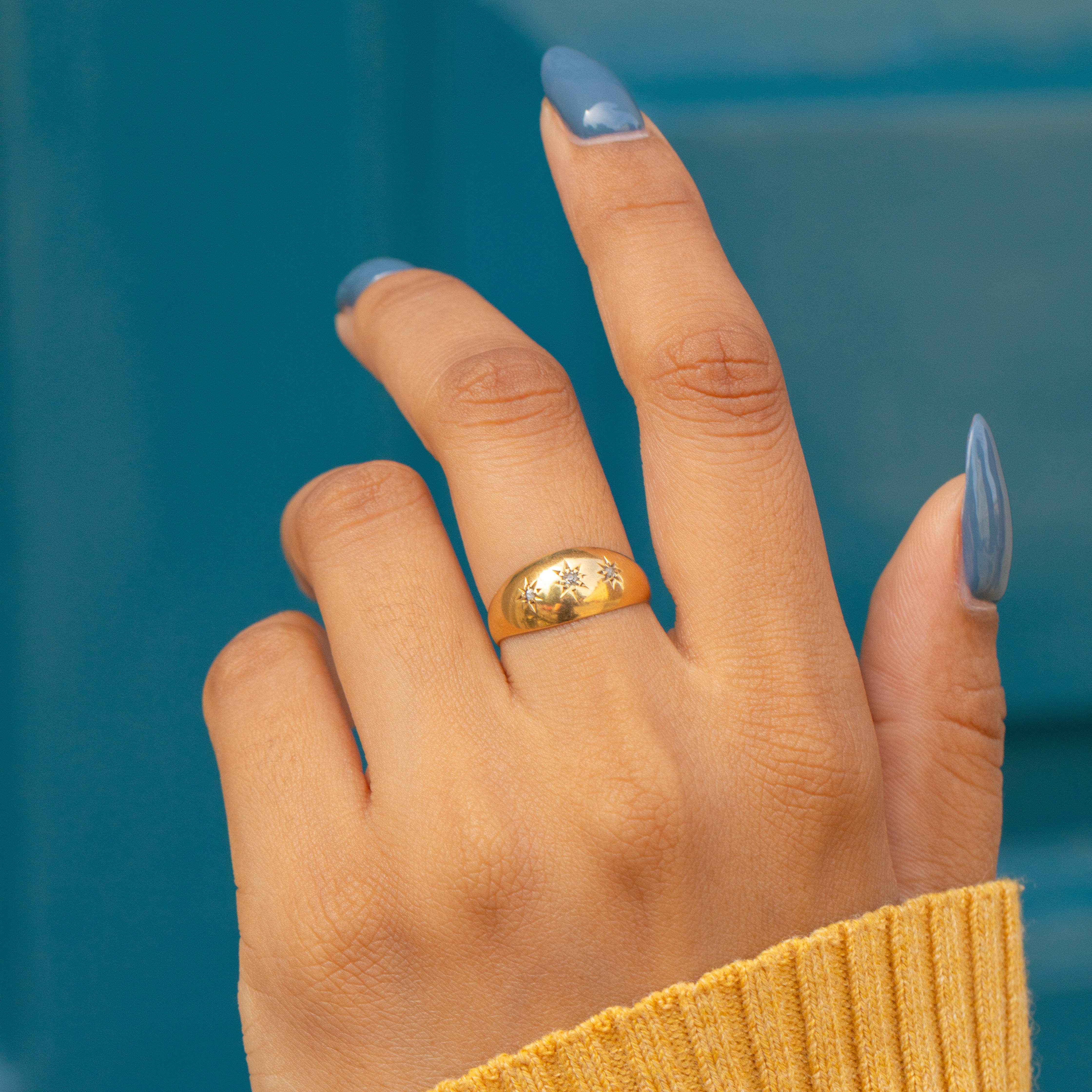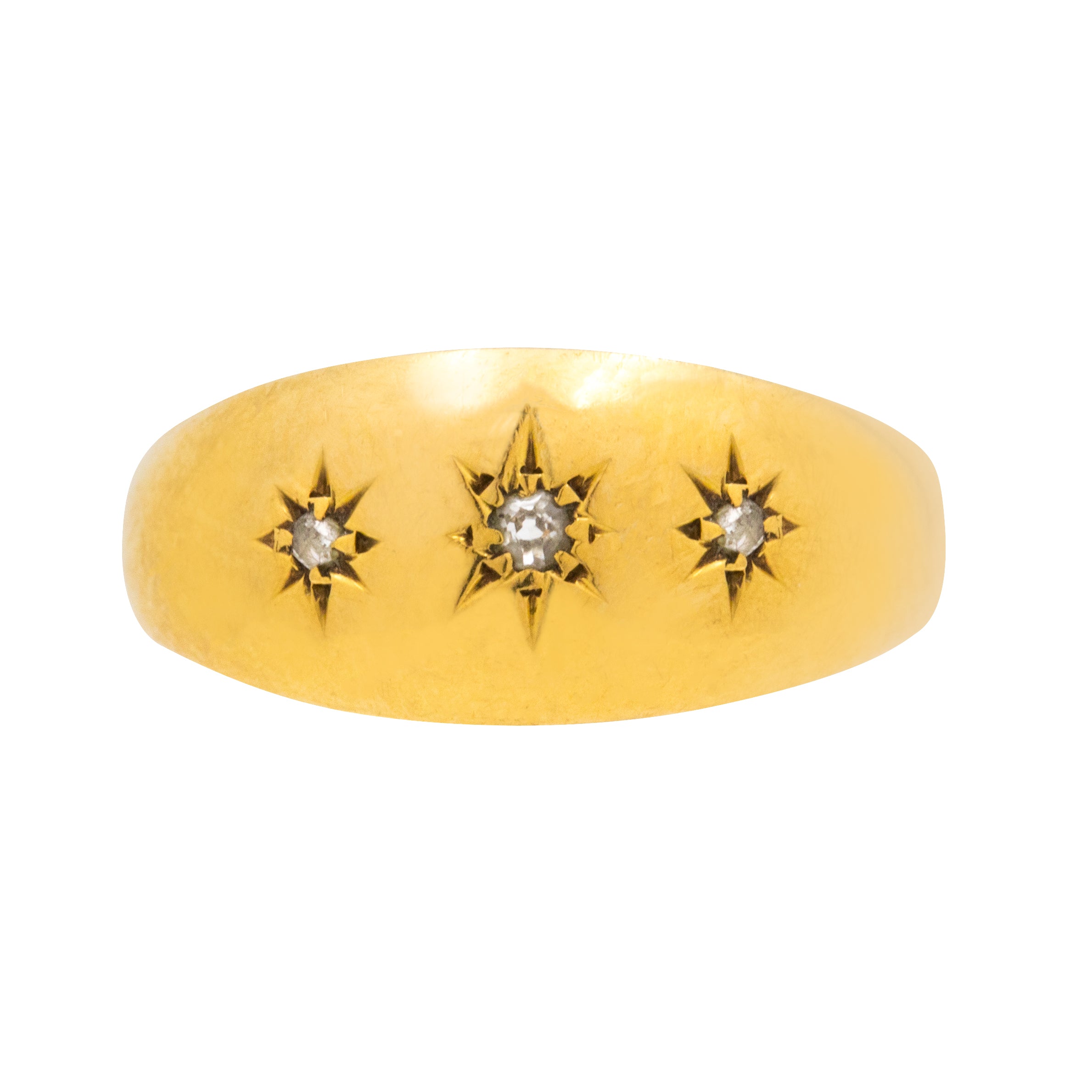 Complete with a Diamond trilogy displayed within classic star settings, this Edwardian gypsy ring is crafted entirely from honey-hued 18ct Gold, and with her plump form, she won't go un-missed as she adorns your hand!