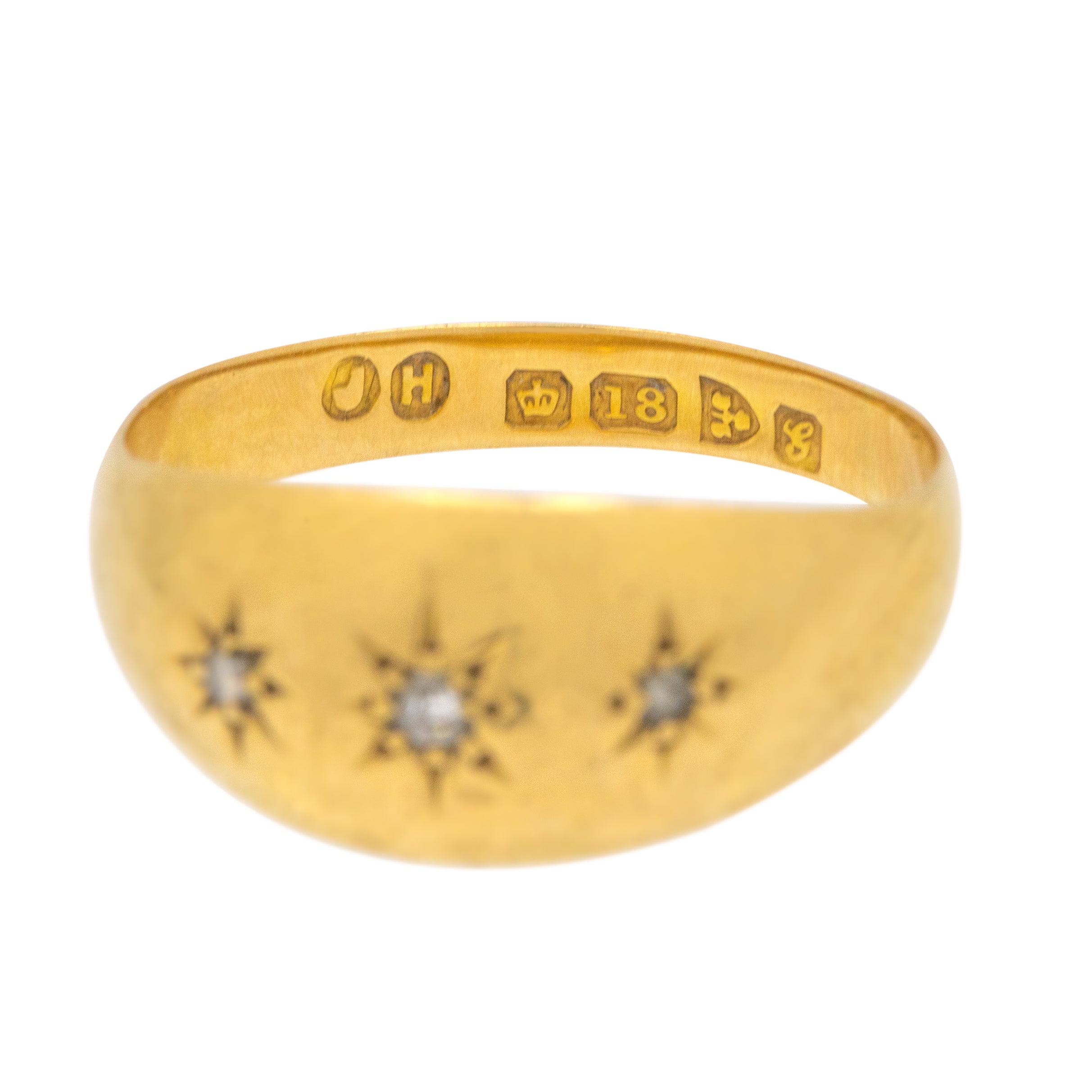 VERY GOOD. This Edwardian 18ct Gold Diamond gypsy ring is offered in very good condition. A sure must-have, this piece has three pretty rose-cut Diamonds, all in gypsy settings. The ring has been beautifully crafted and is fully hallmarked. There is a resize mark visible on the back of the band to the inside, but it is smooth and only noticeable under close inspection. Anyone would be jealous to see you in possession of this antique Diamond three stone ring!