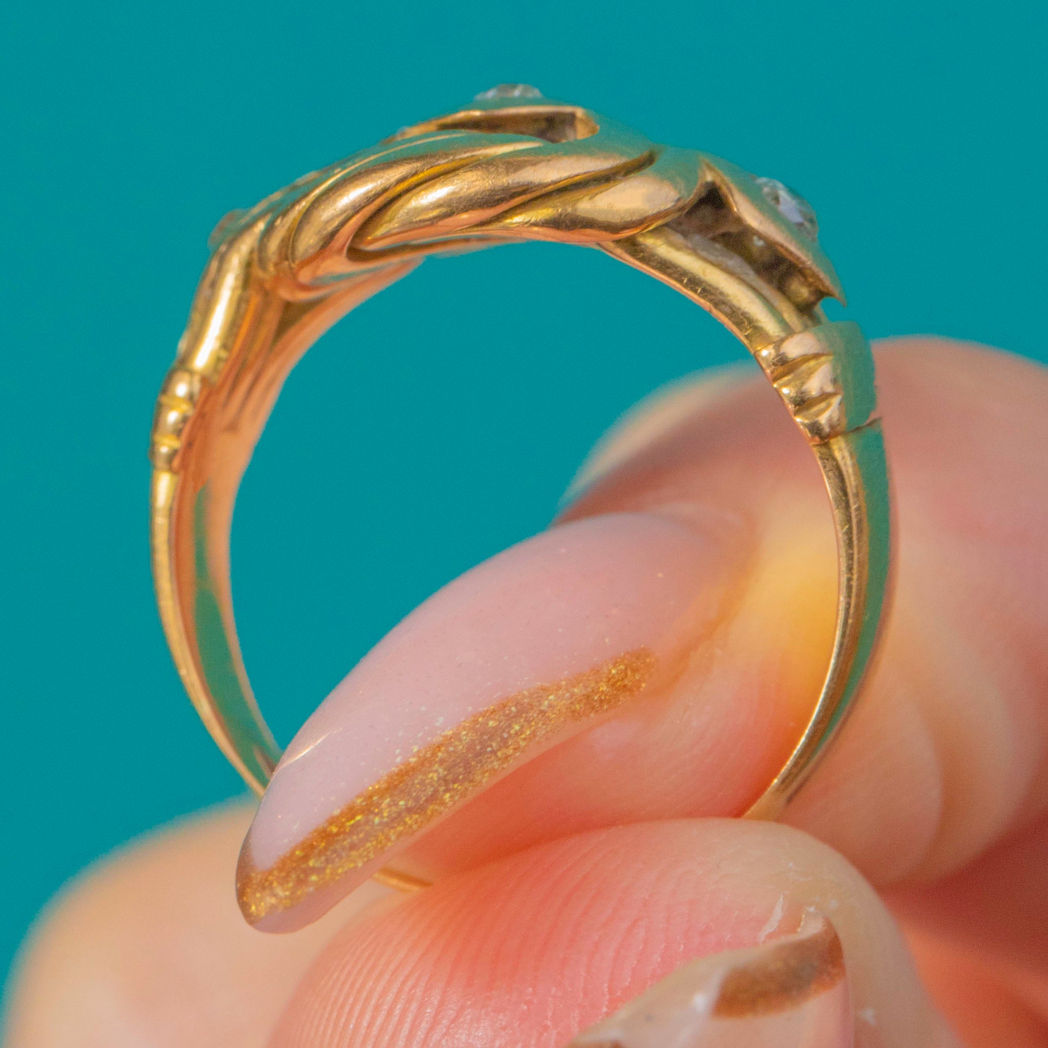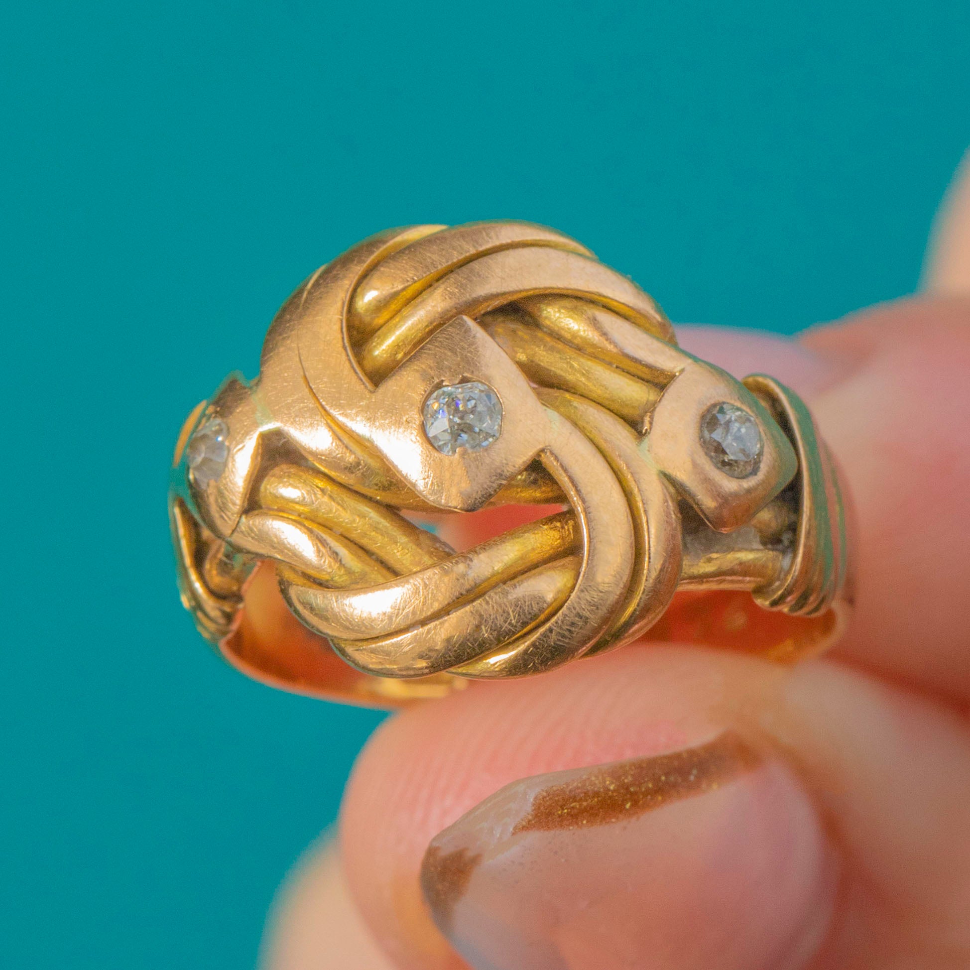 This Edwardian 18ct Gold knot ring is a beautifully romantic token of love, crafted c.1910. The knot motif symbolises unity and devotion, its soft curves wrapped around a trio of sparkling Old Mine Cut Diamonds.
