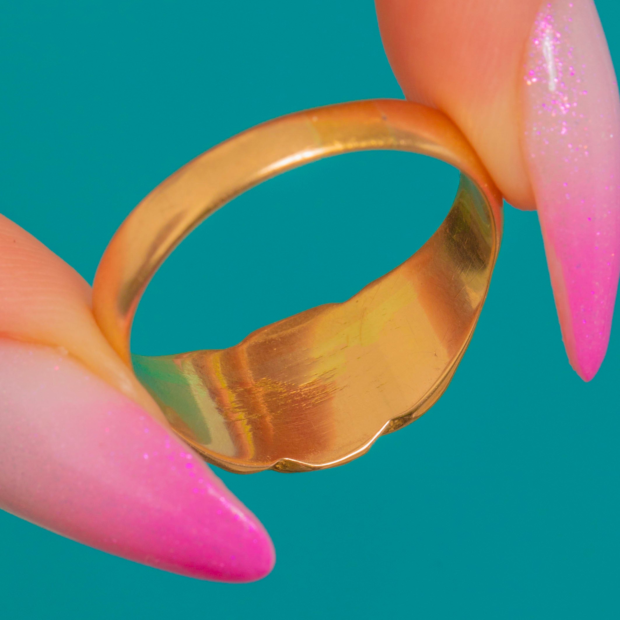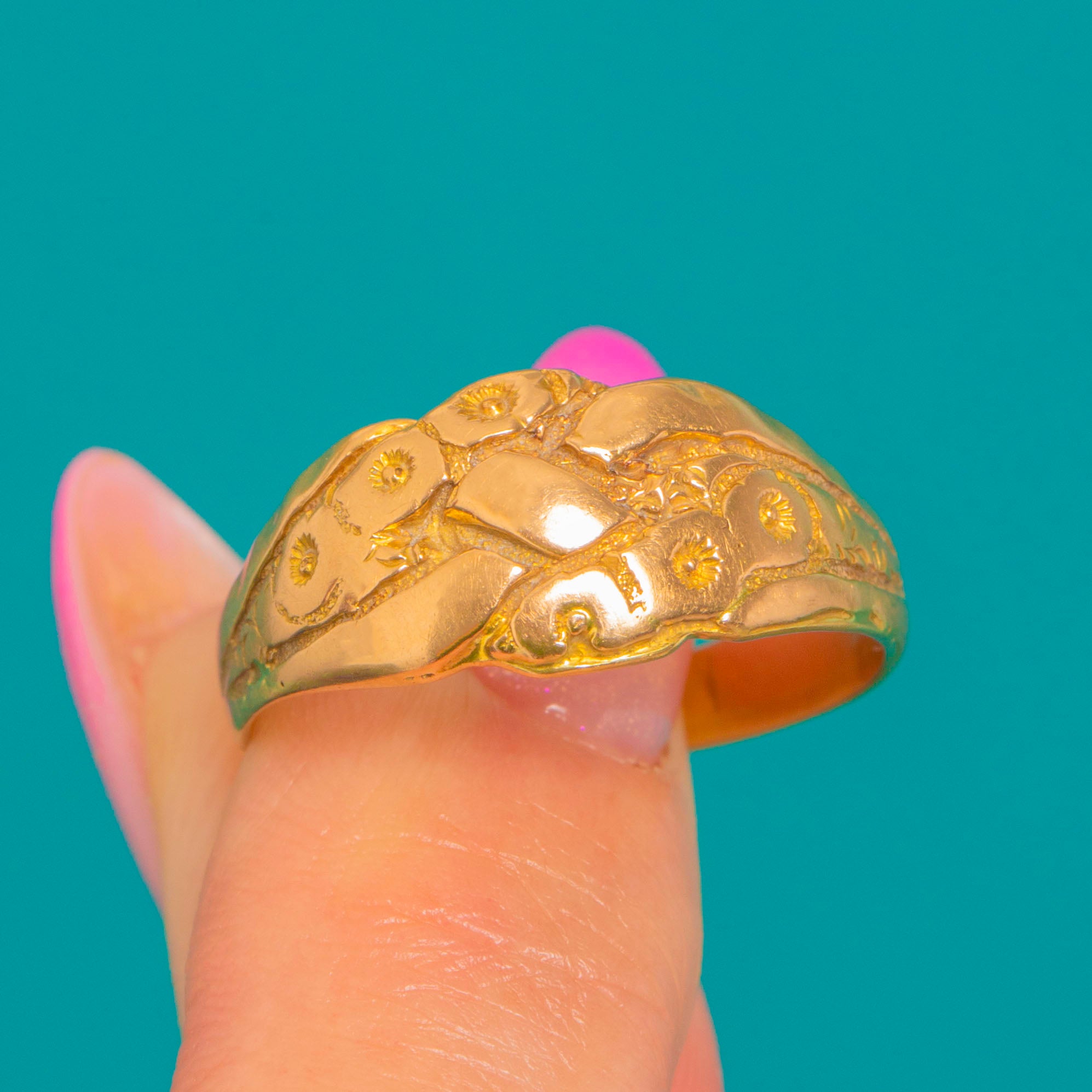 VERY GOOD: The Gold shows light surface wear and gentle softening to the raised details with a pleasing patina in the recesses, consistent with age. Evidence of a past resize to the shank; structurally sound with no obvious dents or repairs observed.