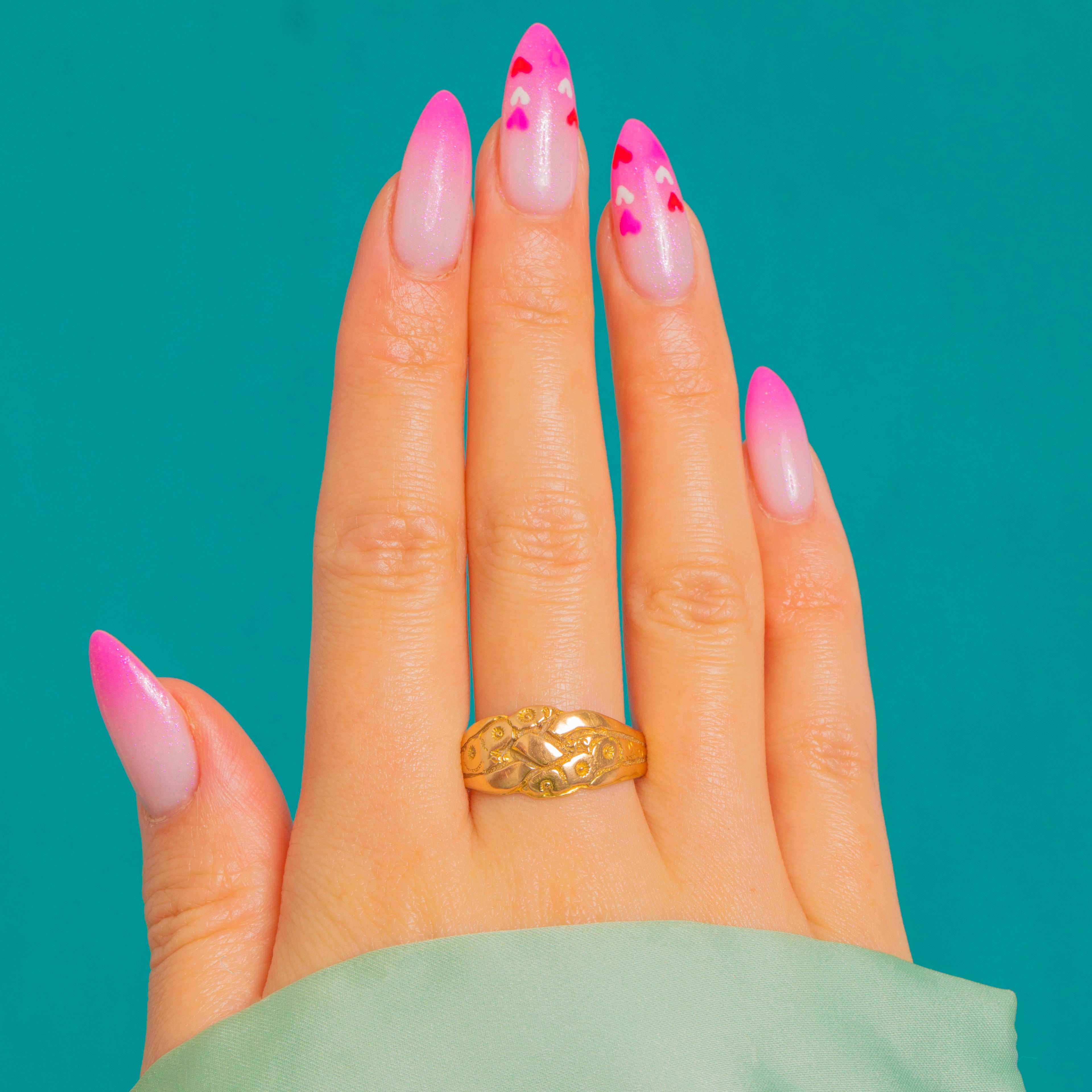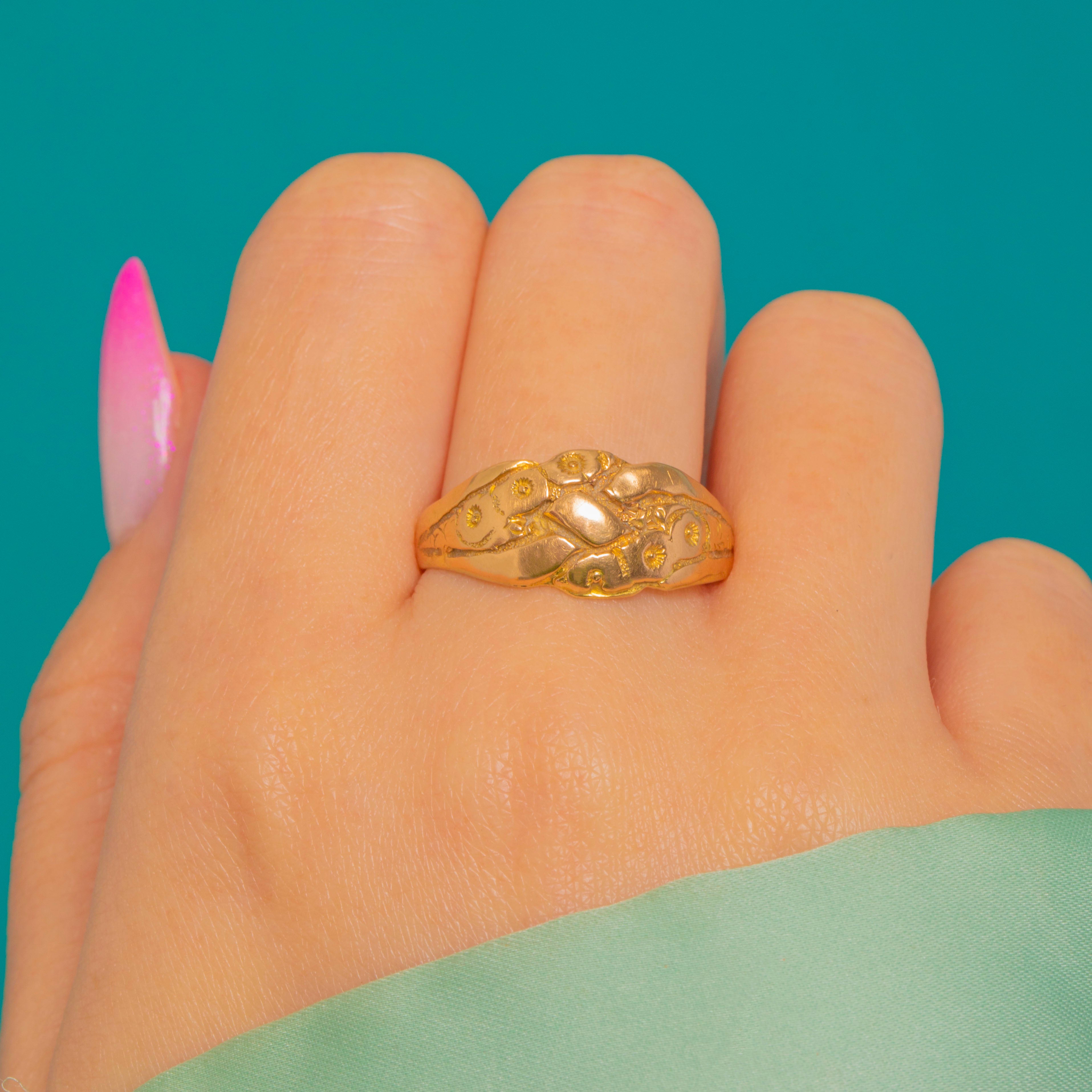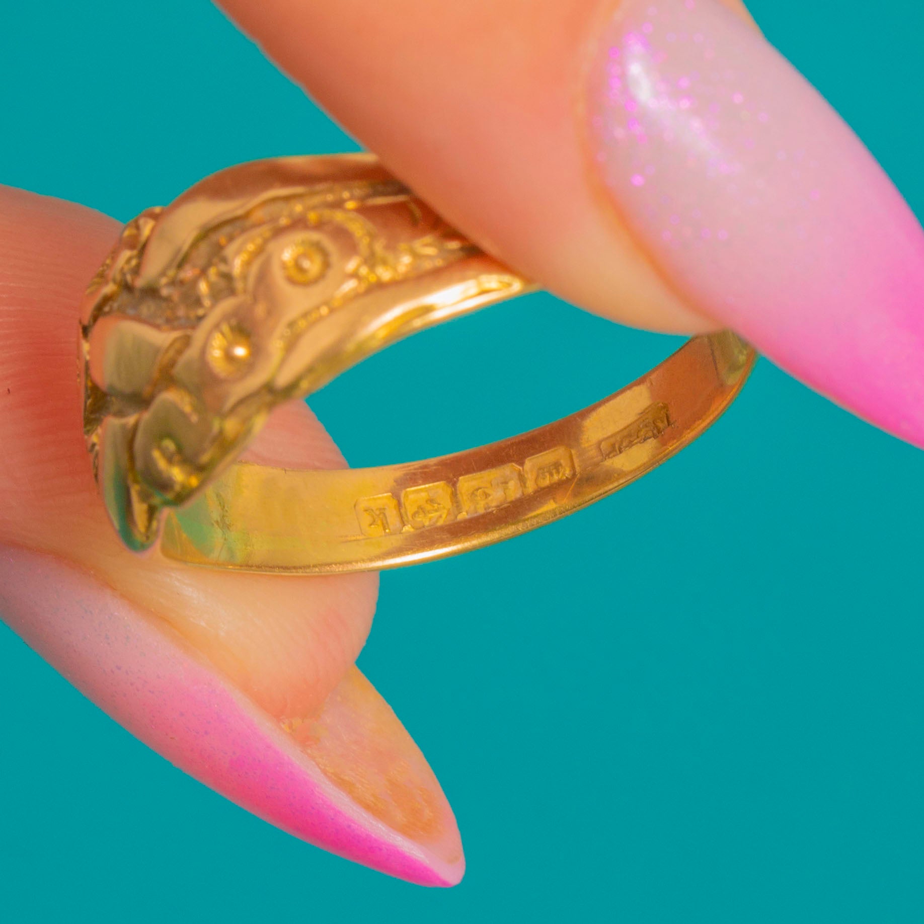 A beautifully expressive Edwardian 18ct Gold knot ring, hallmarked in Birmingham and dating to 1909. The band is enriched with sculptural, chased scrolls and delicate punched dot details, creating a wonderfully tactile, heritage feel. Its warm Gold and softly aged patina accentuate the relief, giving depth and romance to the design.
