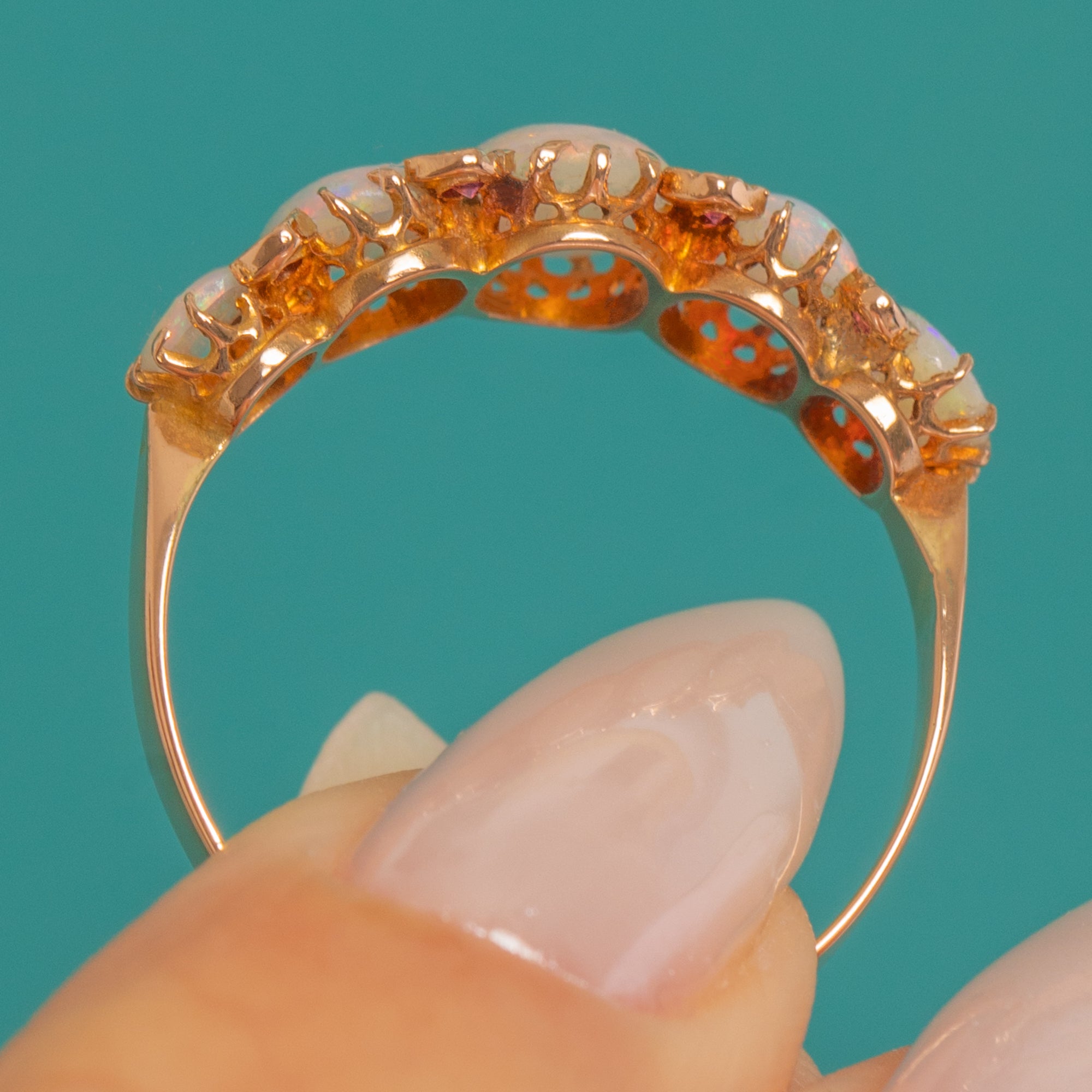 Edwardian 18ct Gold Opal Five-Stone Ring with Ruby Spacers