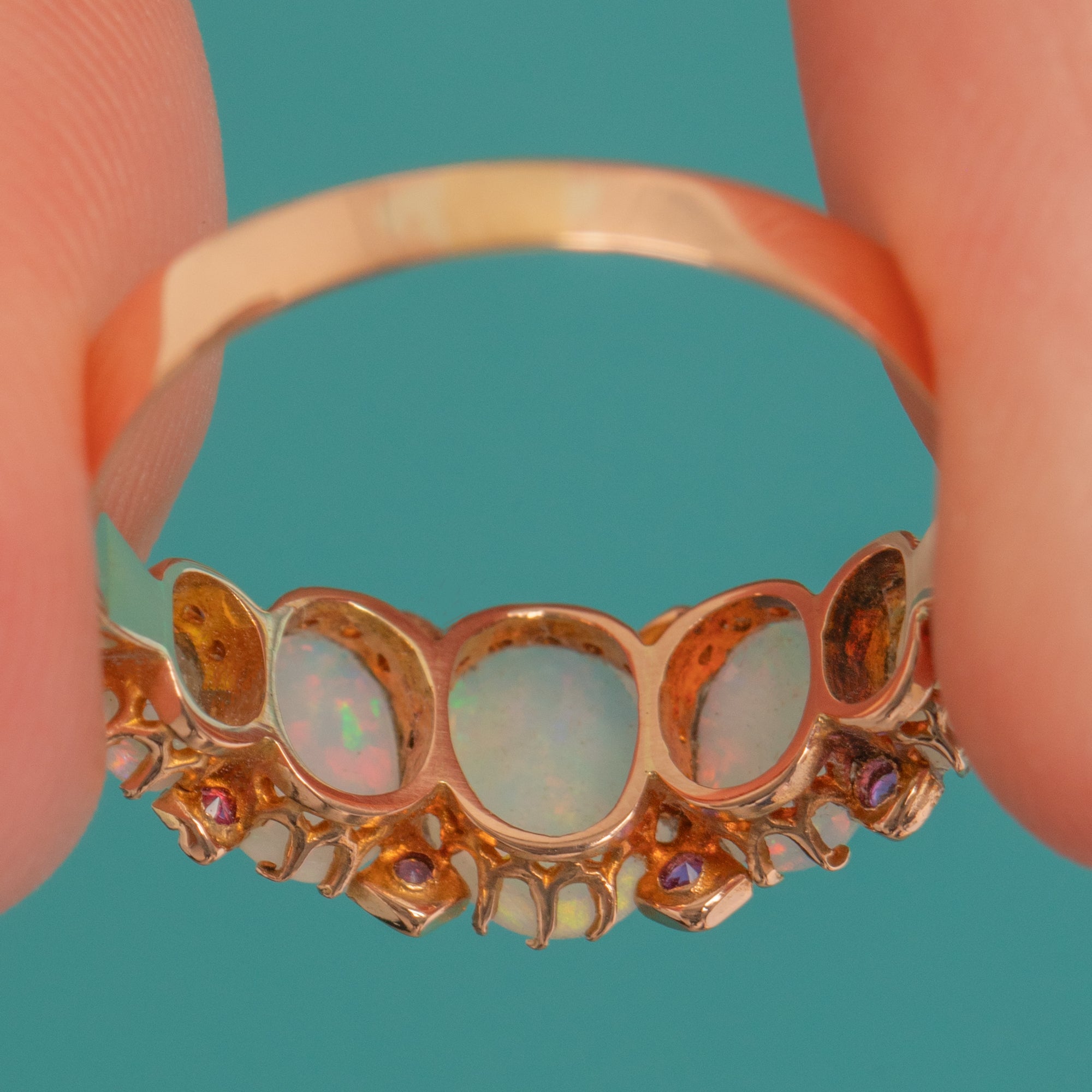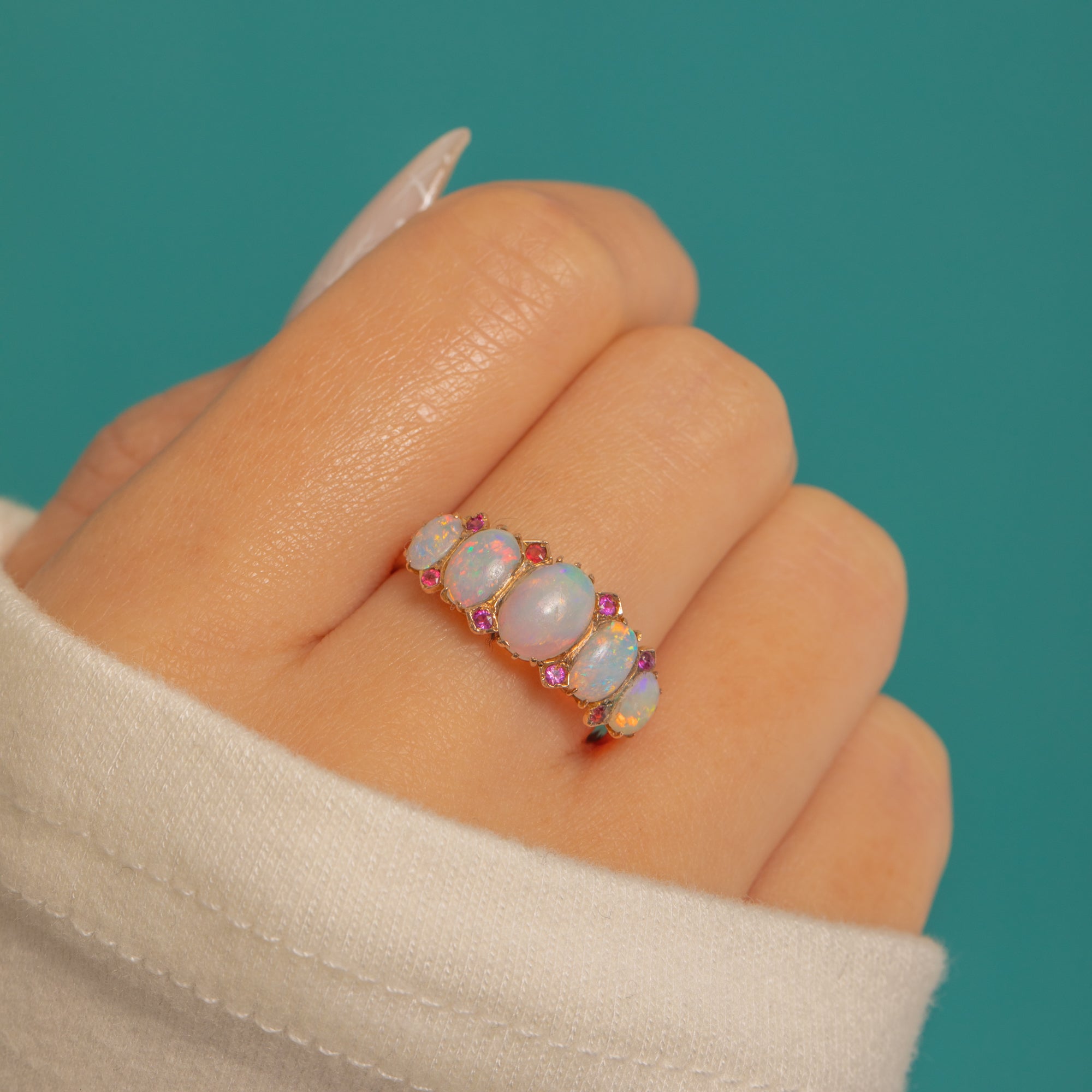 A luminous Edwardian five-stone ring in rich 18ct Gold, glowing with a graduated row of Natural Solid Opals alive with flashes of green, blue, pink and orange. Pretty Ruby spacers punctuate the line, their bright pink-red sparkle adding a joyful pop of colour between each cabochon.