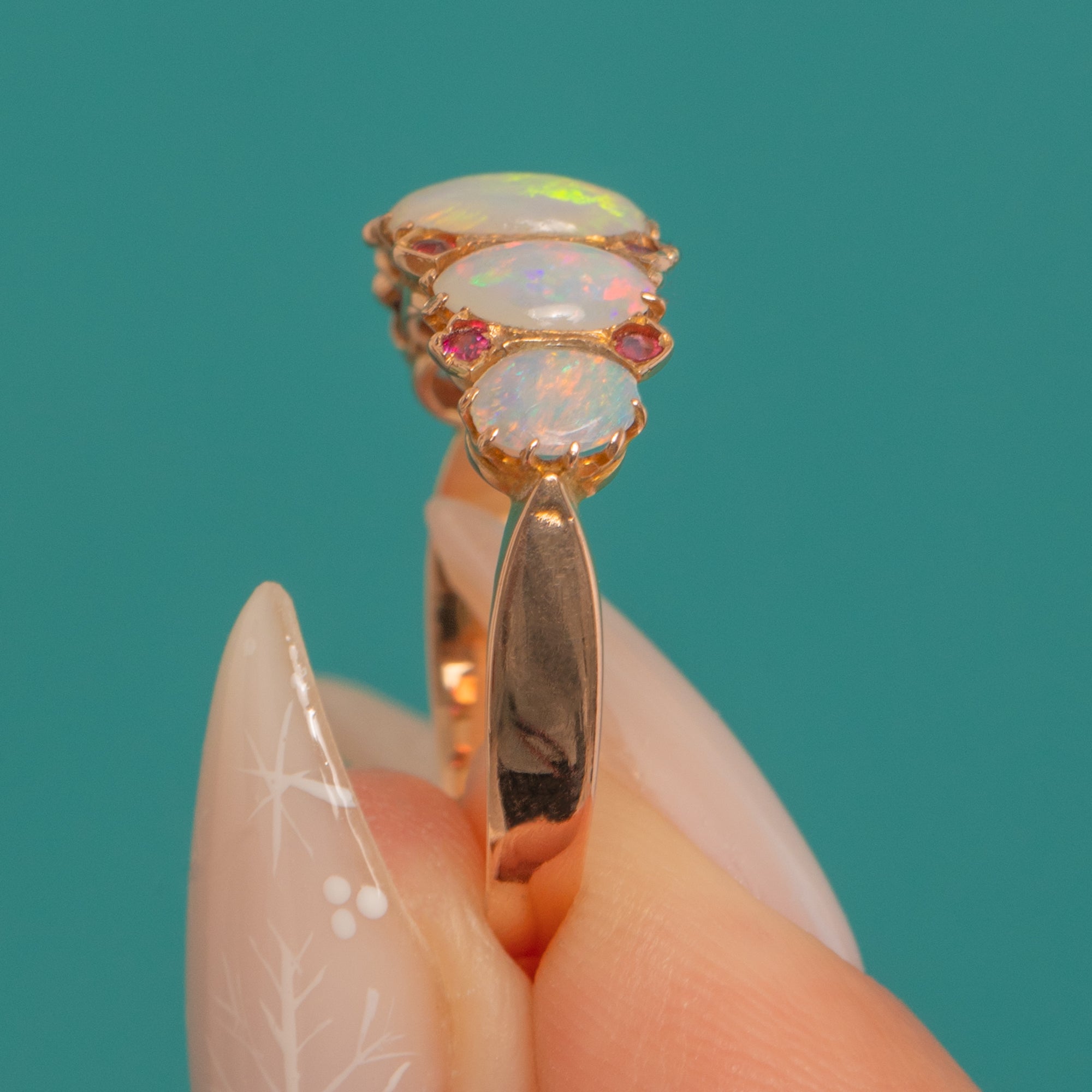 EXCELLENT: Opals are bright with minimal surface wear; Rubies are lively and well-matched. The coronet settings and claws are secure, and the shank is smooth with only light signs of wear consistent with age. No obvious resizing or restoration marks observed.