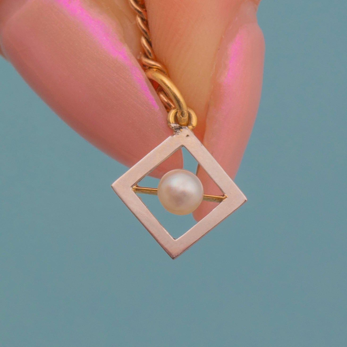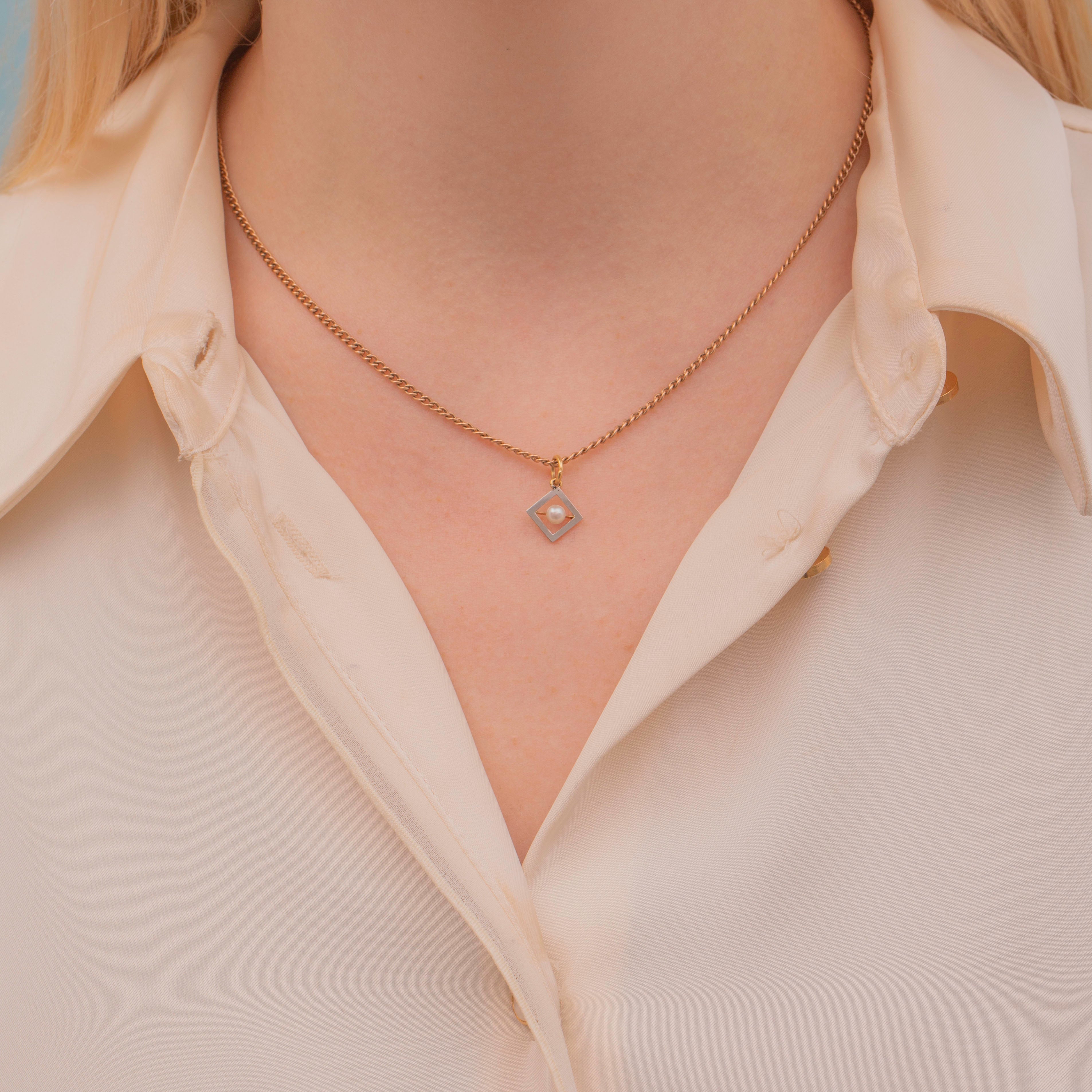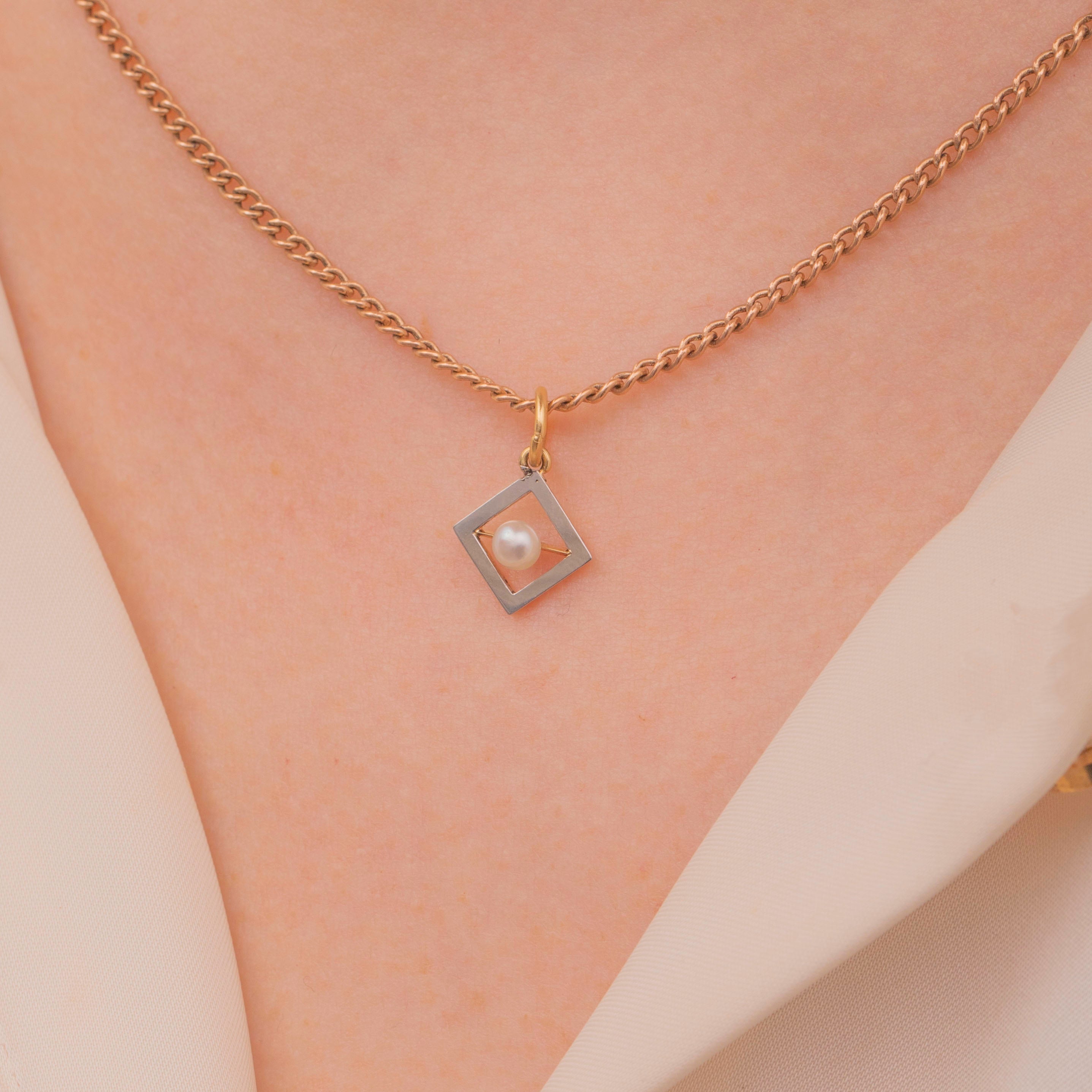 Crafted from lustrous 18ct Gold and a radiant Platinum front, she features a creamy Pearl in her centre that catches the light wonderfully. Suspended from a fine chain, this little geometric Edwardian charm is the perfect dainty, versatile piece to add to your collection.