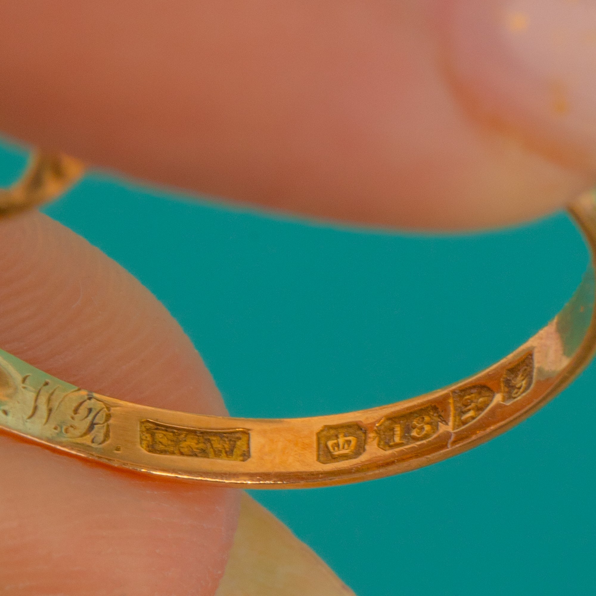 HALLMARKS: Crown, 18, Chester Assay Office, date letter G (1907–1908), maker’s mark E&W.