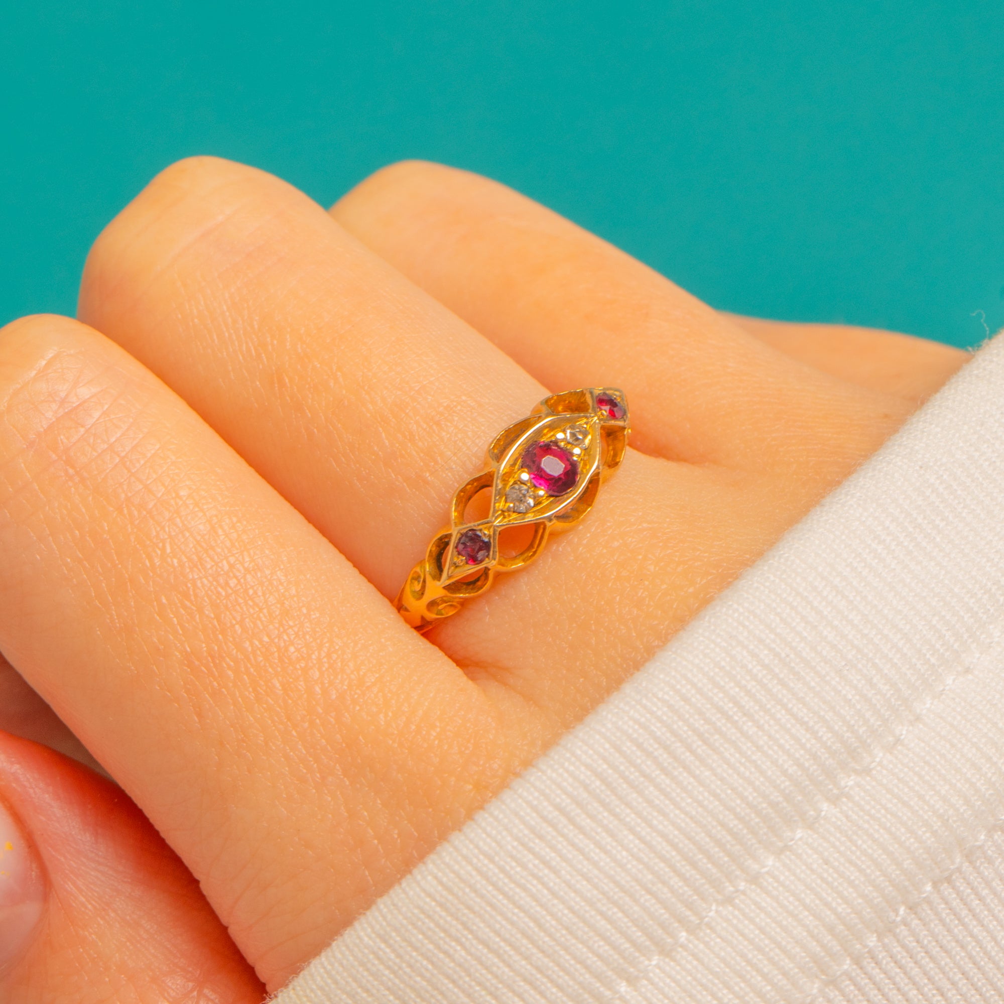 EXCELLENT: The Rubies and Diamonds are in excellent condition with only minimal, age-appropriate surface wear visible under magnification. The settings and band remain crisp and well-shaped with no signs of thinning. The ring has been well cared for and presents beautifully.