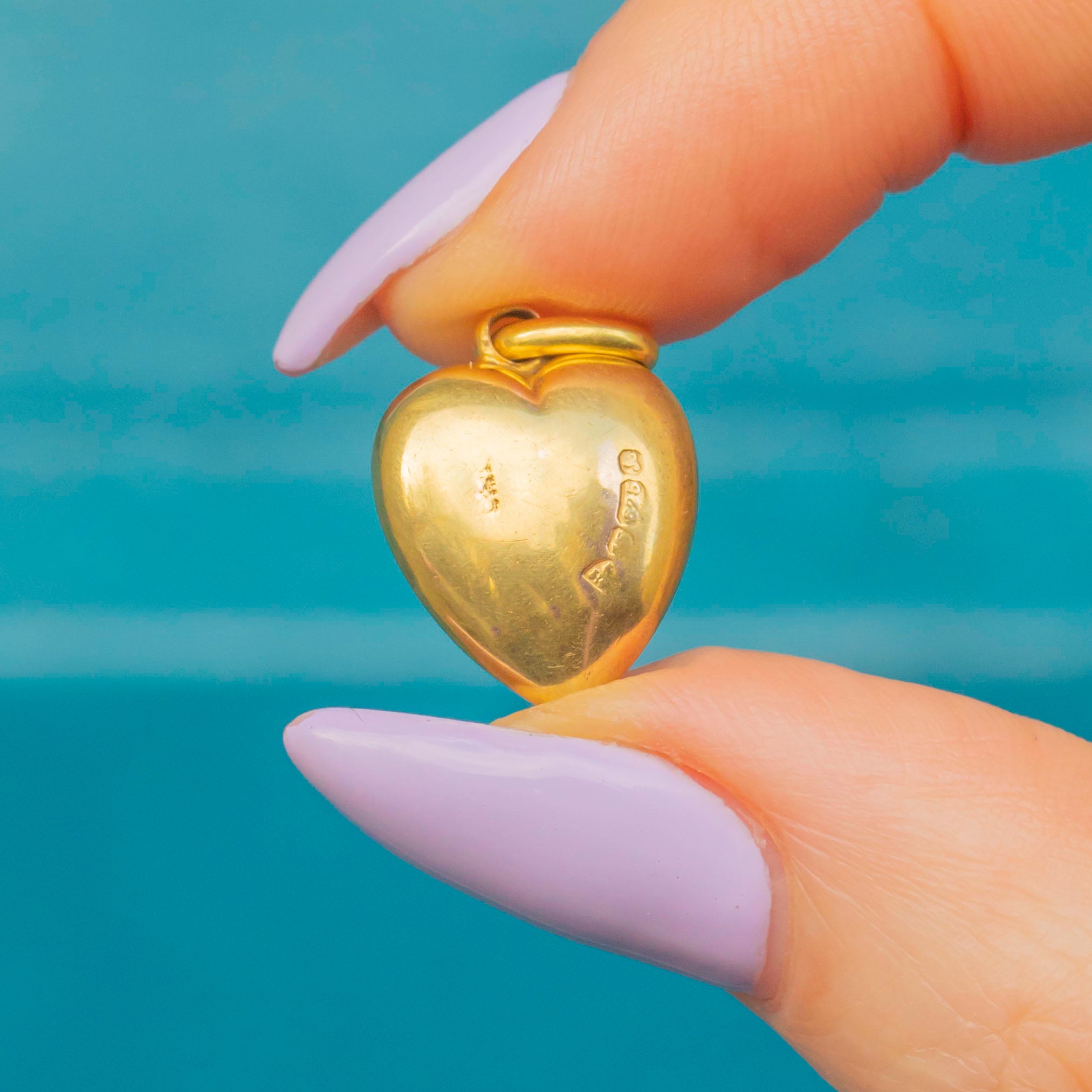 The puffy heart form feels satisfying when you run your fingers across its surface and sits smoothly against the chest when worn. A timeless symbol of love, this antique Gold heart pendant would make the perfect gift choice!
