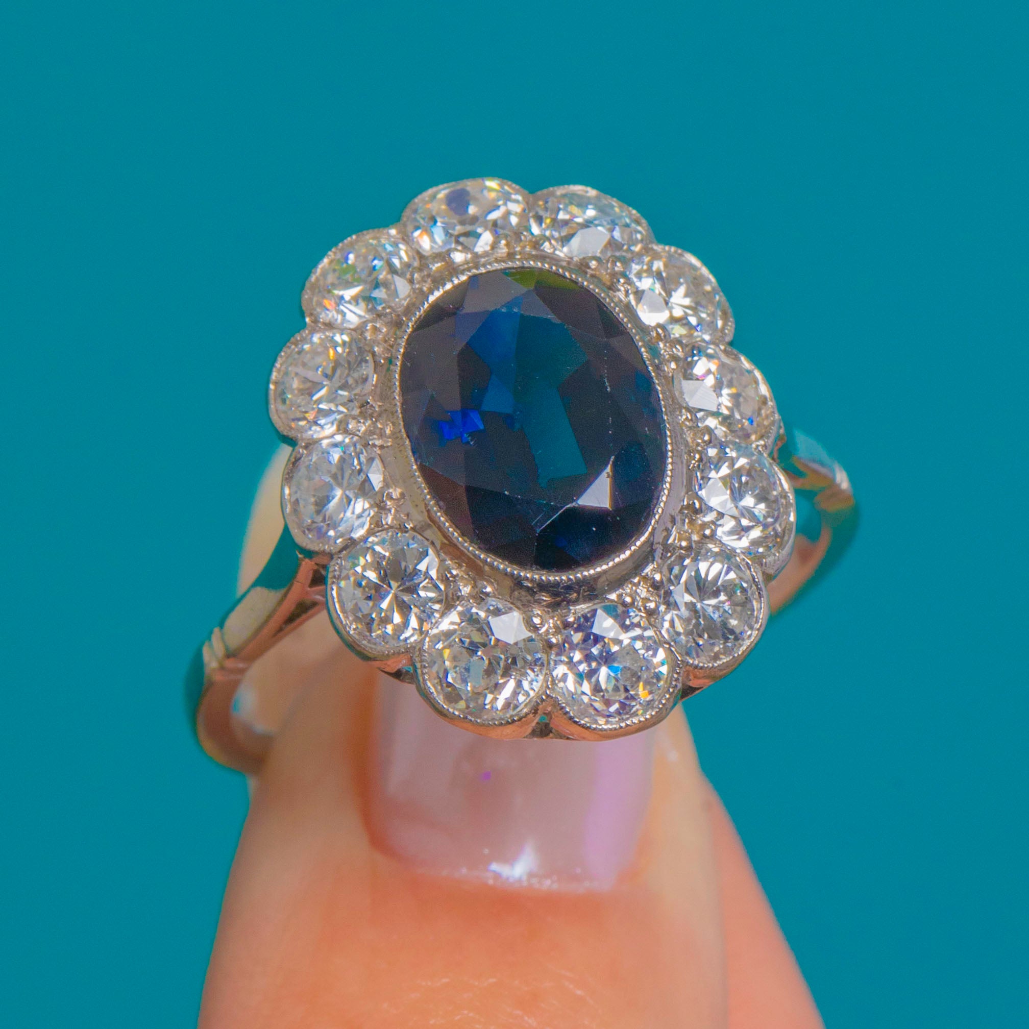 Edwardian 18ct White Gold 2.30ct Natural Sapphire & Diamond Cluster Ring