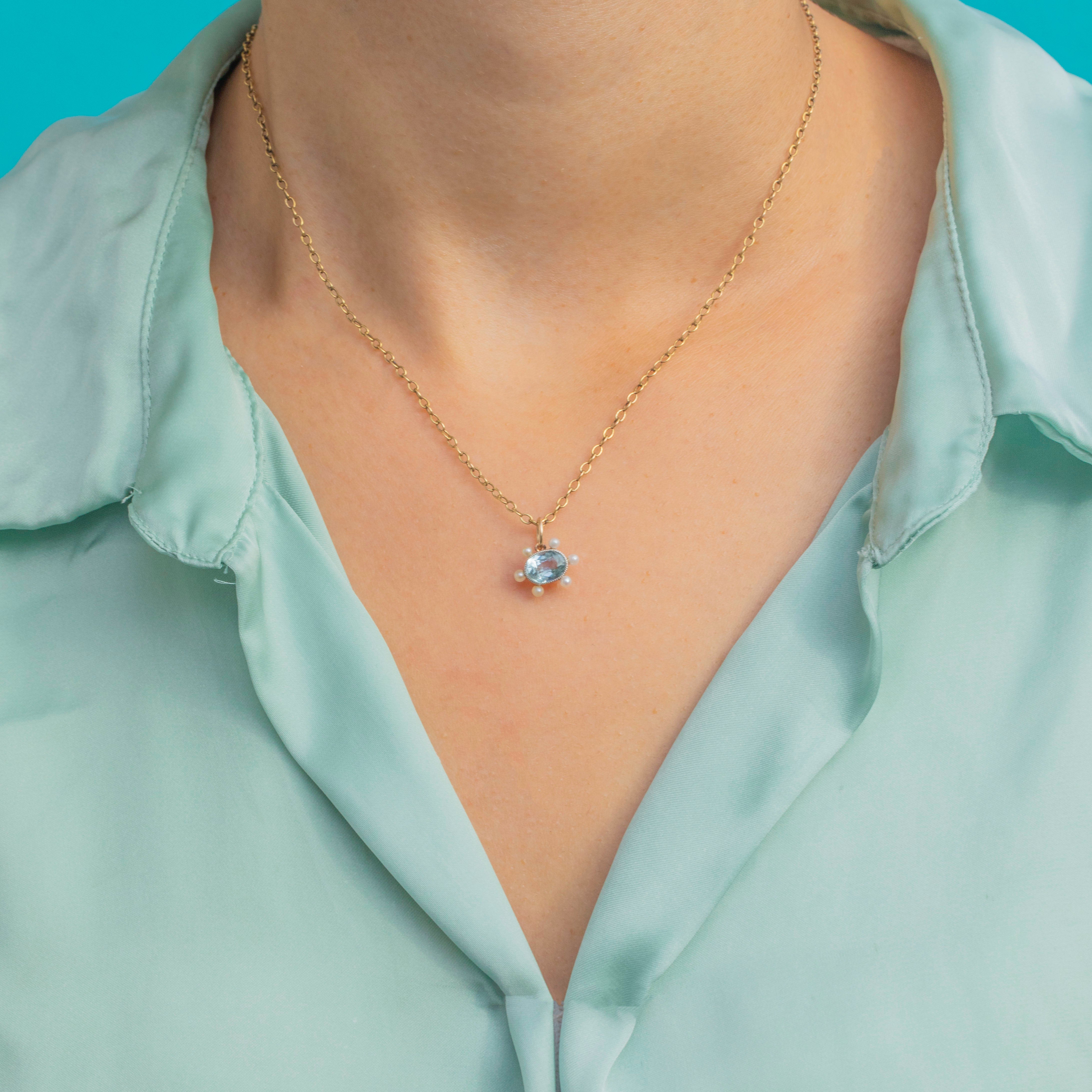 This Edwardian pendant is a charming little treasure, crafted in 9ct Gold and set with a glowing oval Aquamarine framed by creamy Pearls. The Aquamarine weighs approximately 1.78ct, displaying a soft and delicate blue that contrasts beautifully with the warm Gold setting.
