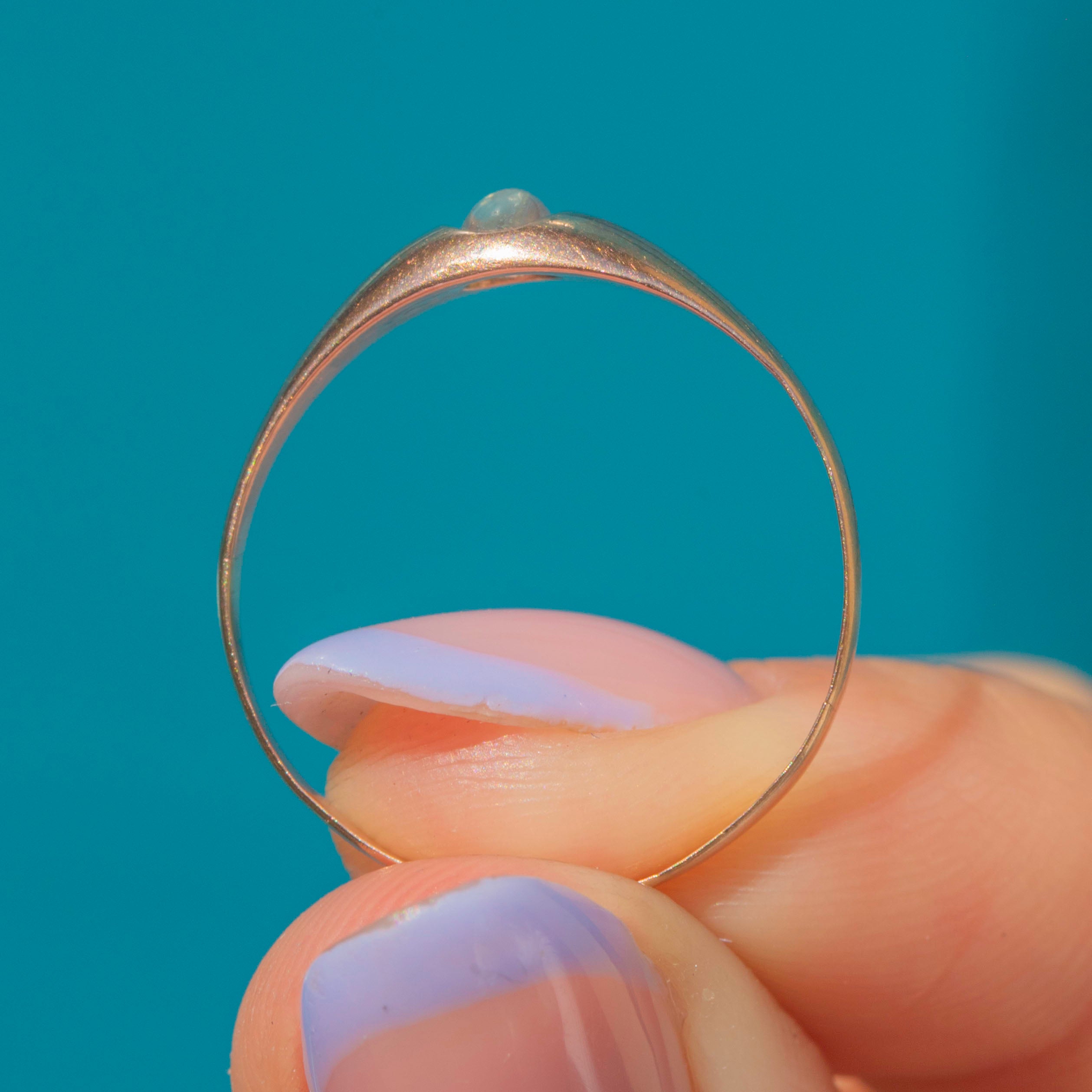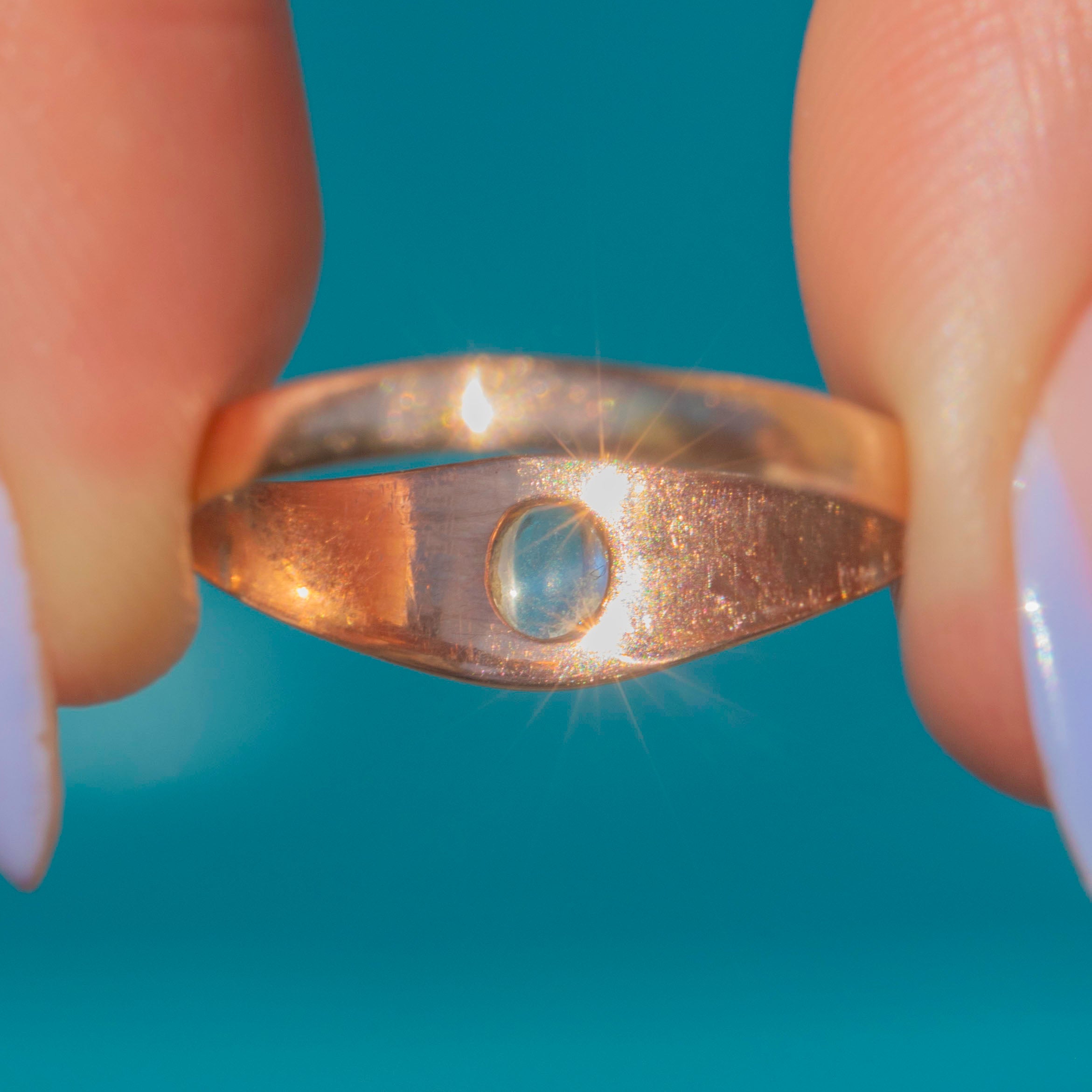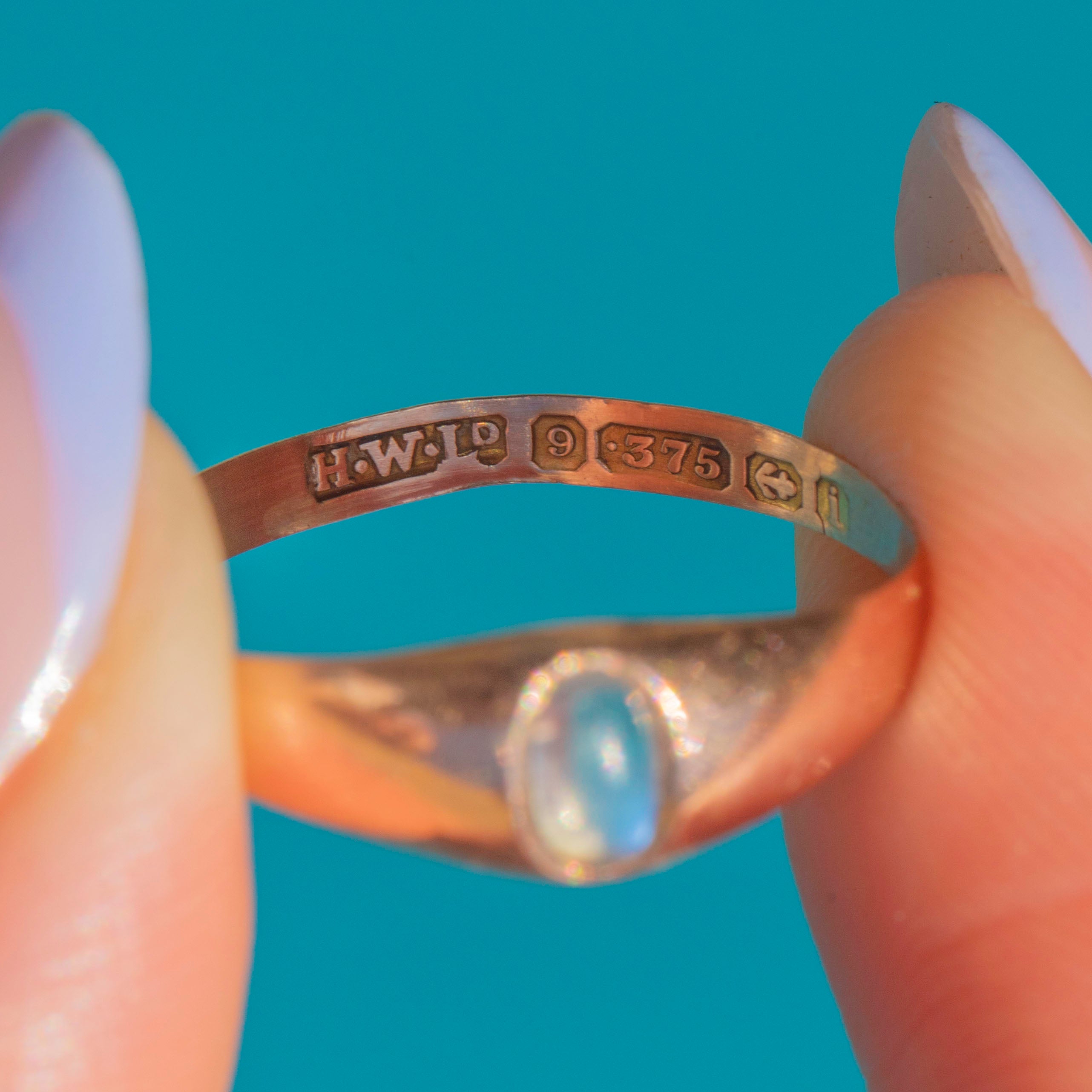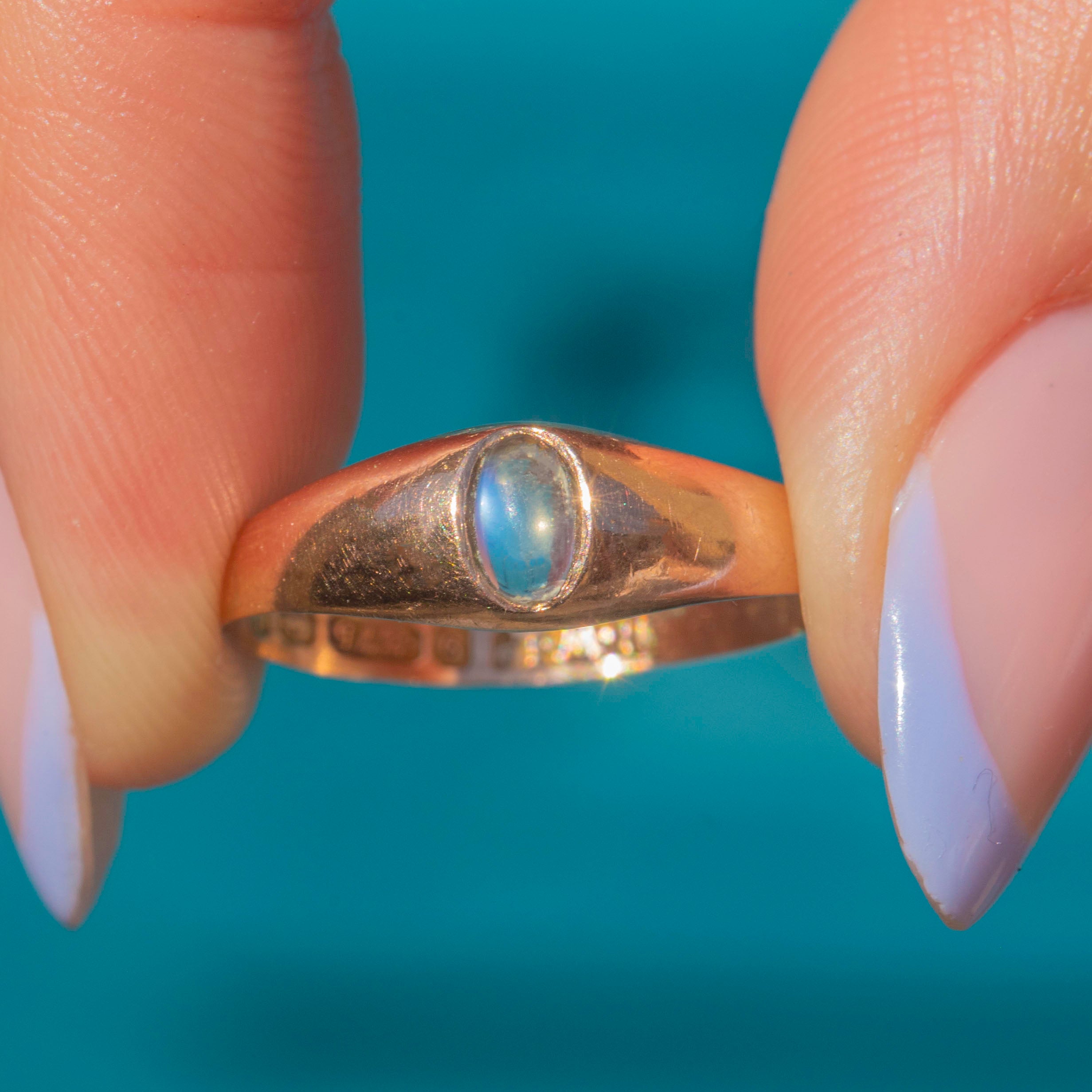 A mystical Edwardian 9ct Gold Ceylon Moonstone solitaire ring for your repertoire! You will become transfixed by the blue schiller that billows across the 0.28ct Moonstone cabochon; this Edwardian ring is one to be admired.