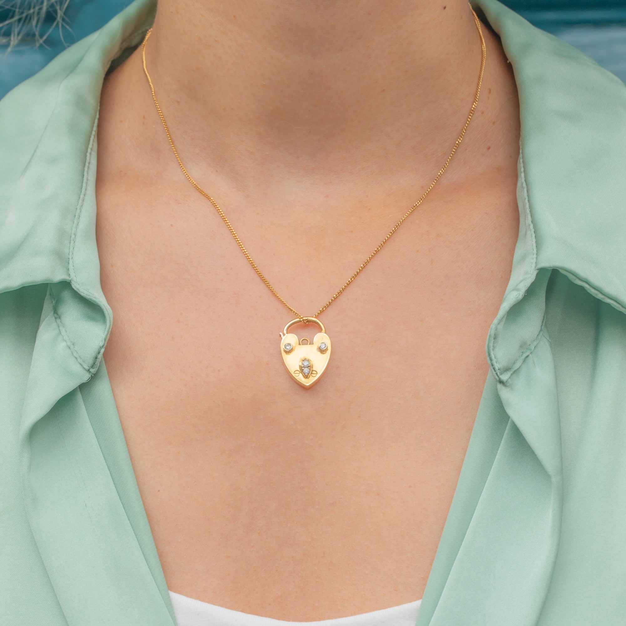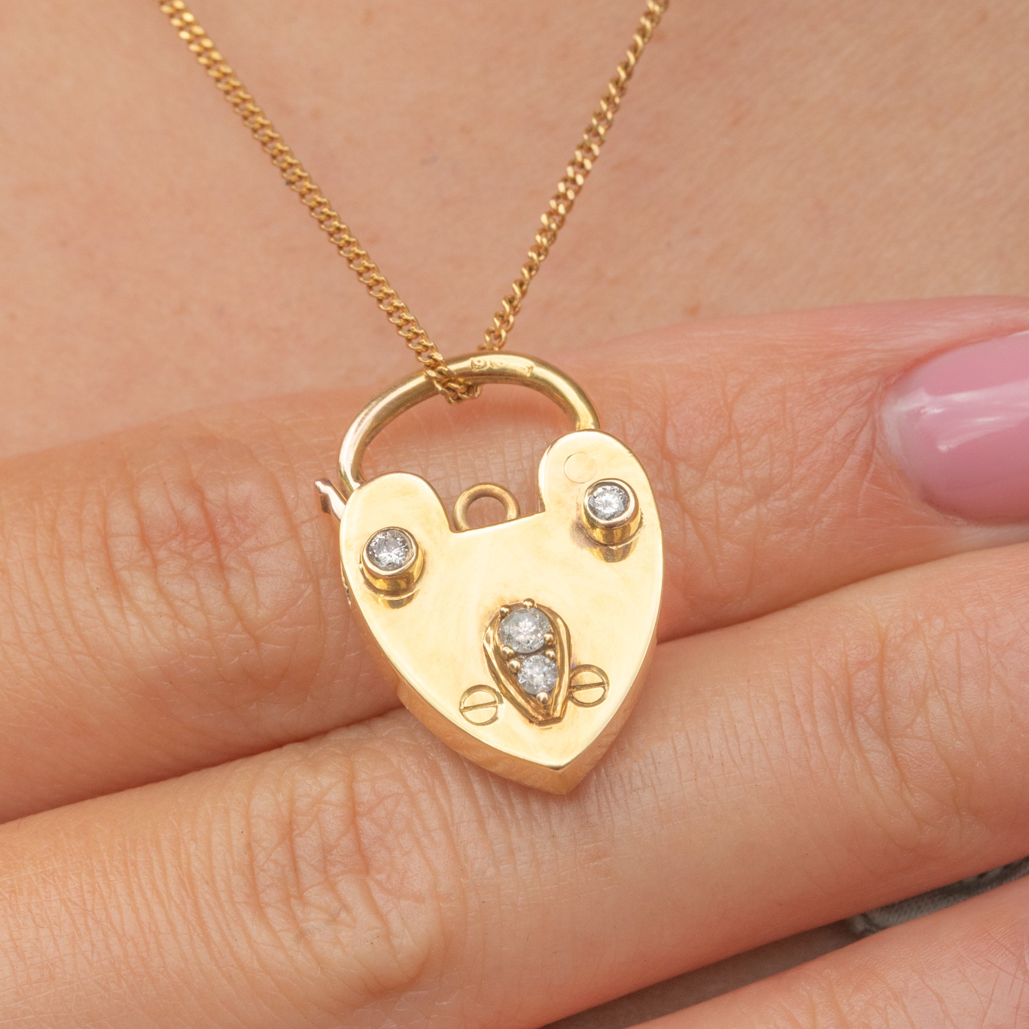 Crafted from bright and glossy 9ct Gold, this antique padlock pendant has been fashioned into an adorable heart motif and is adorned by four scintillating Diamonds, adding a sparkling accent.