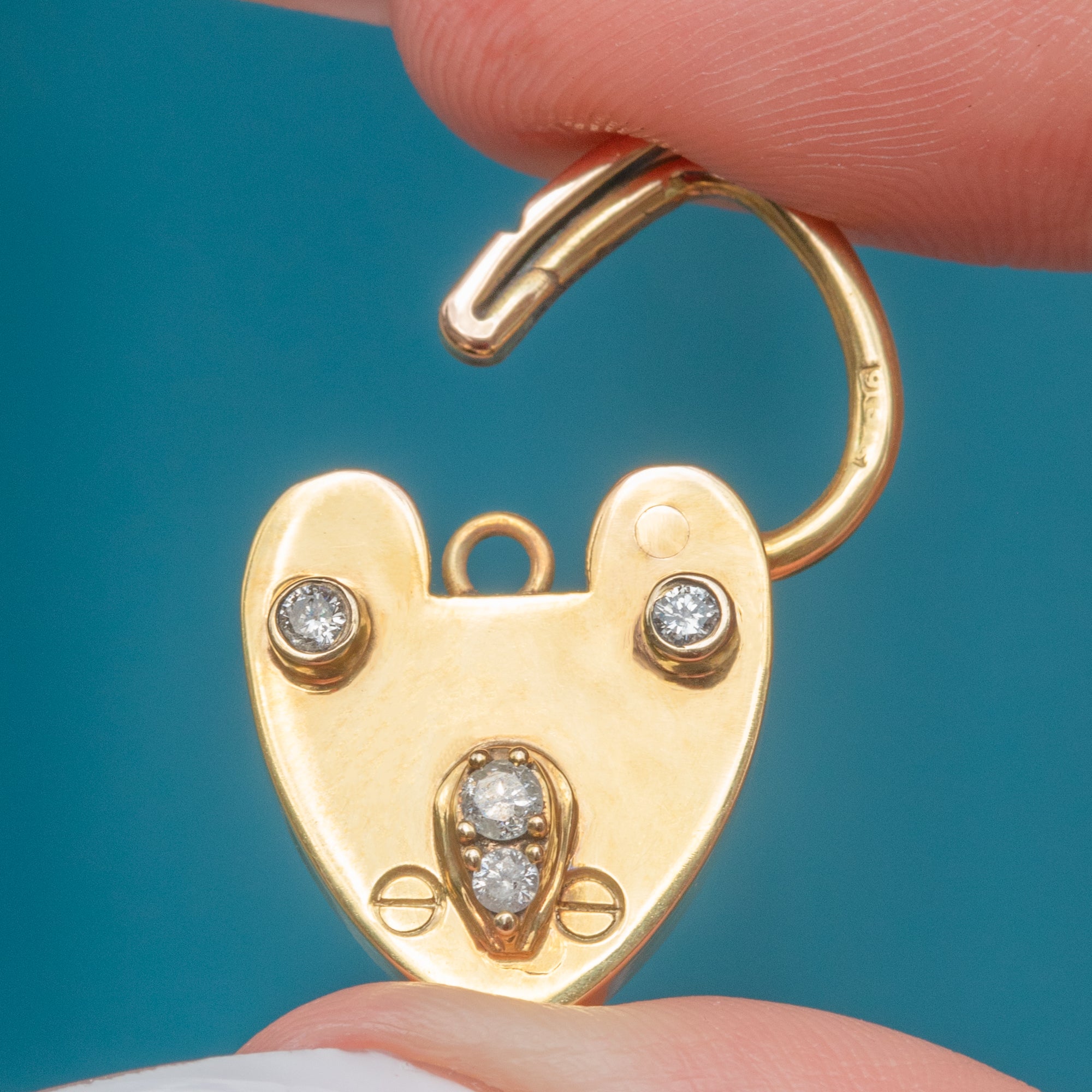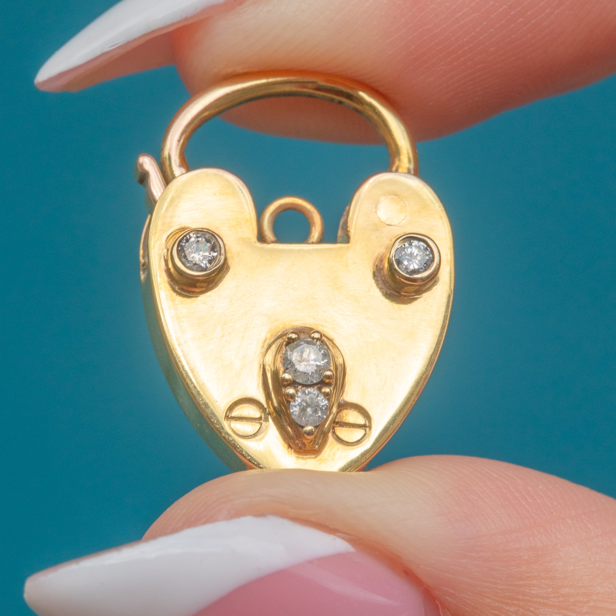 EXCELLENT: This padlock pendant has been crafted wonderfully, with a bright and glossy surface and little signs of wear. The Diamonds are each securely set and the lever is fully functioning, meaning you can wear this Edwardian piece with confidence.