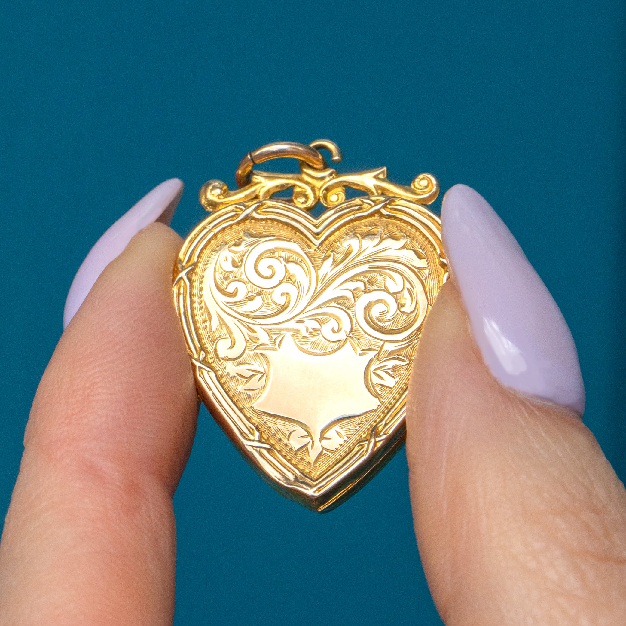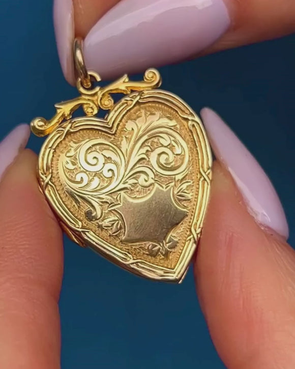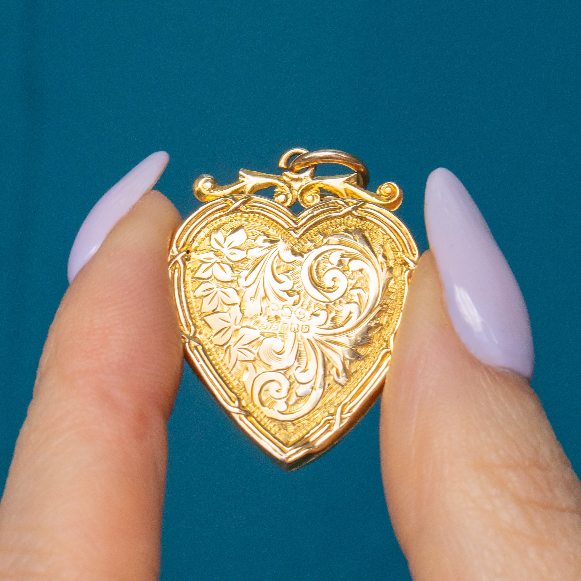How delicious is this Edwardian 9ct Gold engraved heart locket! Engraved acanthus leaves adorn her front and her back boasts ivy leaves, both with a history of romantic symbolism. Crafted from rich 9ct Gold, the light bounces off of her, with a spectrum of sunny hues gleaming from front to back.