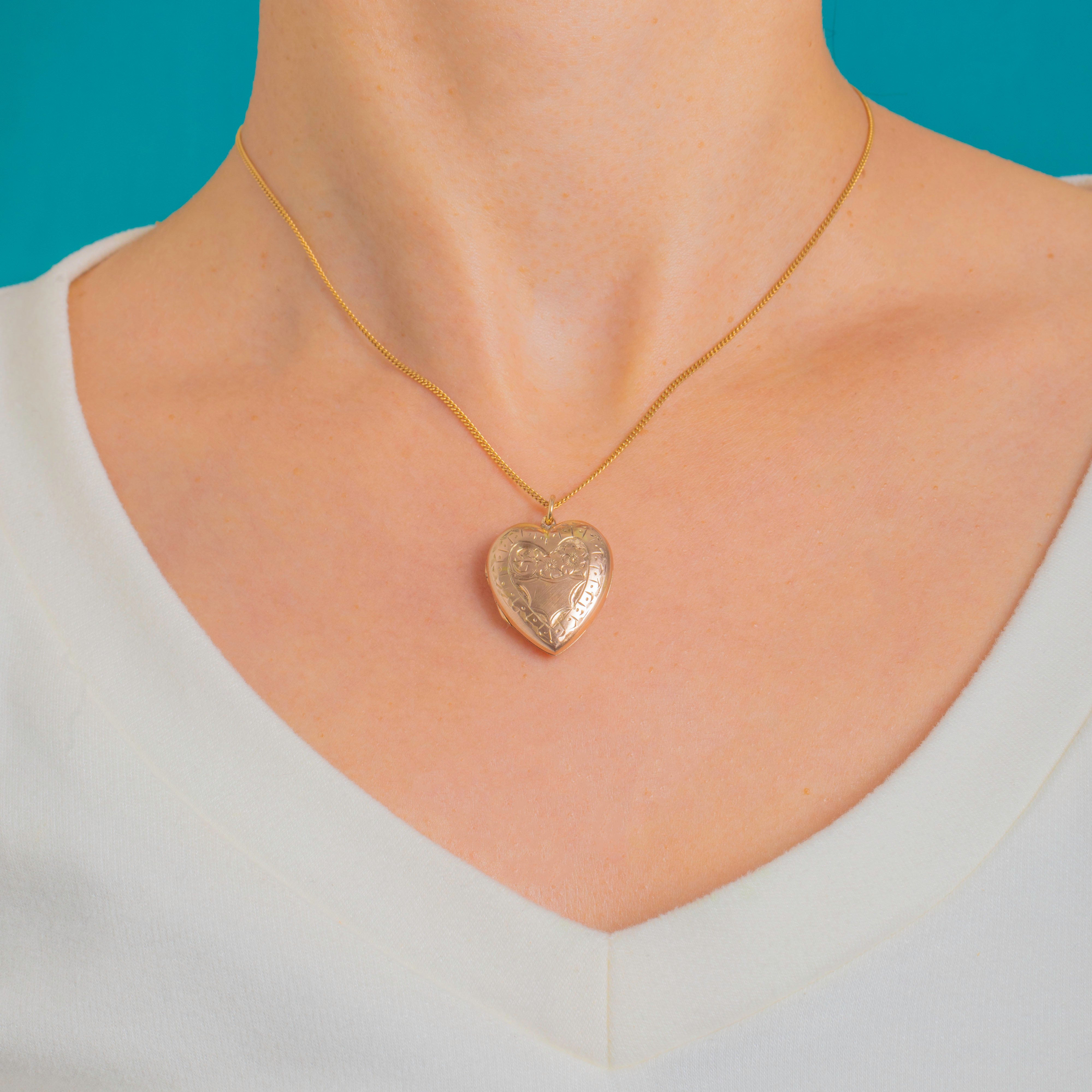 Delicate and sentimental, this Edwardian 9ct Gold heart locket is adorned with finely engraved foliate scrolls, a shield cartouche and a neat punched‑dot border. The warm Gold glows beautifully against the crisp detailing, with the plain cartouche providing a refined focal point.
