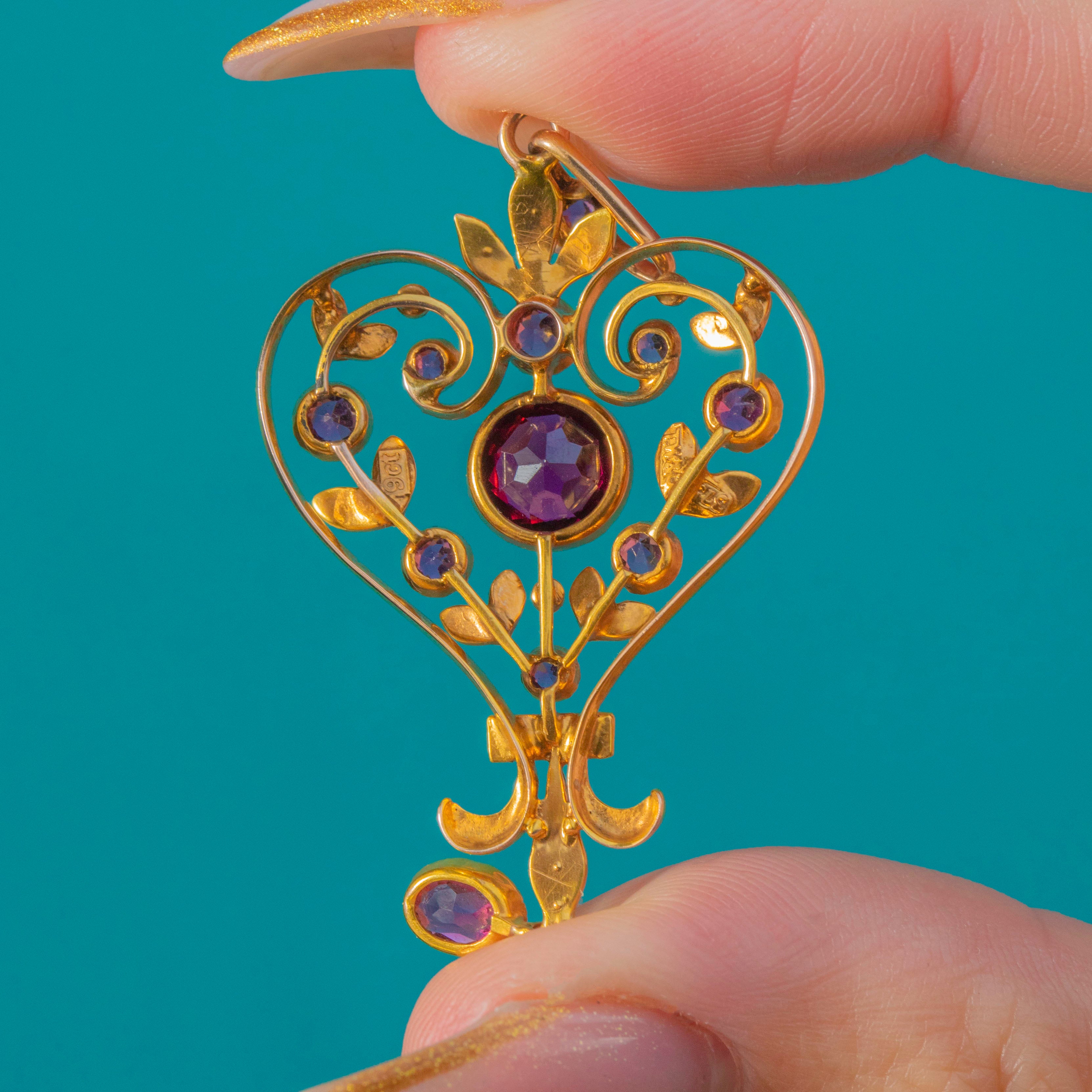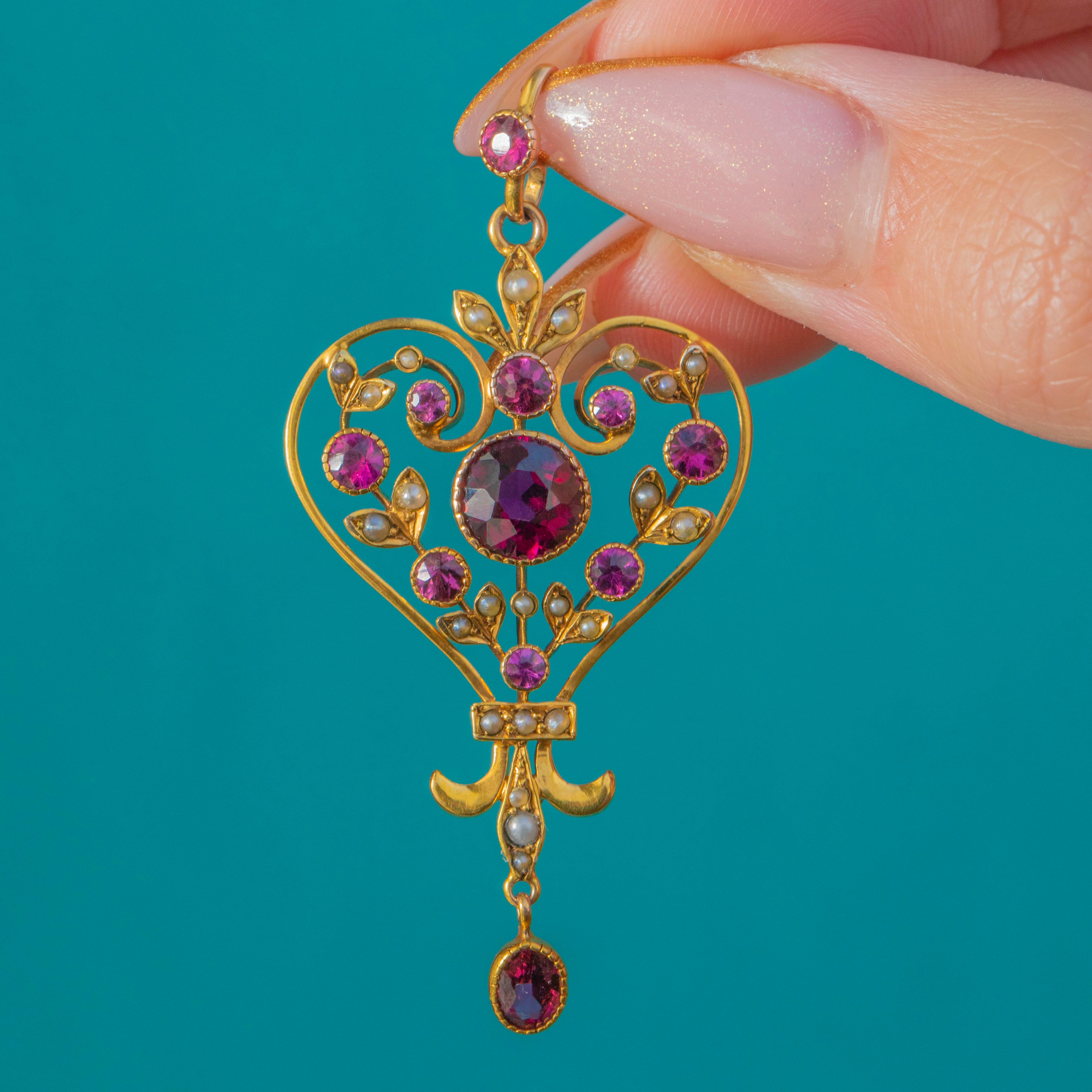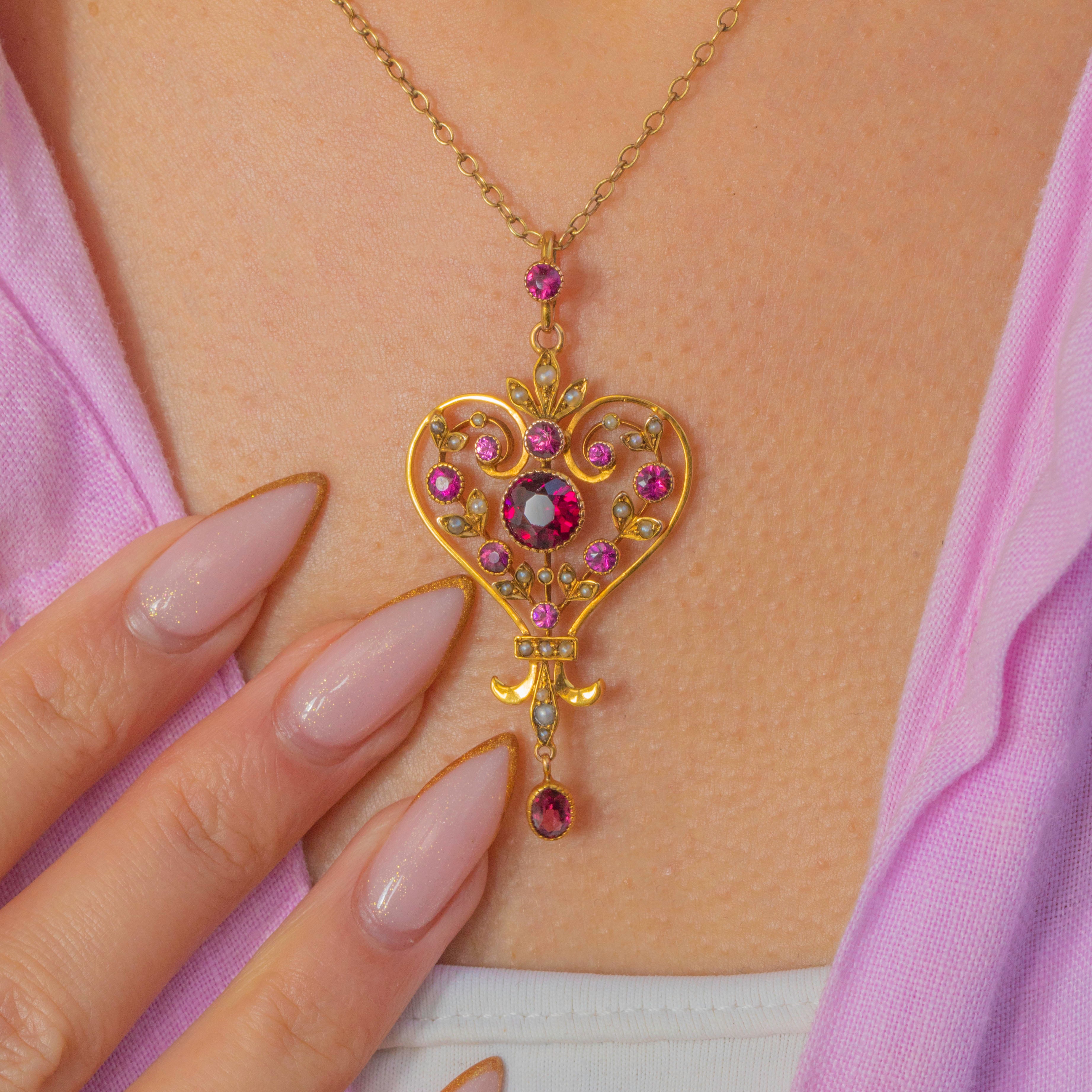 This exquisite Edwardian heart pendant is a romantic statement of colour and craftsmanship. Crafted in warm 9ct Gold, it features a beautifully ornate openwork design set with glowing Garnets and delicate natural Pearls. The central Garnet brings a rich, deep red sparkle, while the surrounding stones add rhythm, symmetry and movement in true Edwardian style.