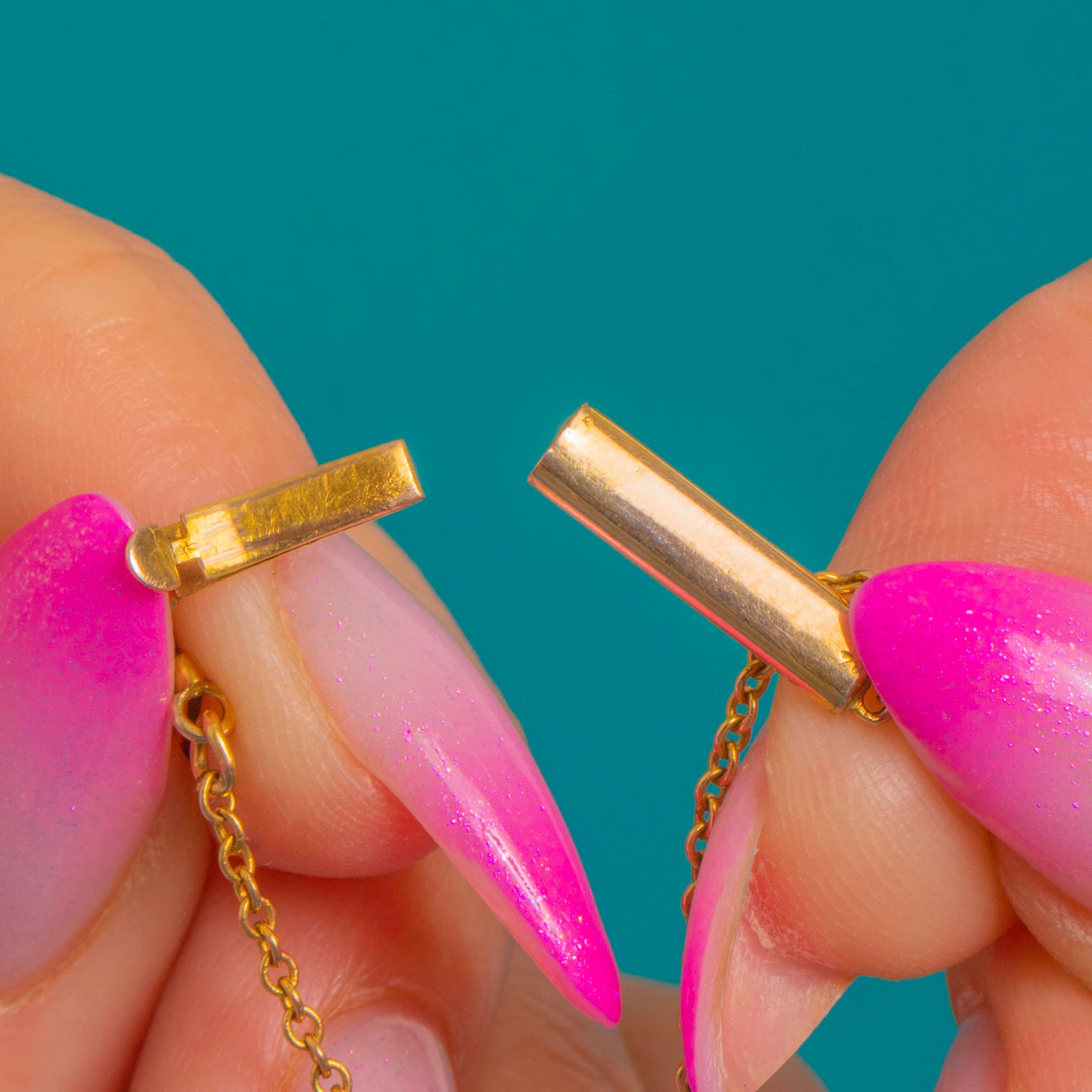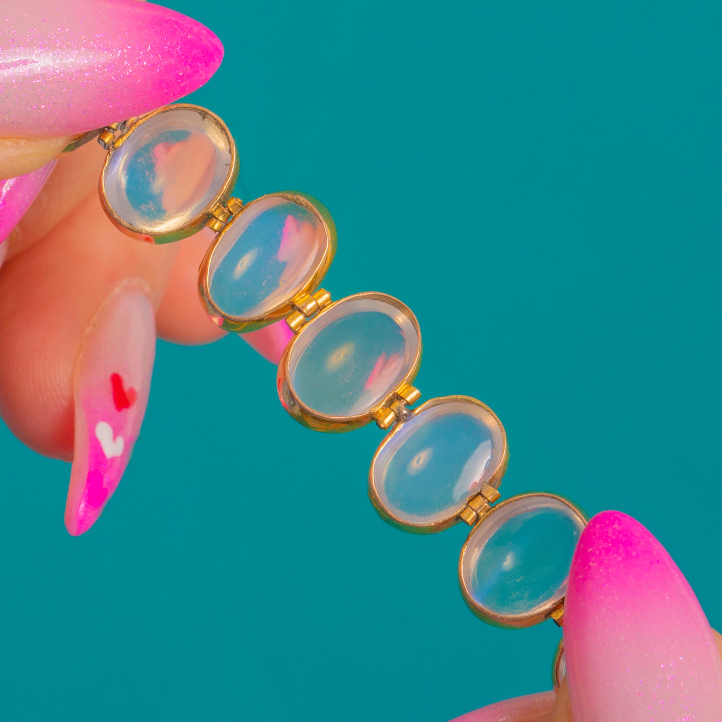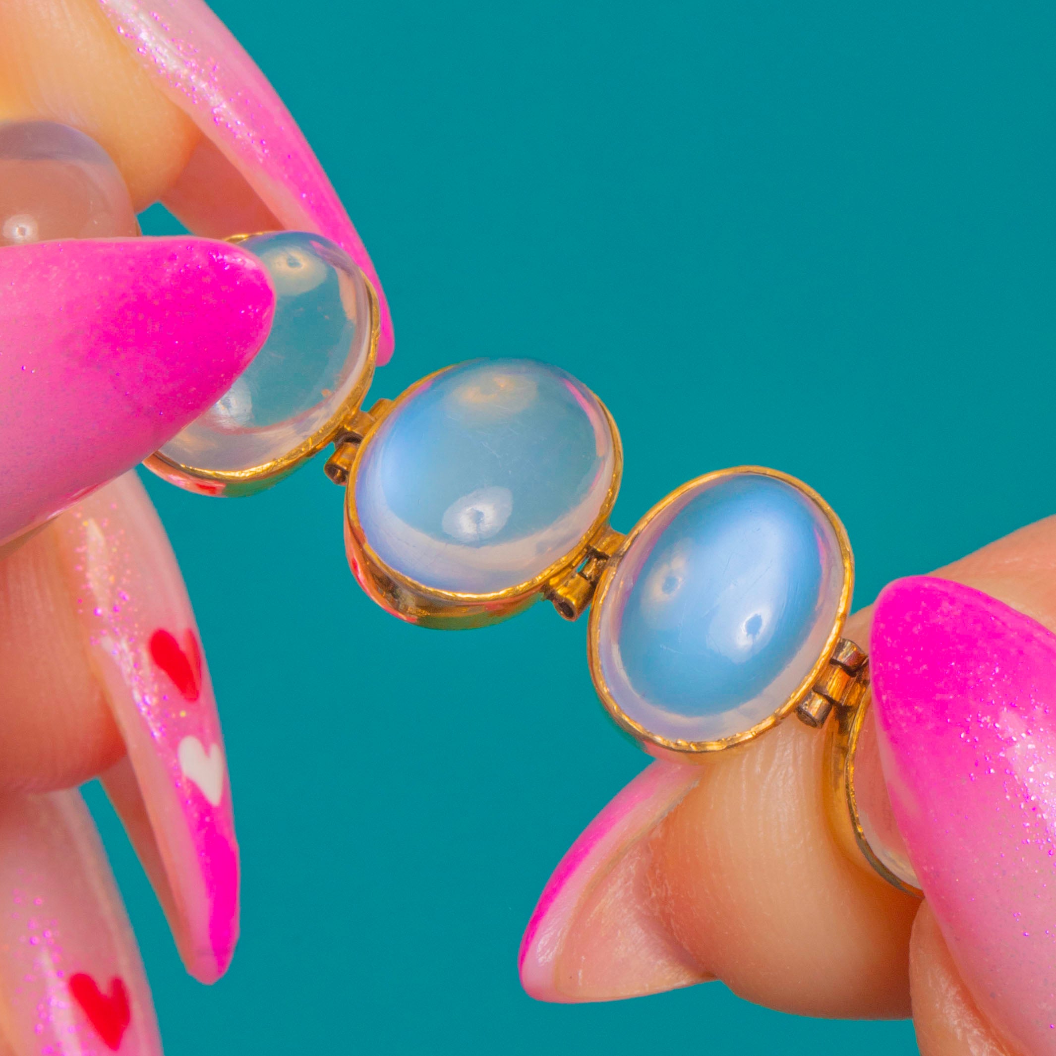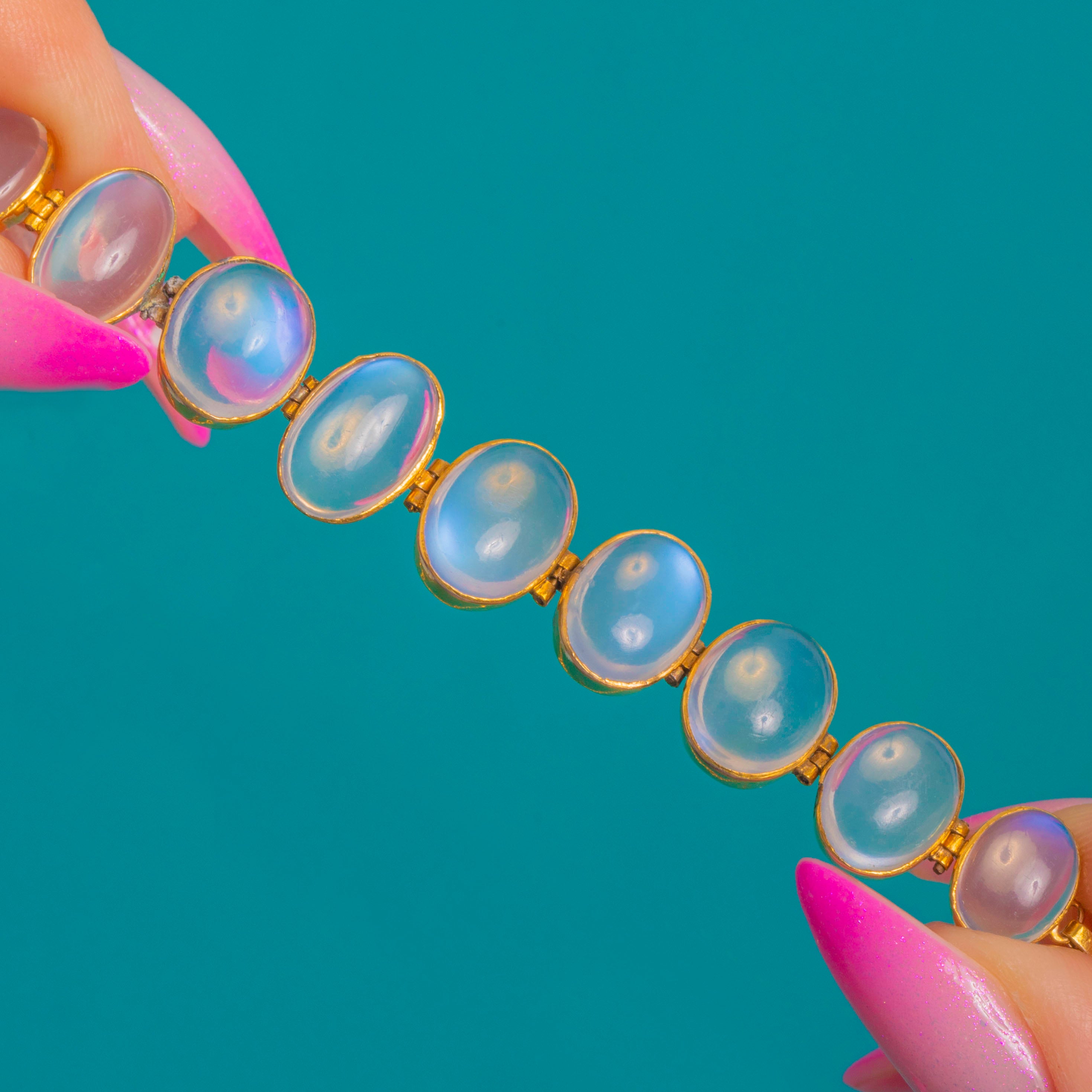 Ethereal and elegant, this Edwardian Moonstone bracelet glows with that unmistakable adularescent sheen. A luminous row of oval cabochon Moonstones (6.60ct combined) is bezel-set in 9ct Gold, their milky translucency and blue flashes creating a soft, celestial light across the wrist.