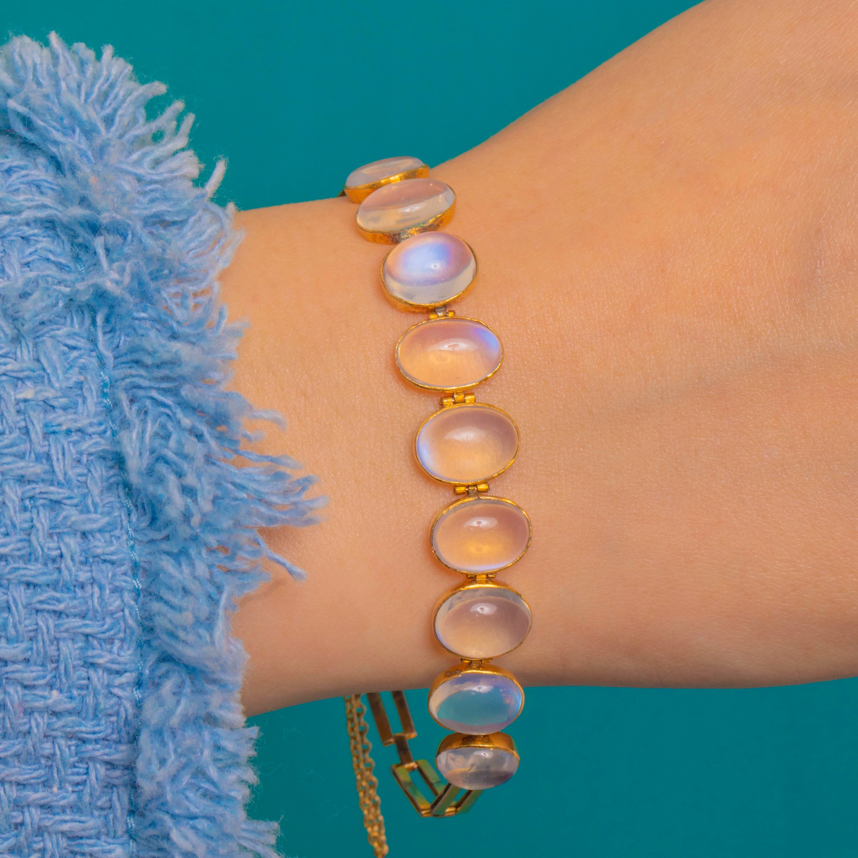 Articulated with small hinged connectors for a graceful drape, the bracelet fastens with a neat box clasp and a short safety chain for peace of mind. Understated and refined, it’s a timeless line of Moonstone magic to wear every day or elevate an evening look.