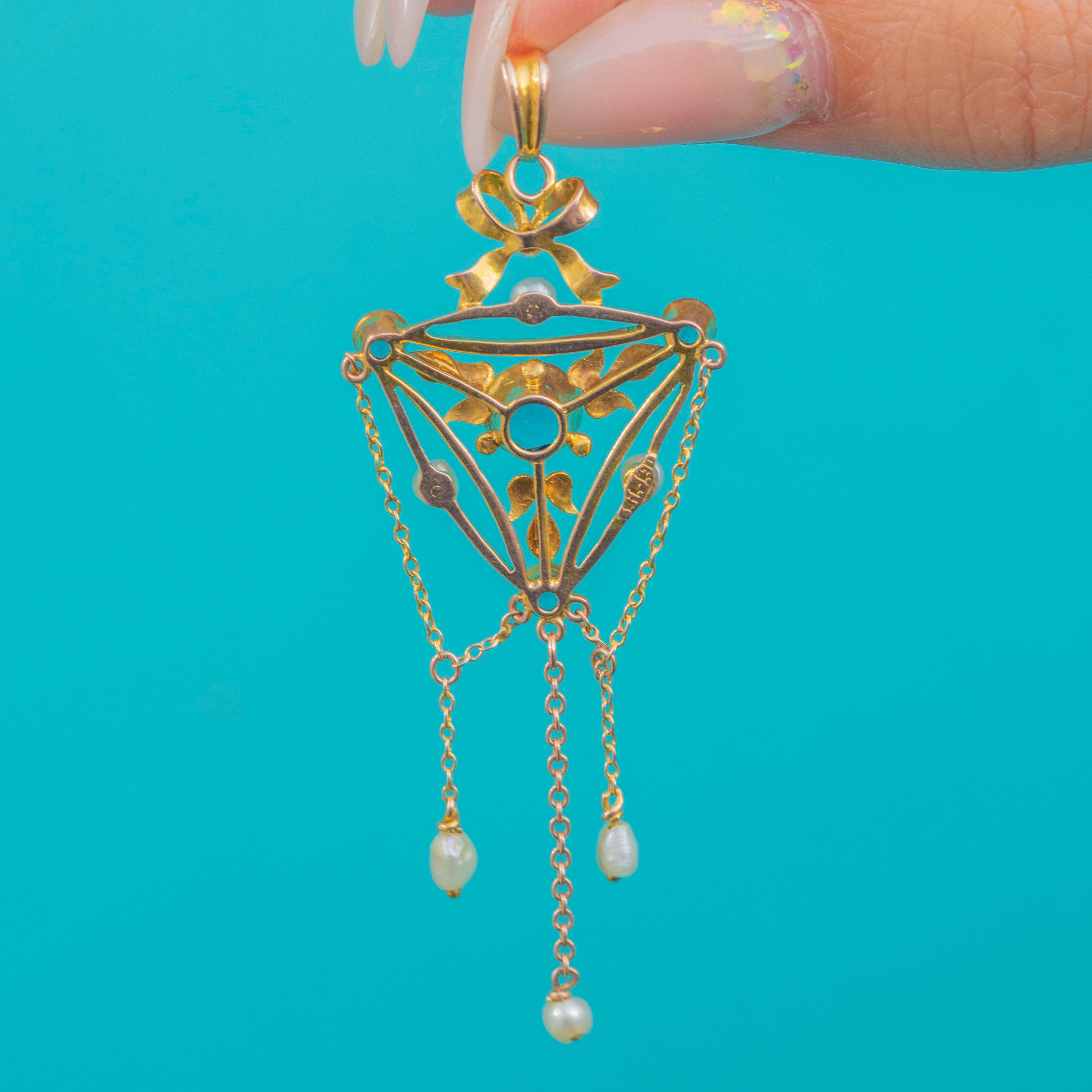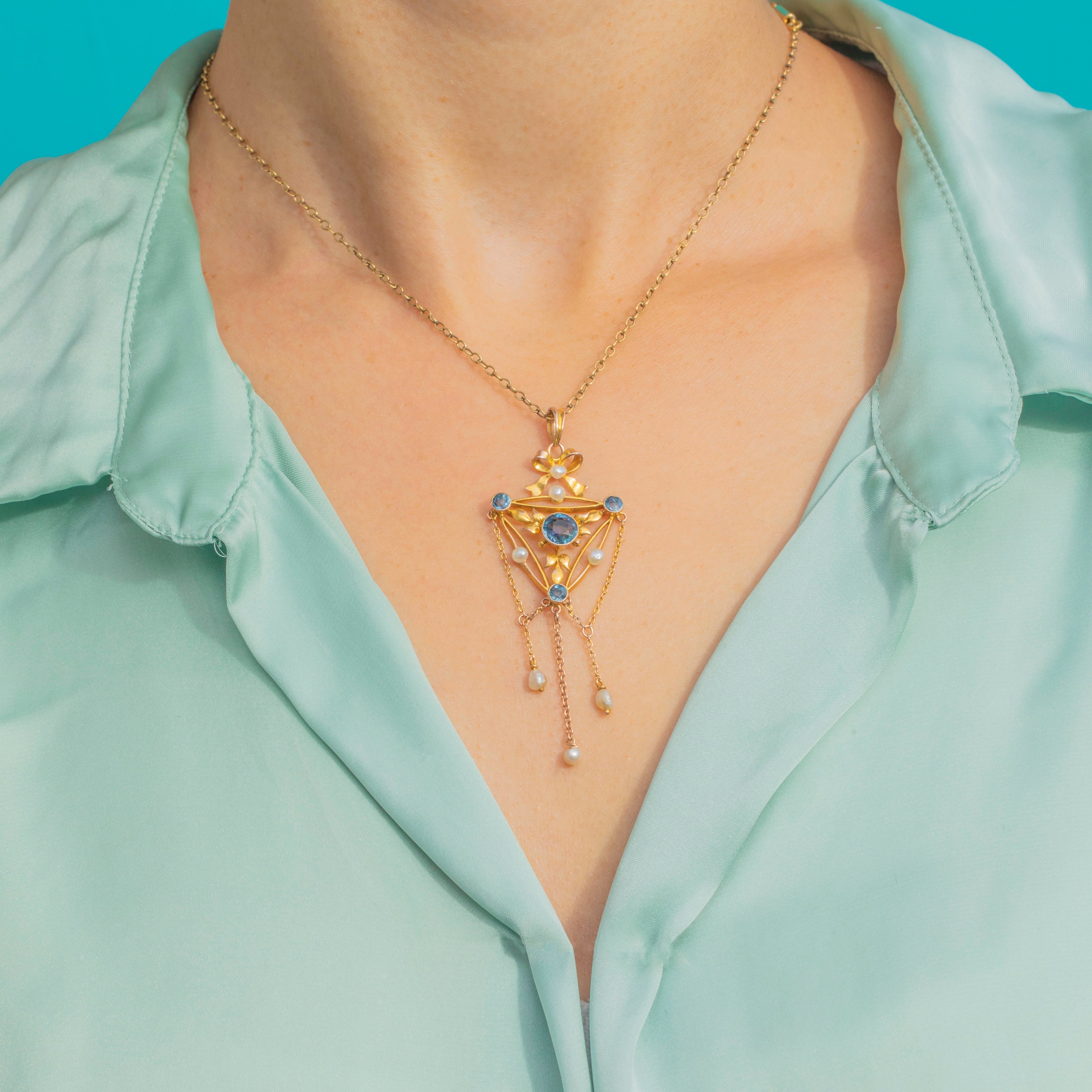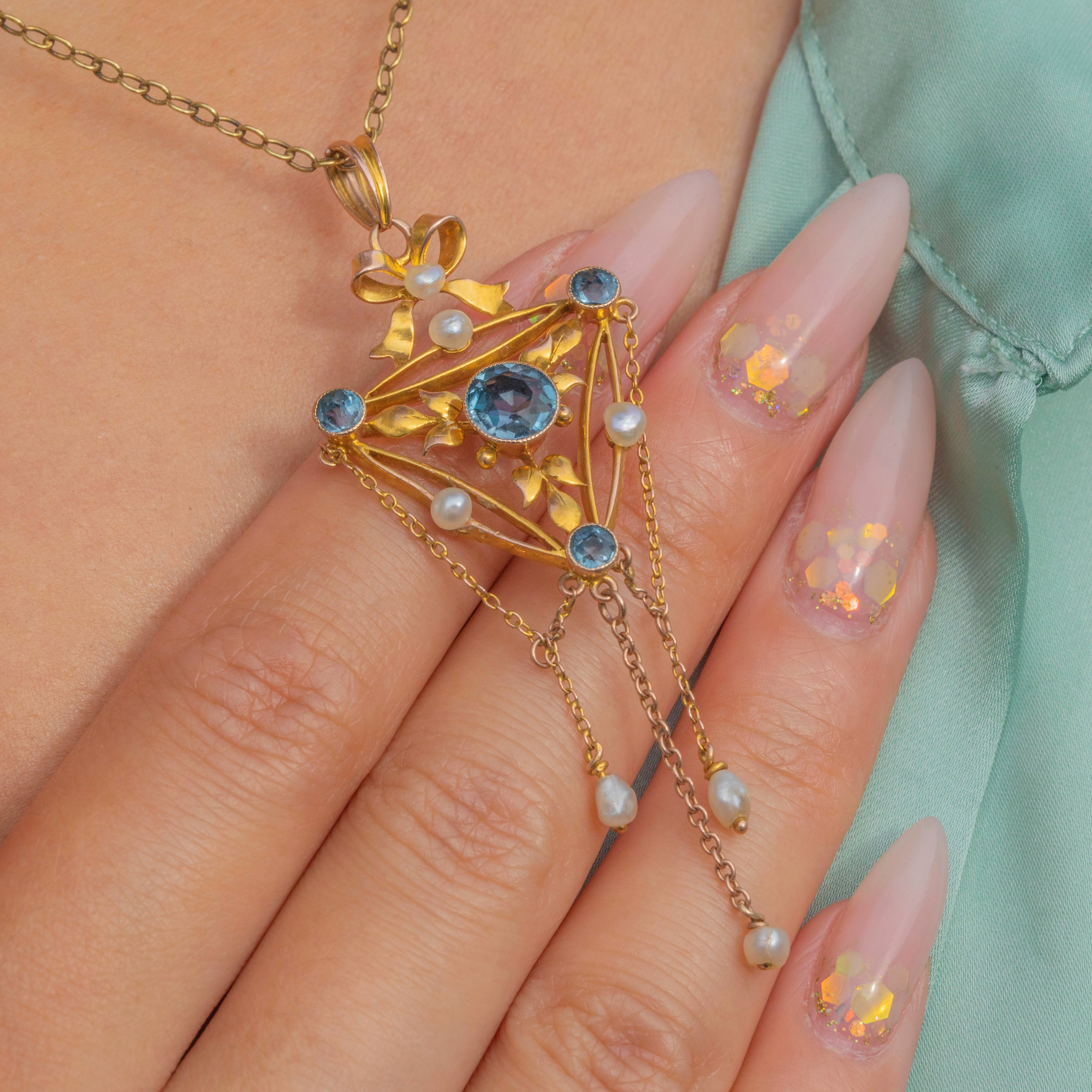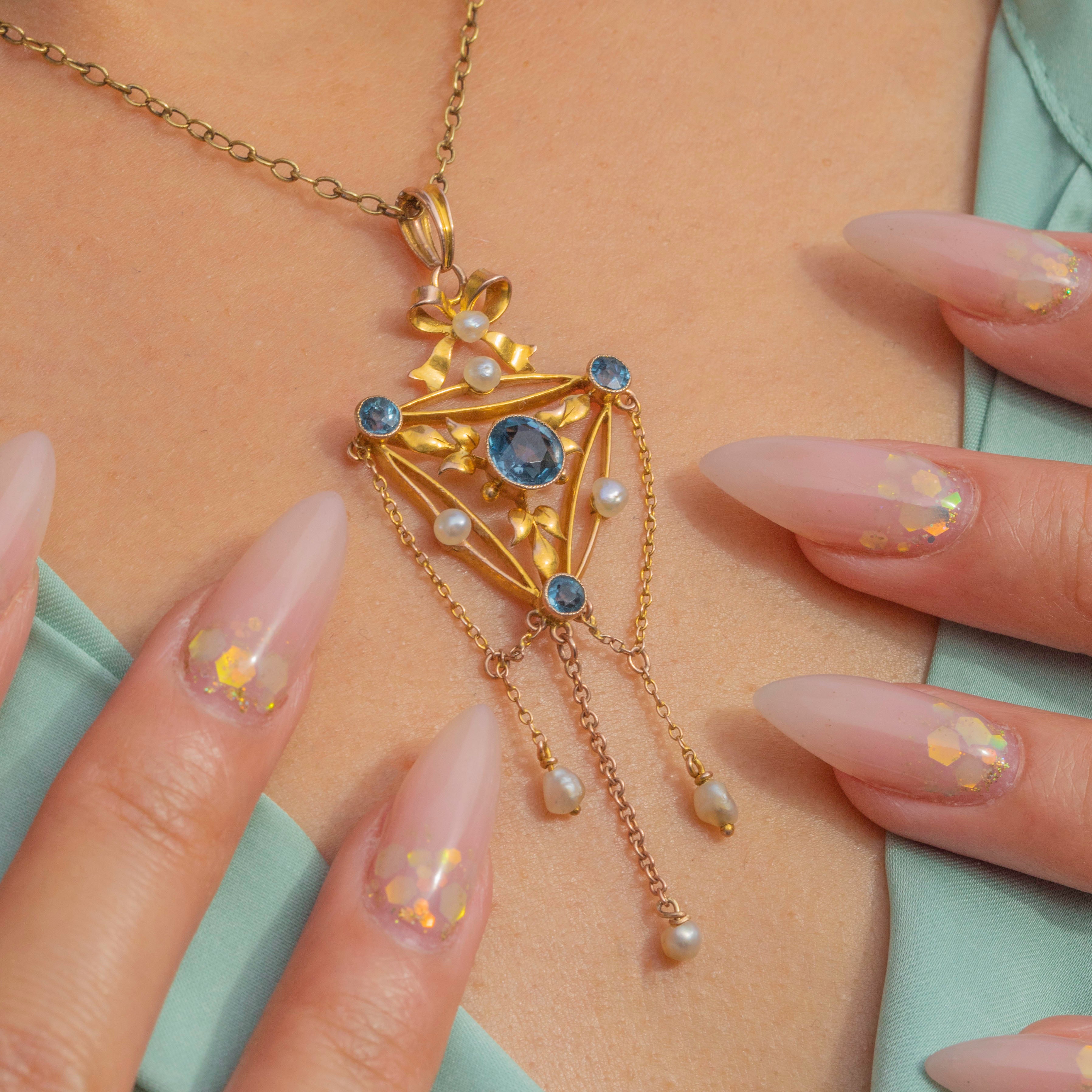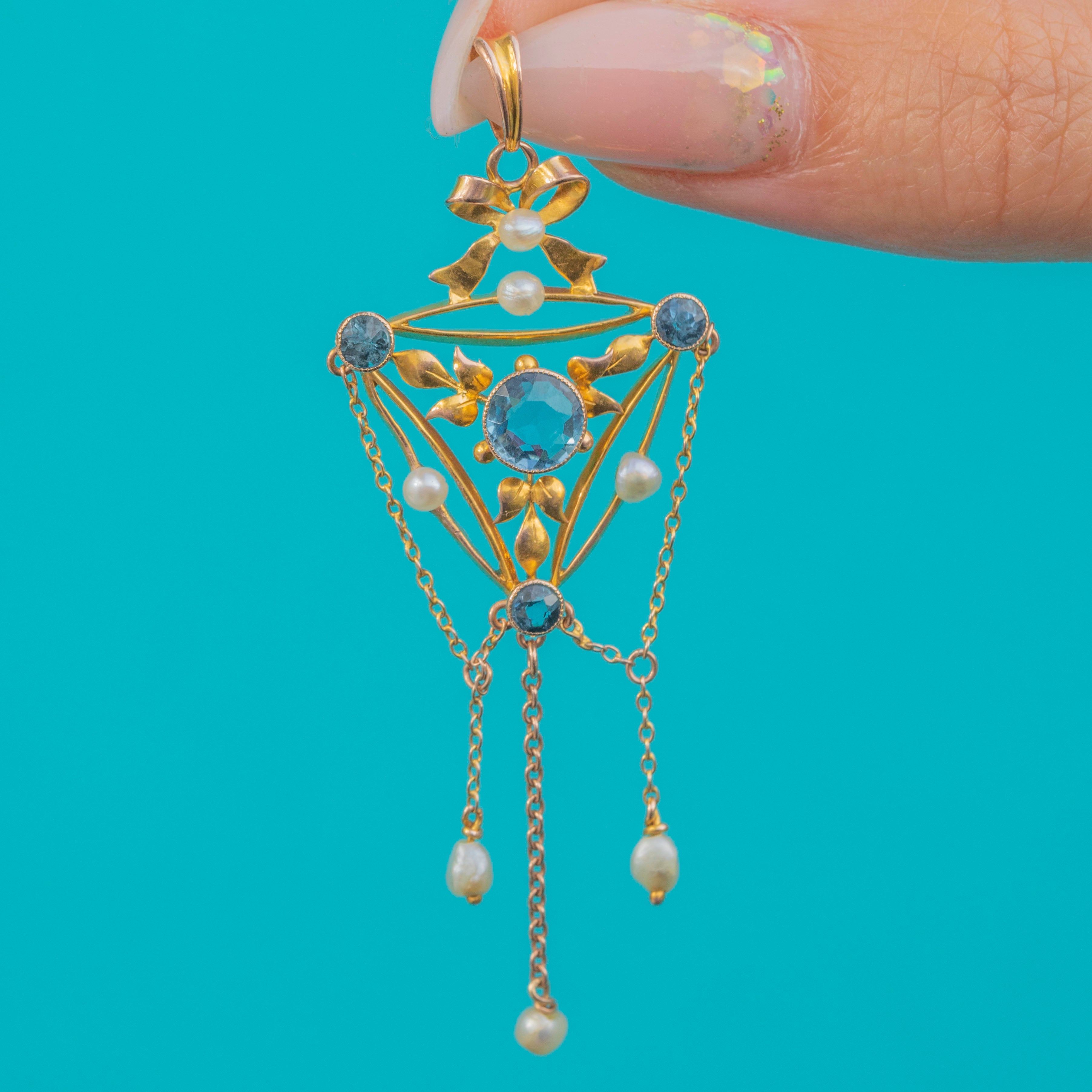 This beautiful Edwardian pendant has all the grace and elegance of the era. Crafted in 9ct Gold, the design centres on a delicate bow motif, set with lustrous Pearls and sparkling blue Paste gemstones. The openwork frame is adorned with foliate details, with dainty chains suspended from the base, each ending with a natural Pearl drop that sways gently with movement.